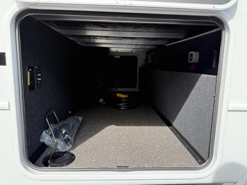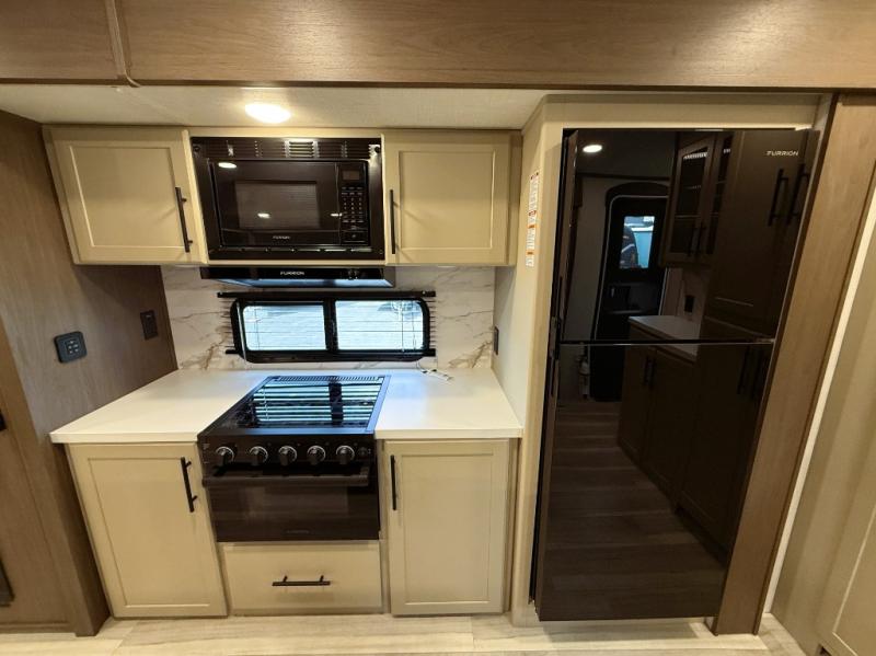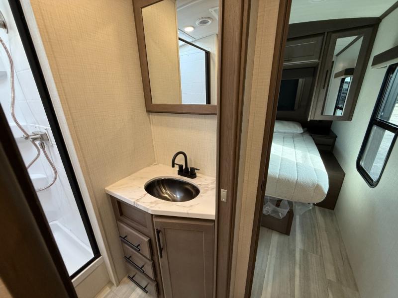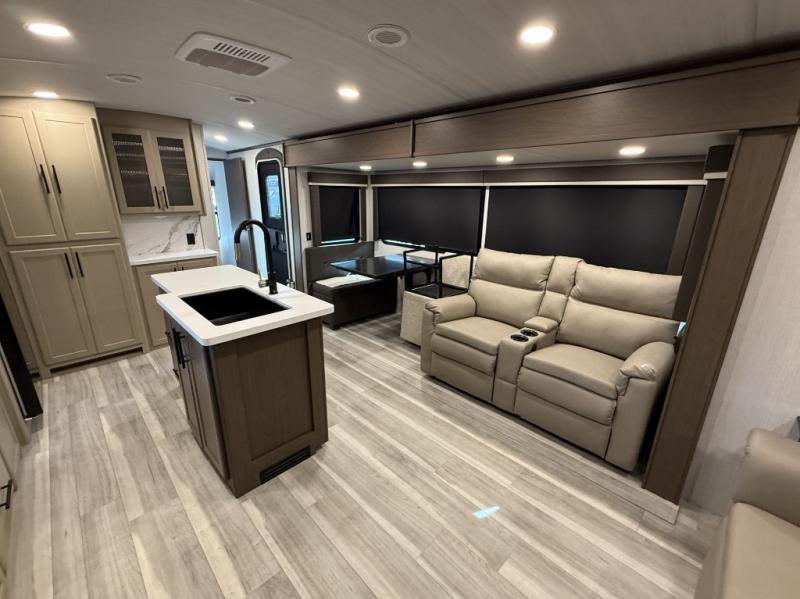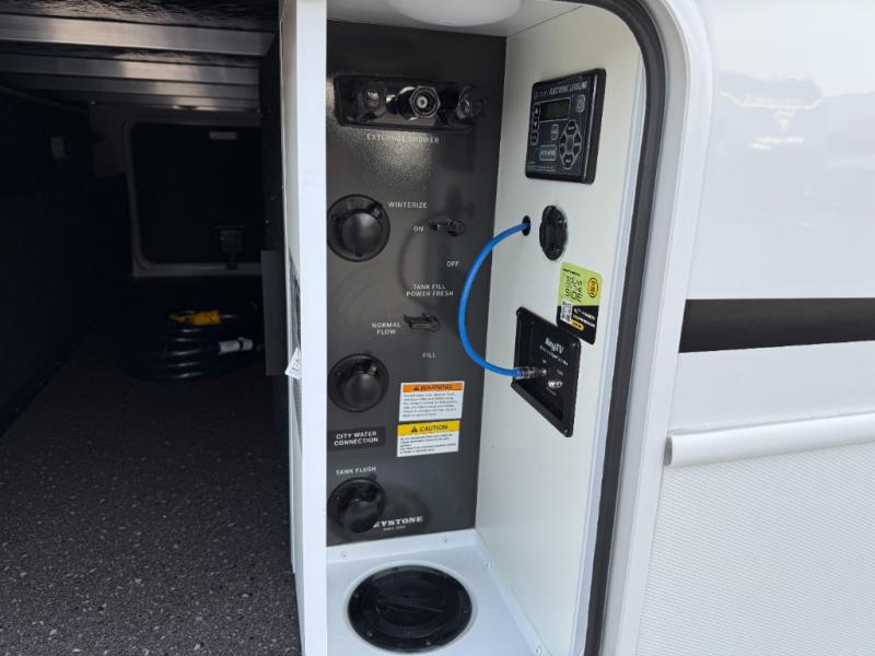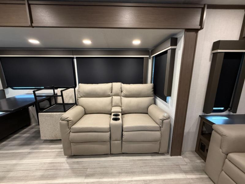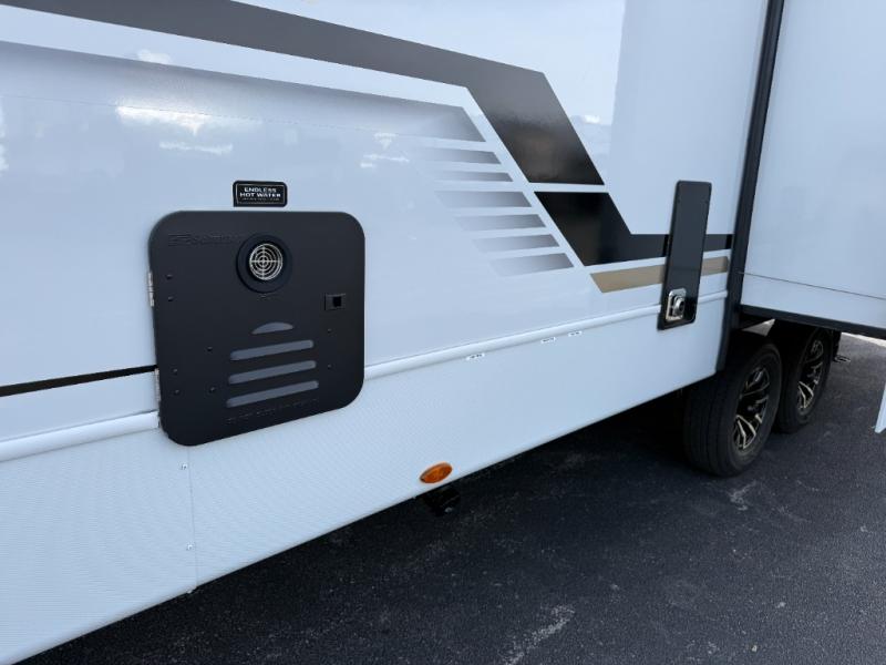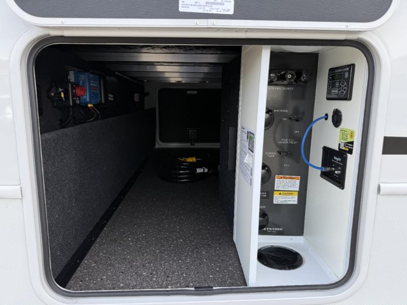 Trips spent in this travel trailer are sure to bring memories! The dual opposing slides in the combined kitchen and living area provide your crew with plenty of space to relax on the theater seating, dine at the dinette table, and prep meals with the kitchen island. There is also a tri-fold sleeper sofa here for guests and a pivoting entertainment center with a hidden pantry to keep snacks stocked. And a second pantry and hutch provides even more storage! You'll love having your own private bedroom up front, complete with a king bed, dual bedside drawers and nightstands and additional storage drawers to keep your space tidy. Outside, you'll find two power awnings, a 2" accessory hitch, and a drop frame pass-thru storage for fishing poles, hiking gear, and more!