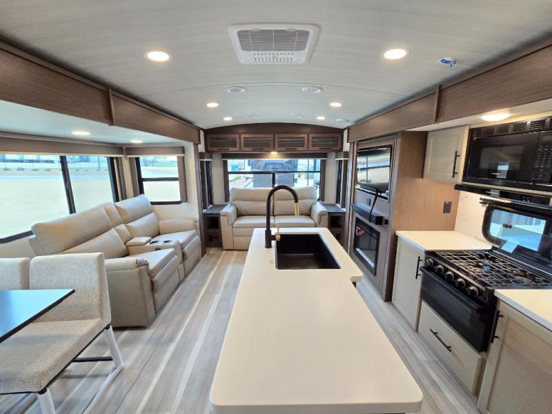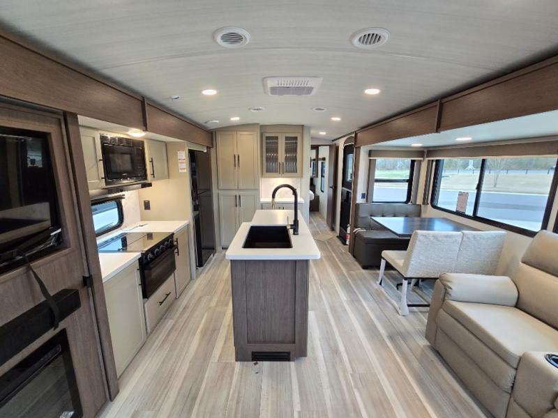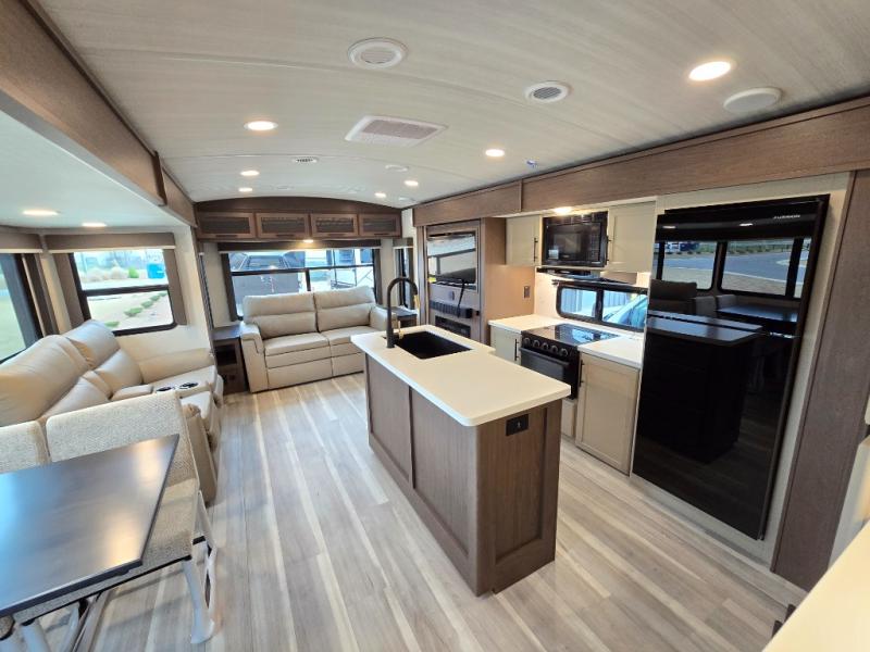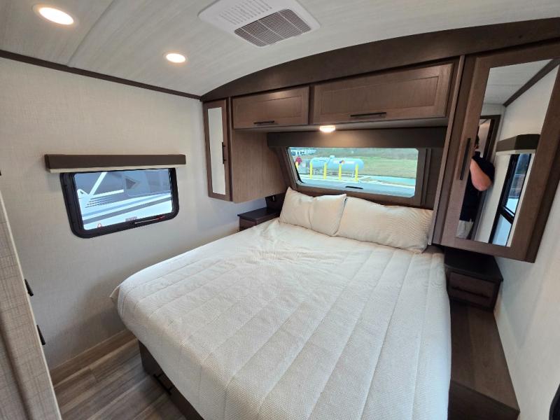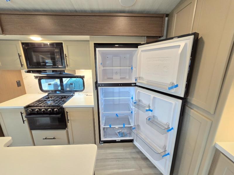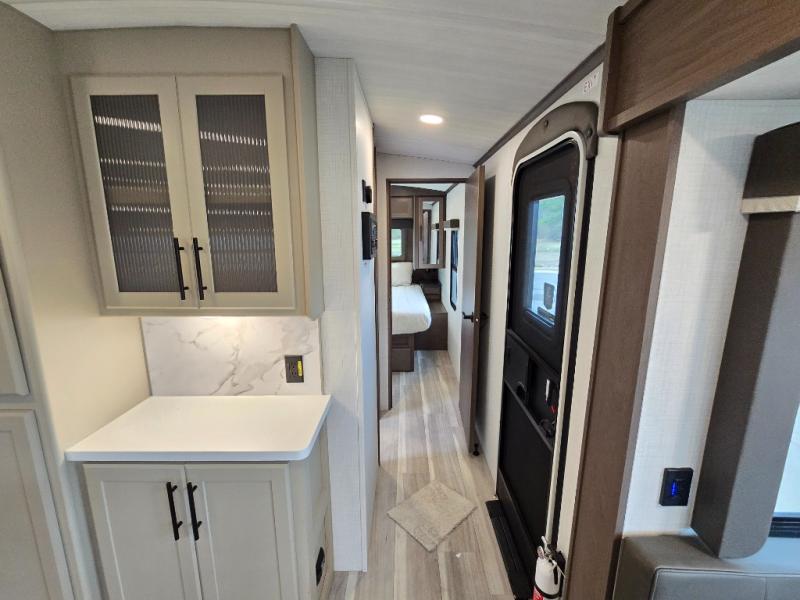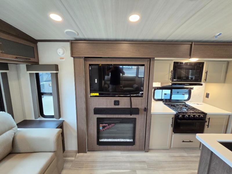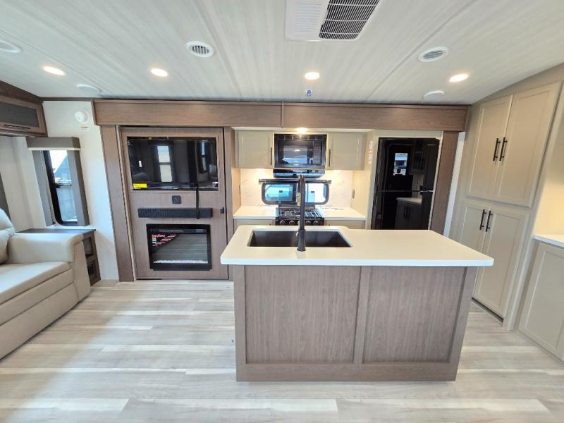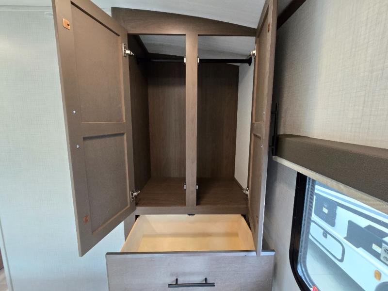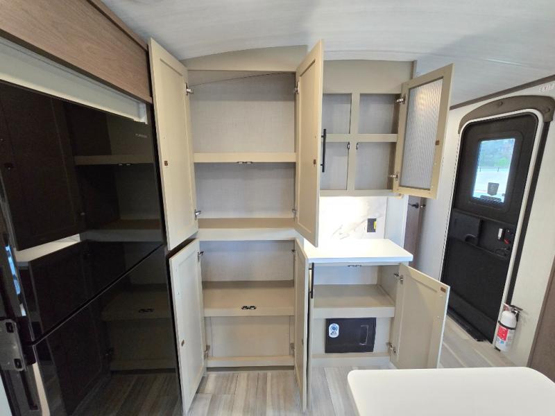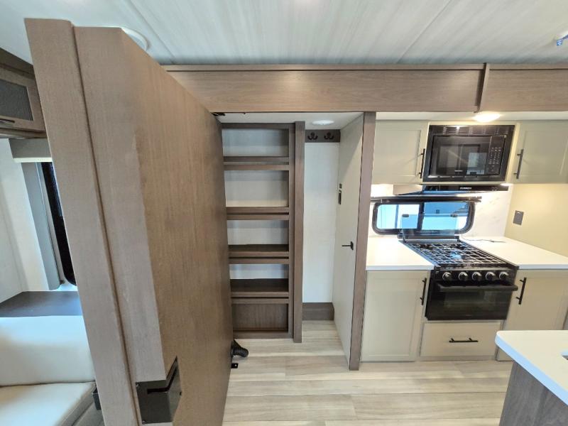 Trips spent in this travel trailer are sure to bring memories! The dual opposing slides in the combined kitchen and living area provide your crew with plenty of space to relax on the theater seating, dine at the dinette table, and prep meals with the kitchen island. There is also a tri-fold sleeper sofa here for guests and a pivoting entertainment center with a hidden pantry to keep snacks stocked. And a second pantry and hutch provides even more storage! You'll love having your own private bedroom up front, complete with a king bed, dual bedside drawers and nightstands and additional storage drawers to keep your space tidy. Outside, you'll find two power awnings, a 2" accessory hitch, and a drop frame pass-thru storage for fishing poles, hiking gear, and more!