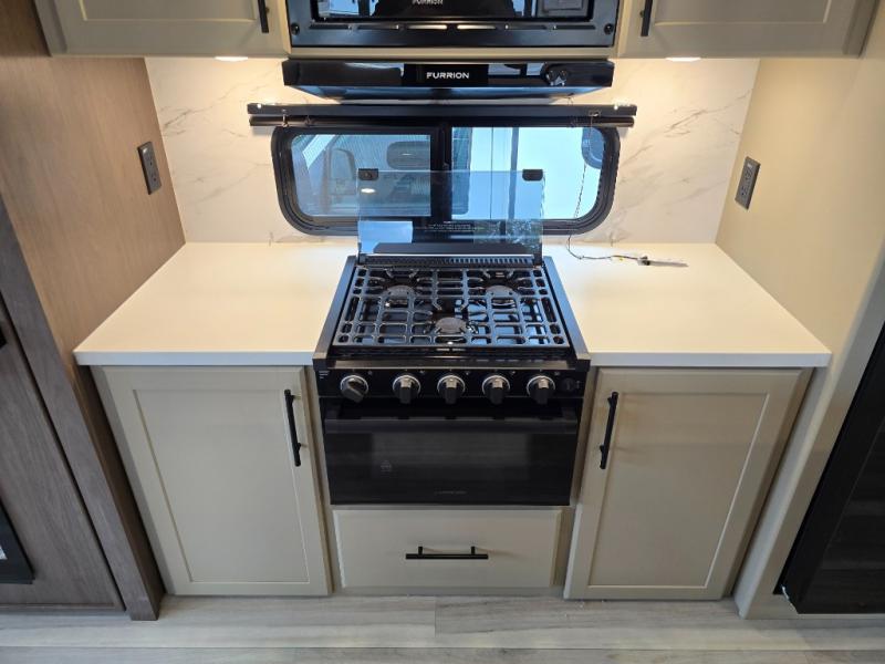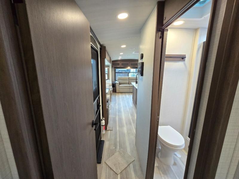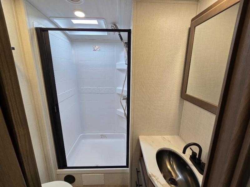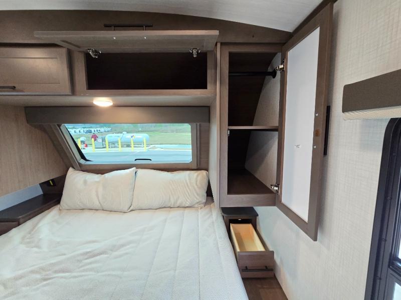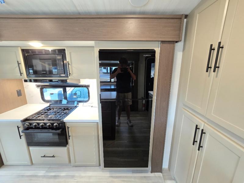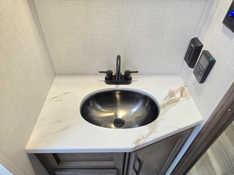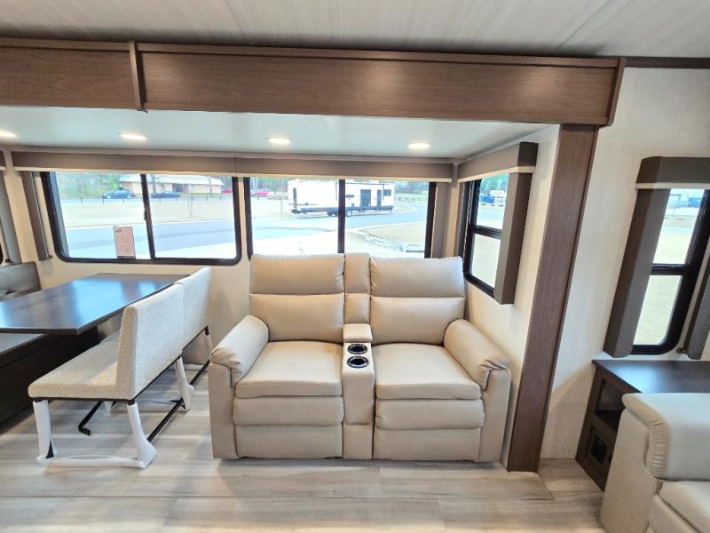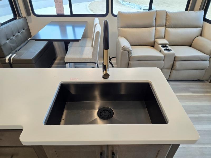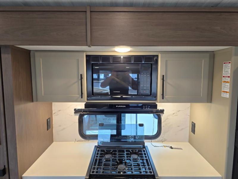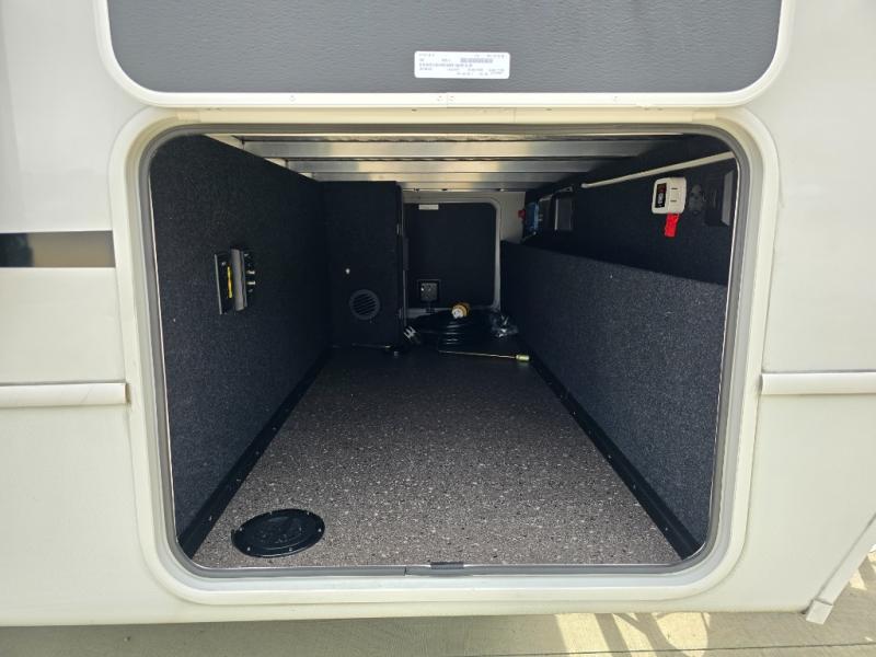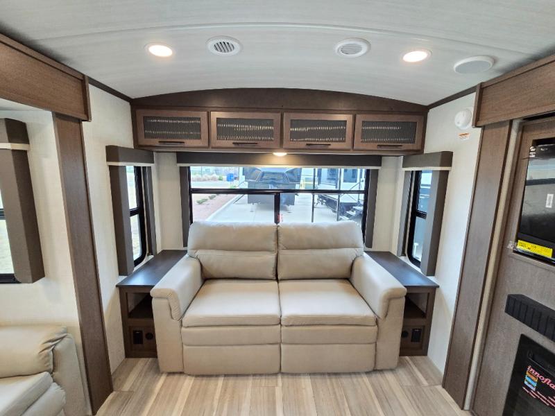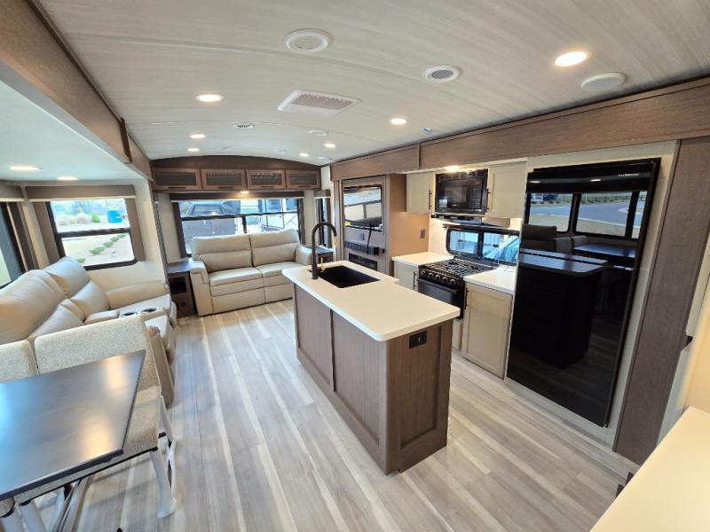 Trips spent in this travel trailer are sure to bring memories! The dual opposing slides in the combined kitchen and living area provide your crew with plenty of space to relax on the theater seating, dine at the dinette table, and prep meals with the kitchen island. There is also a tri-fold sleeper sofa here for guests and a pivoting entertainment center with a hidden pantry to keep snacks stocked. And a second pantry and hutch provides even more storage! You'll love having your own private bedroom up front, complete with a king bed, dual bedside drawers and nightstands and additional storage drawers to keep your space tidy. Outside, you'll find two power awnings, a 2" accessory hitch, and a drop frame pass-thru storage for fishing poles, hiking gear, and more!