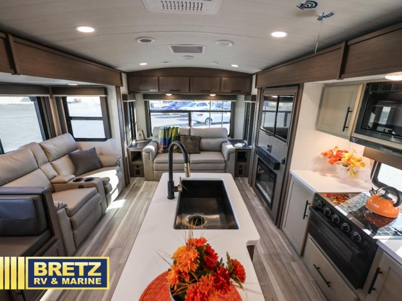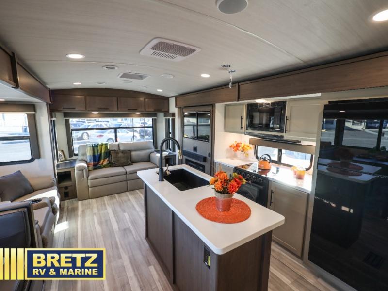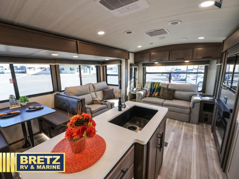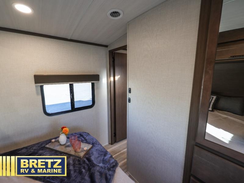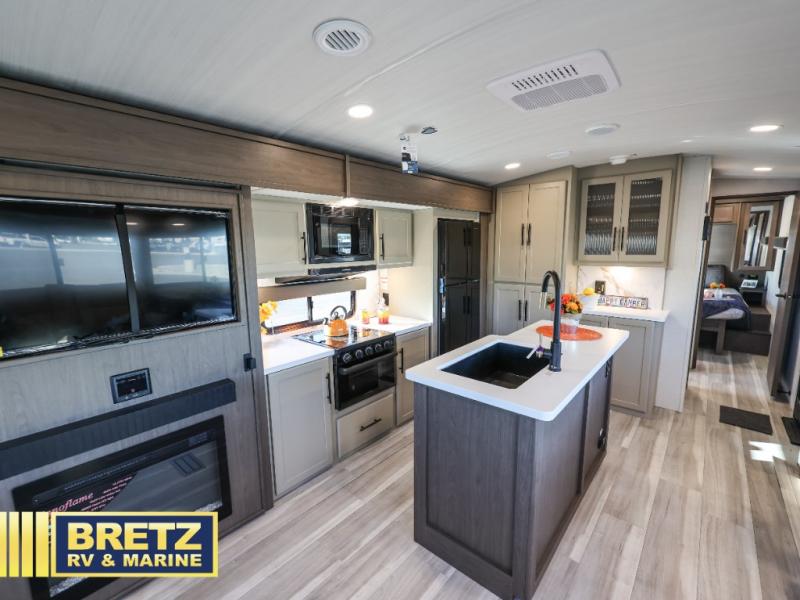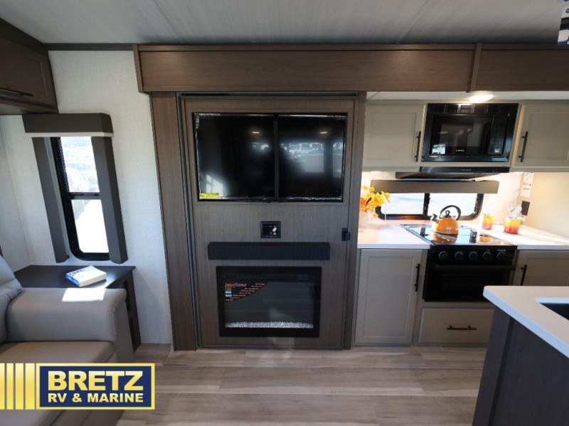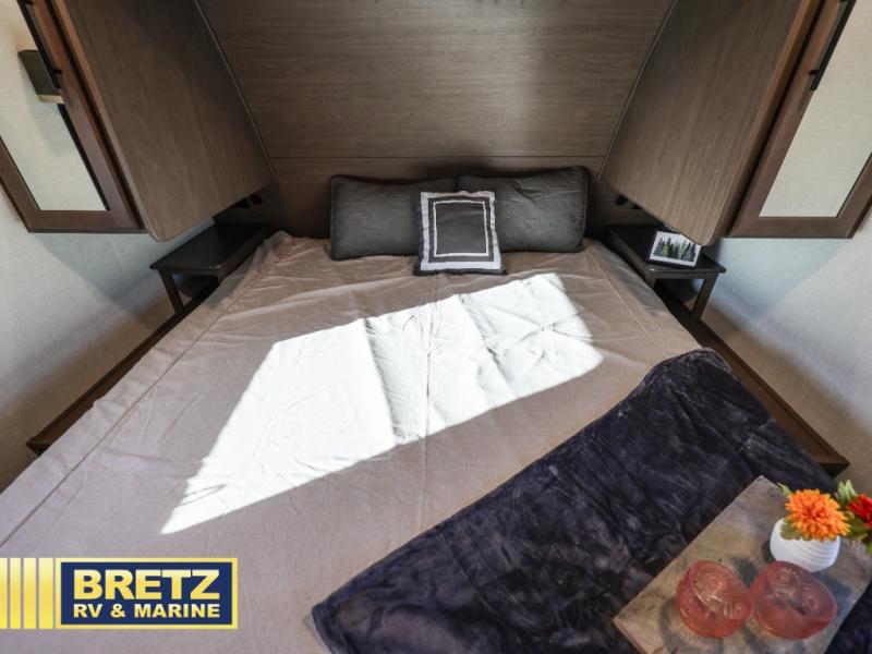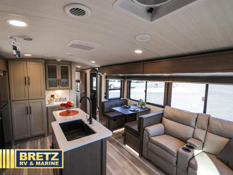 Trips spent in this travel trailer are sure to bring memories! The dual opposing slides in the combined kitchen and living area provide your crew with plenty of space to relax on the theater seating, dine at the dinette table, and prep meals with the kitchen island. There is also a tri-fold sleeper sofa here for guests and a pivoting entertainment center with a hidden pantry to keep snacks stocked. And a second pantry and hutch provides even more storage! You'll love having your own private bedroom up front, complete with a king bed, dual bedside drawers and nightstands and additional storage drawers to keep your space tidy. Outside, you'll find two power awnings, a 2" accessory hitch, and a drop frame pass-thru storage for fishing poles, hiking gear, and more!