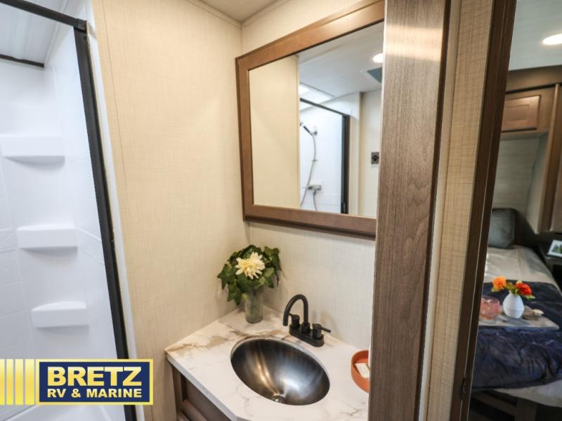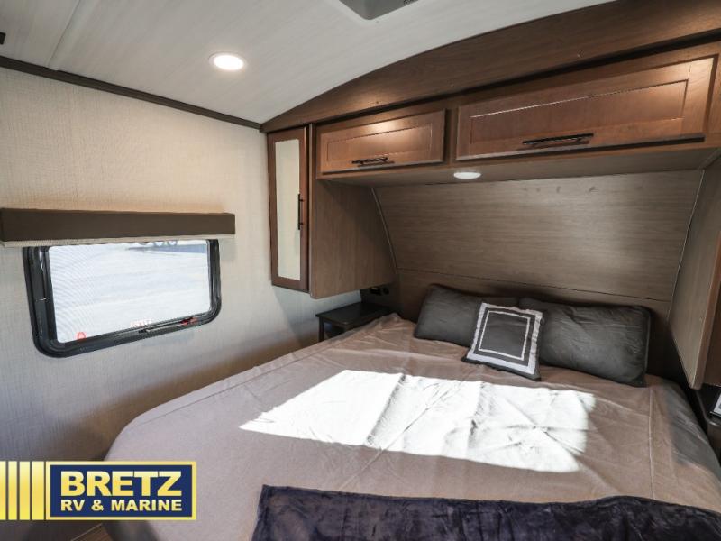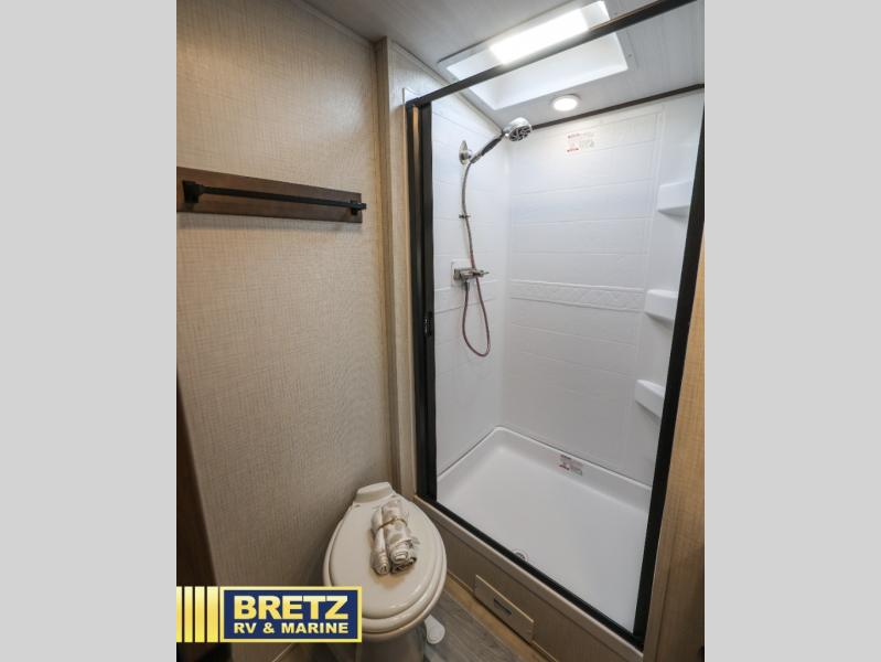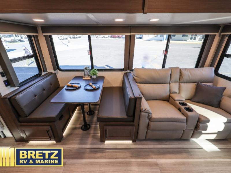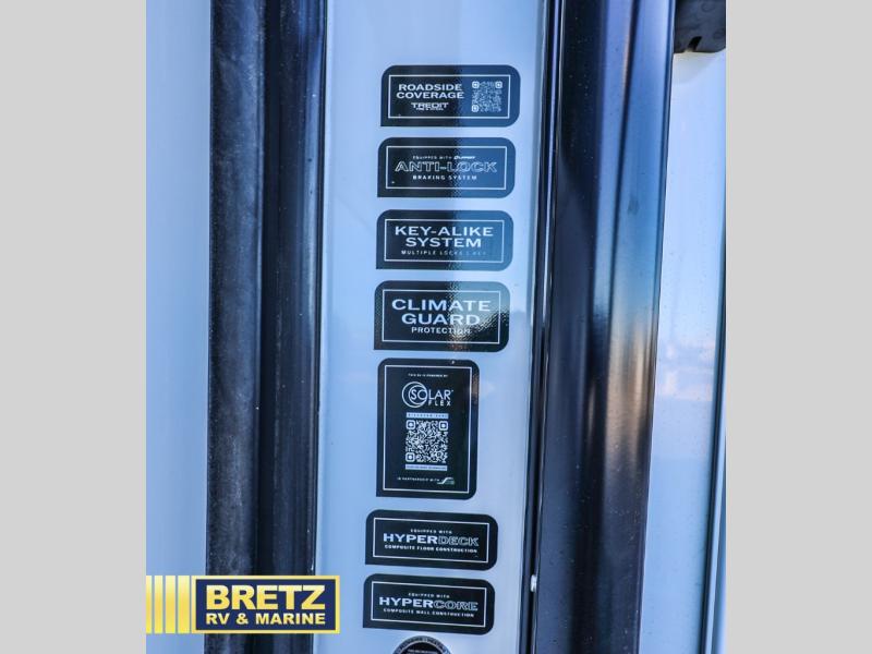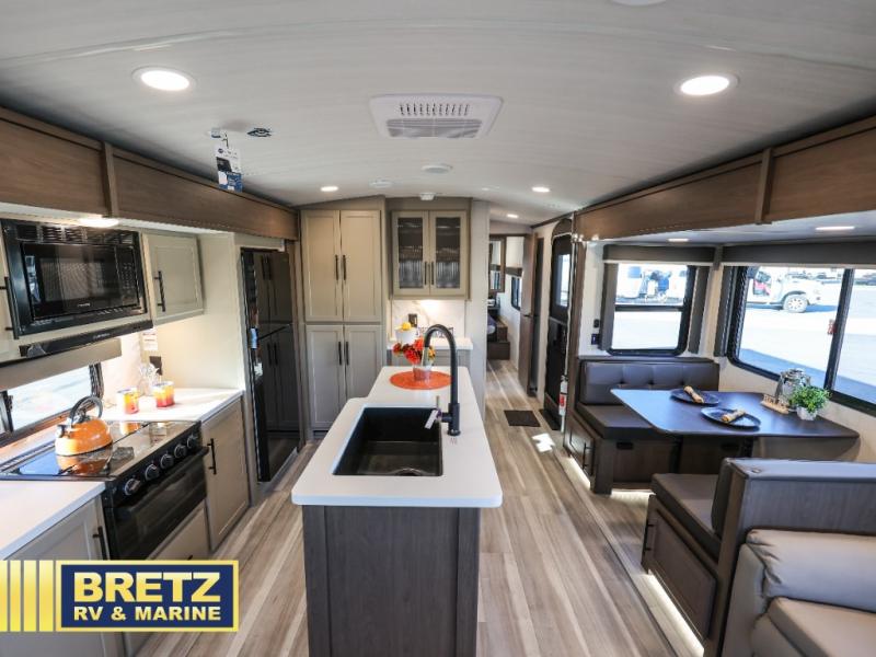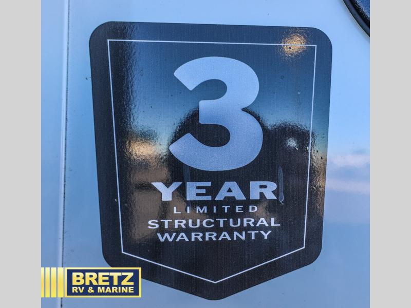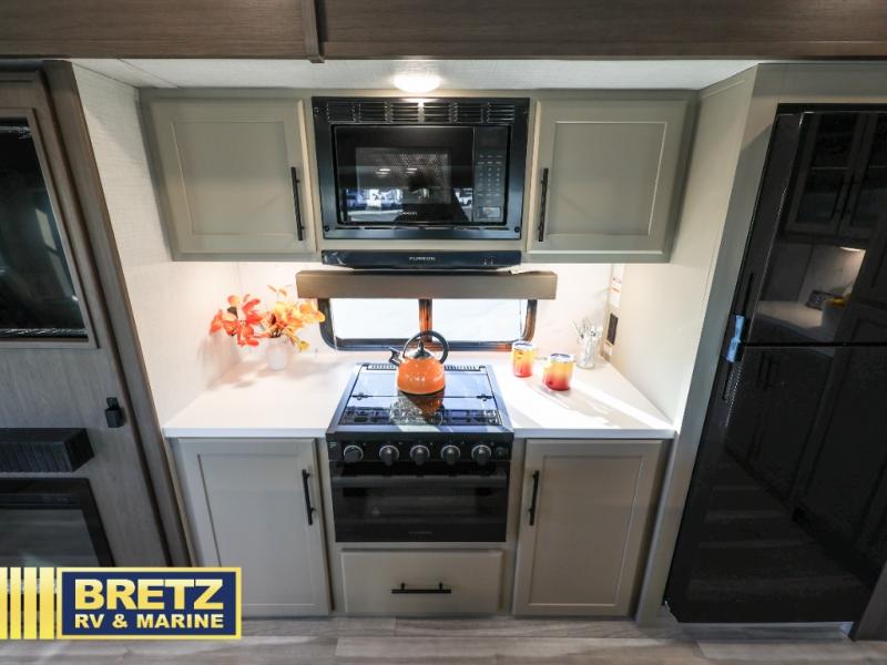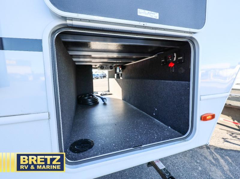 Trips spent in this travel trailer are sure to bring memories! The dual opposing slides in the combined kitchen and living area provide your crew with plenty of space to relax on the theater seating, dine at the dinette table, and prep meals with the kitchen island. There is also a tri-fold sleeper sofa here for guests and a pivoting entertainment center with a hidden pantry to keep snacks stocked. And a second pantry and hutch provides even more storage! You'll love having your own private bedroom up front, complete with a king bed, dual bedside drawers and nightstands and additional storage drawers to keep your space tidy. Outside, you'll find two power awnings, a 2" accessory hitch, and a drop frame pass-thru storage for fishing poles, hiking gear, and more!