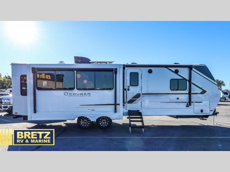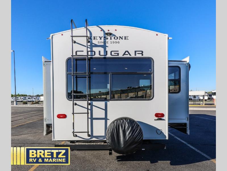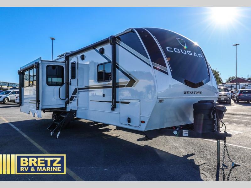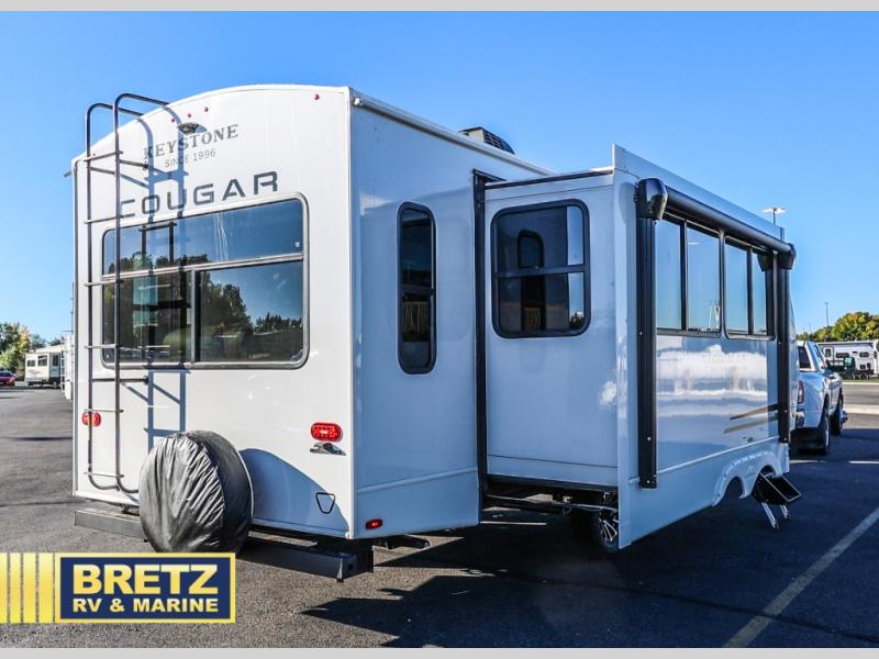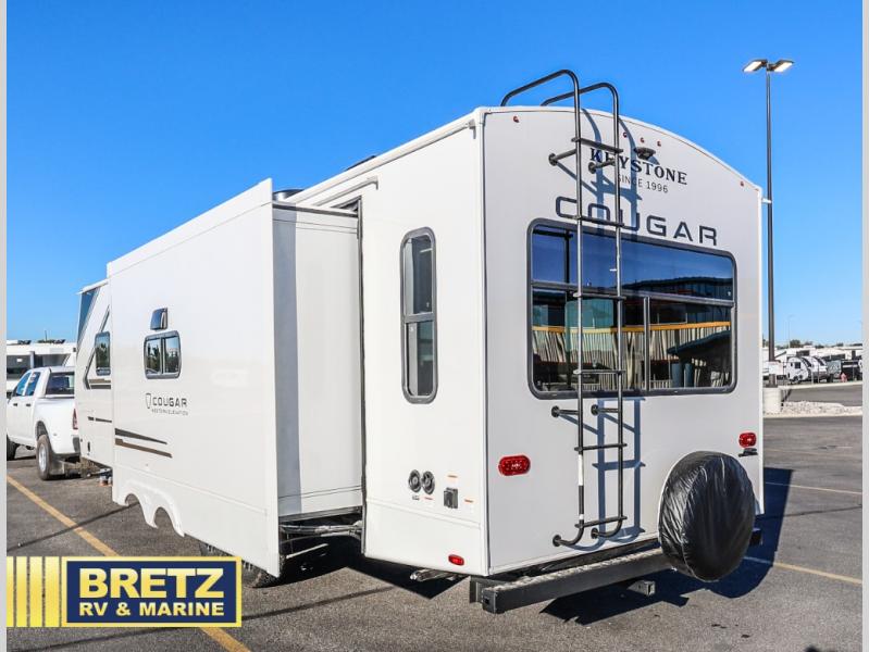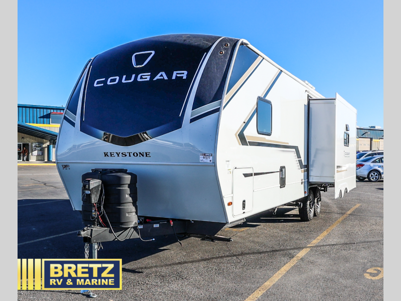 The Keystone Cougar Half-Ton fifth wheel and travel trailers are known as one of America's favorites for a reason! Some of those reasons are the exclusive features that come from Keystone, like the Winegard Air 360+ omni-directional rooftop antenna, the in-floor heating ducts, and the HyperCore composite wall construction with Vixen Fibrogloss high-gloss finish. The Cougar Half-Ton has a Climate Guard protection package with heat-deflecting white sidewalls, two roof attic vents, PEX plumbing and more to enjoy four season camping. Inside, you'll love the dimmable lighting, night roller shades throughout, shower skylight, and bedside USB outlets to keep your electronics charged.