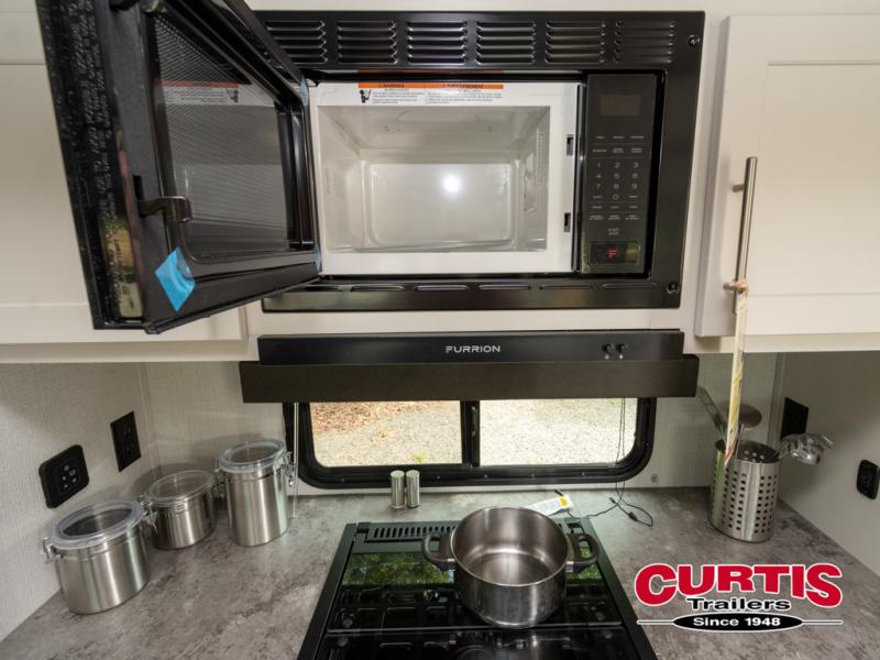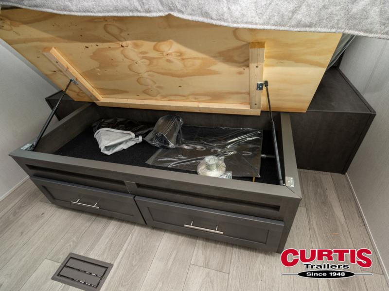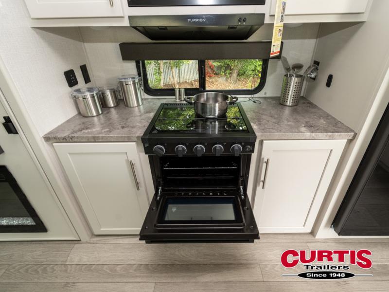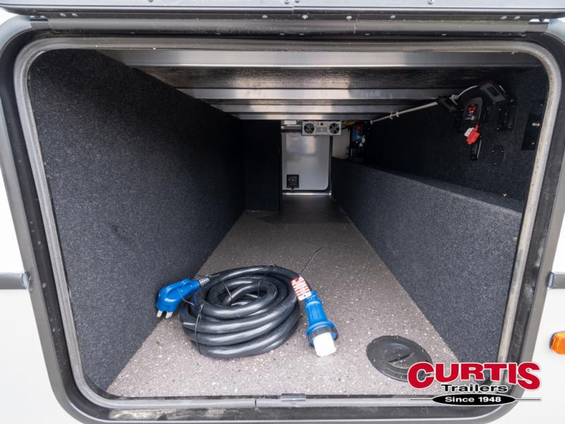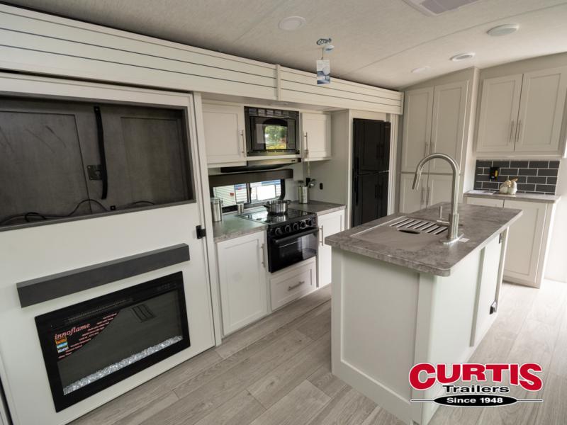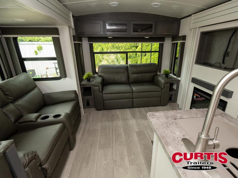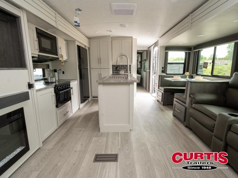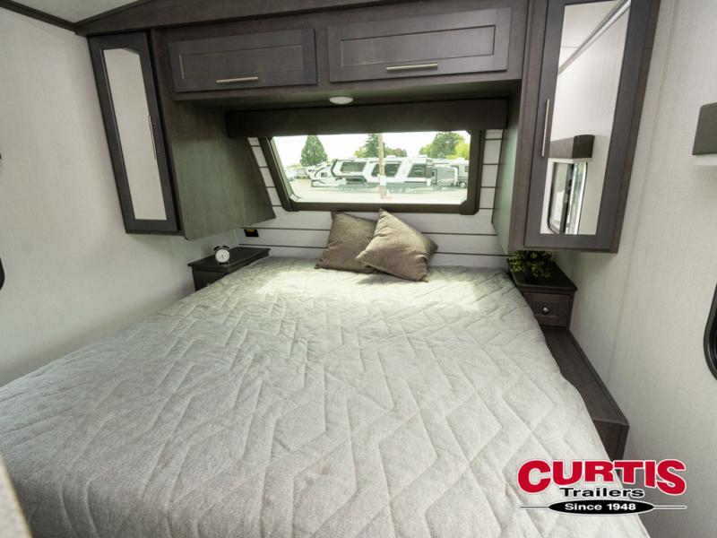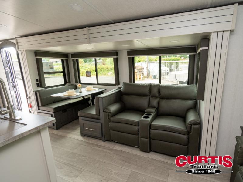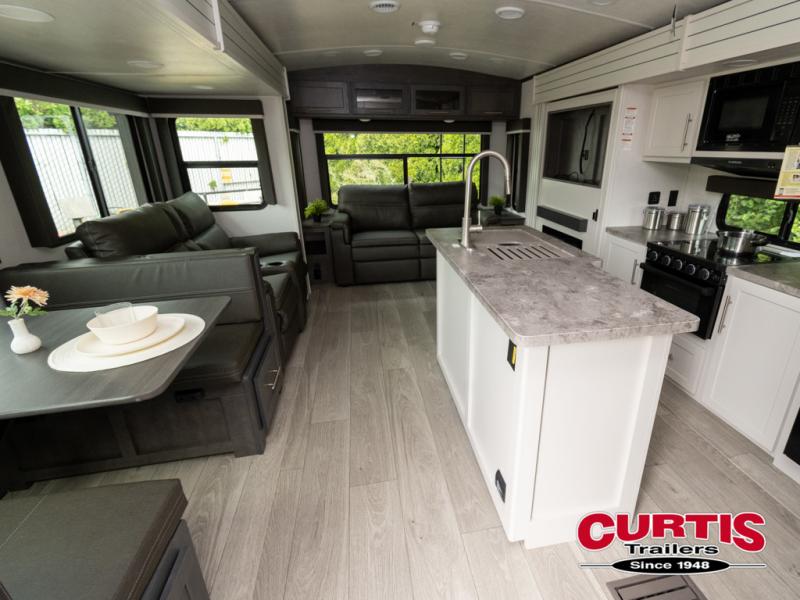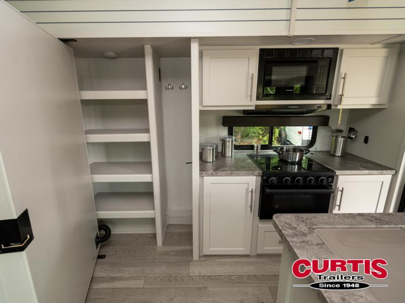 Trips spent in this travel trailer are sure to bring memories! The dual opposing slides in the combined kitchen and living area provide your crew with plenty of space to relax on the theater seating, dine at the dinette table, and prep meals with the kitchen island. There is also a tri-fold sleeper sofa here for guests and a pivoting entertainment center with a hidden pantry to keep snacks stocked. And a second pantry and hutch provides even more storage! You'll love having your own private bedroom up front, complete with a king bed, dual bedside drawers and nightstands and additional storage drawers to keep your space tidy. Outside, you'll find two power awnings, a 2" accessory hitch, and a drop frame pass-thru storage for fishing poles, hiking gear, and more!