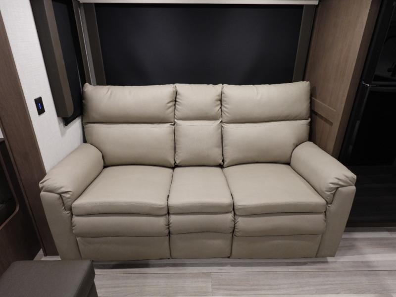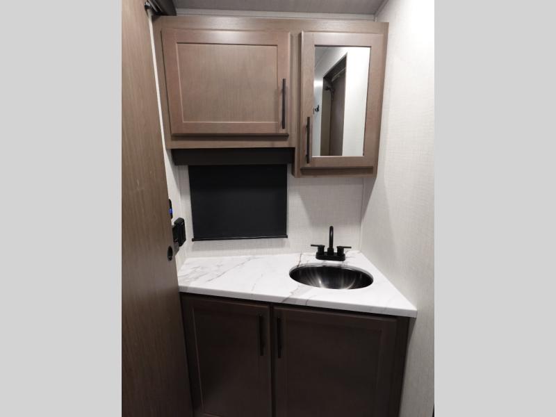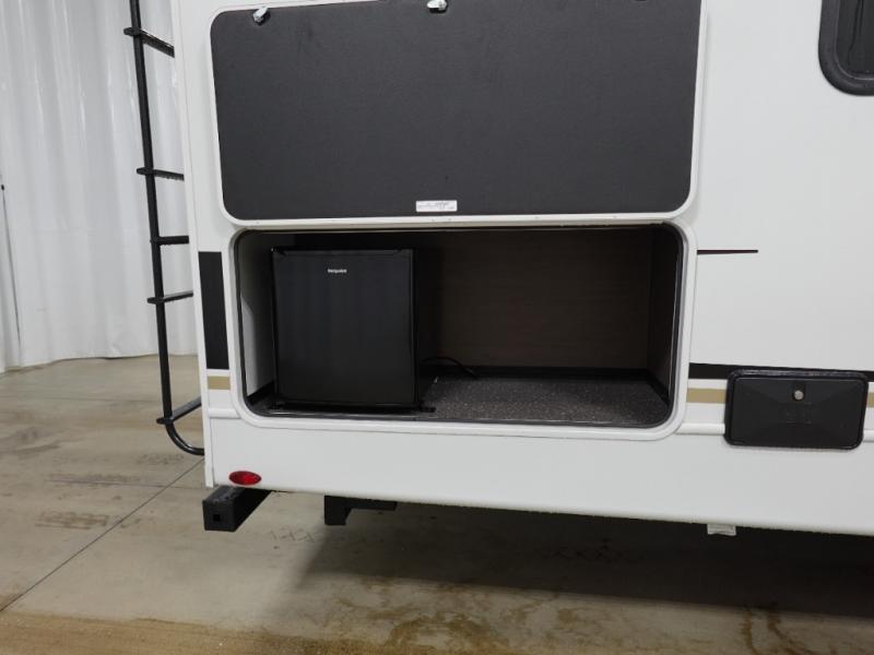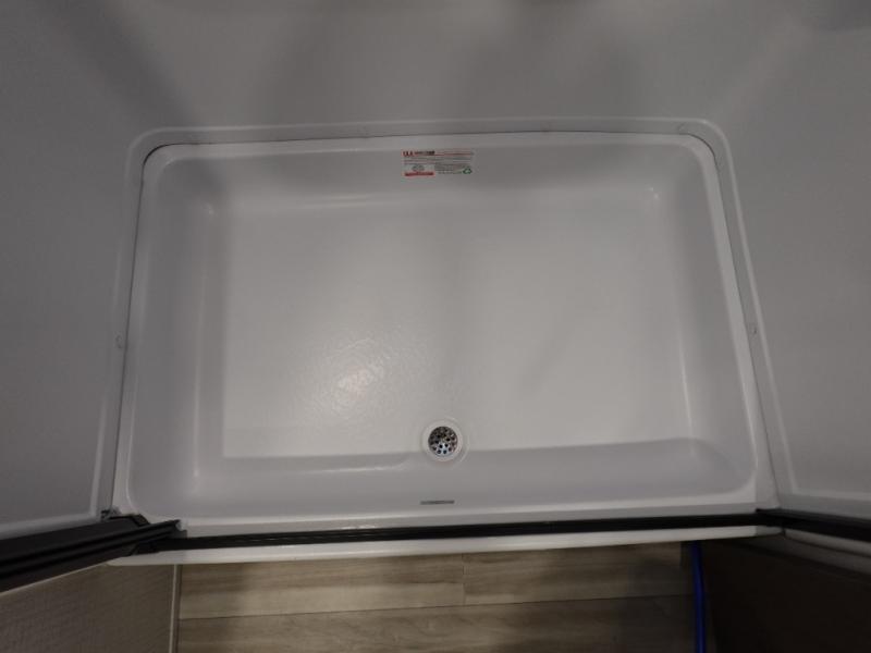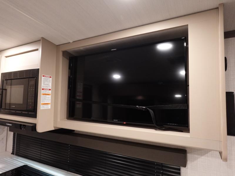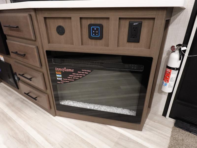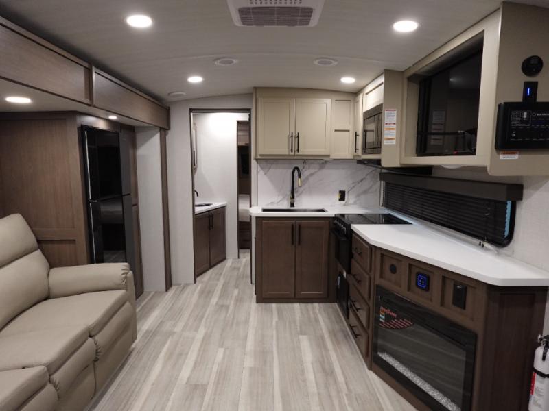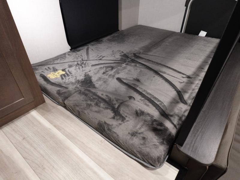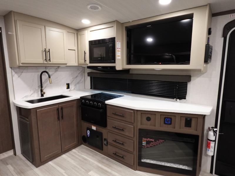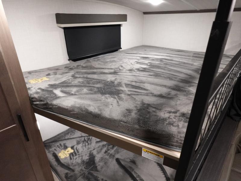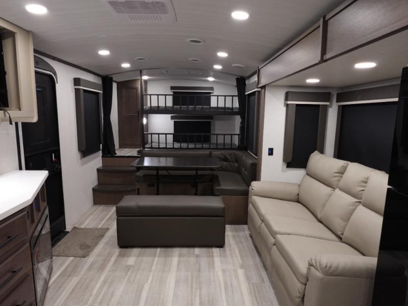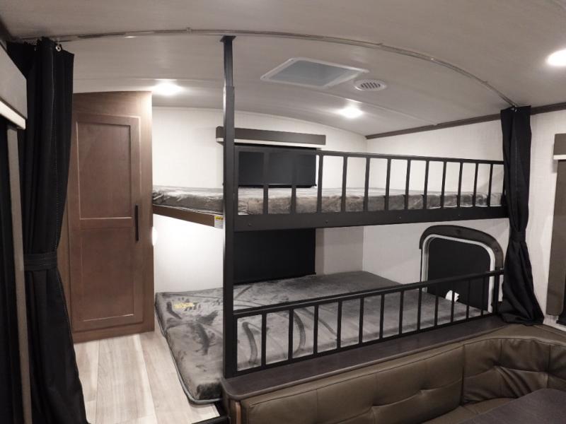 You're going to love camping with friends or family in this spacious travel trailer. There are double-size bunks in the back, and the lower bunk flips up for storage of luggage, camp gear, or toys. The group can relax in the main living area that includes a tri-fold sleeper sofa within the large slide out, plus there is an L-shaped booth dinette with an ottoman/bench seat for a unique set-up. There is even a fireplace and an LED HDTV for those rainy days you stay indoors. This model includes all the appliances indoors needed to prepare meals each day, plus there is an outdoor kitchen prep area and an exterior mini fridge for cold drinks. And check out the 19' power awning that will shade you as you cook up lunch!