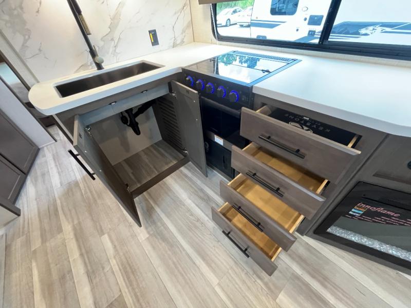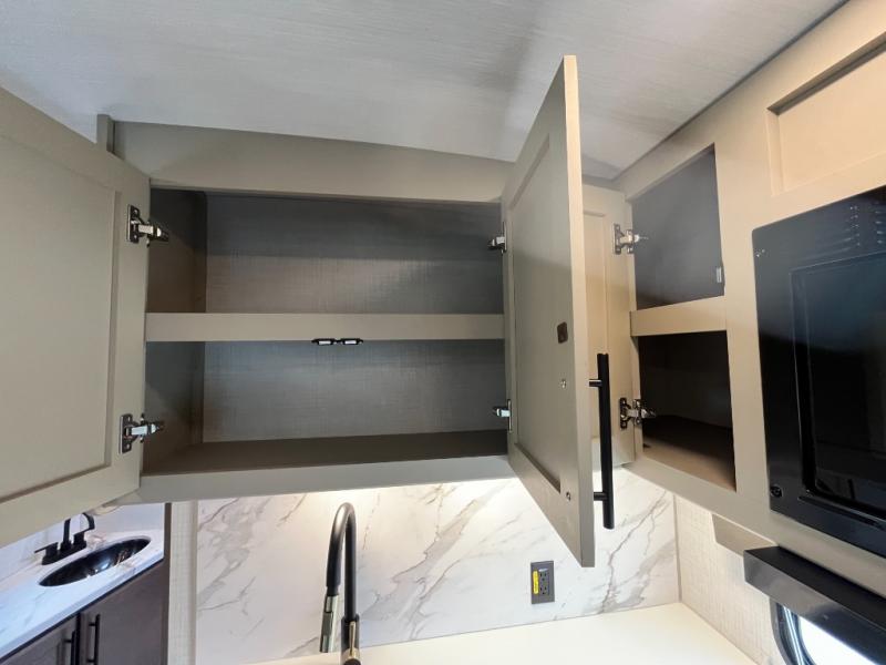 Fully Equipped Kitchen – Includes a 3-burner cooktop, microwave, 12V refrigerator, and generous pantry space.