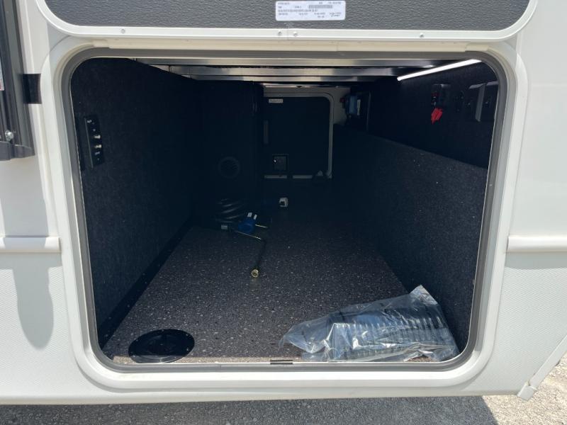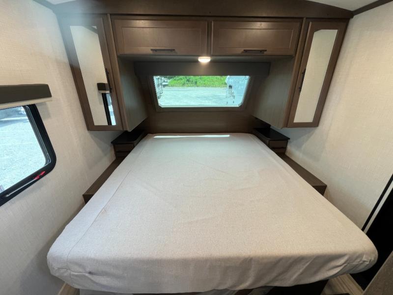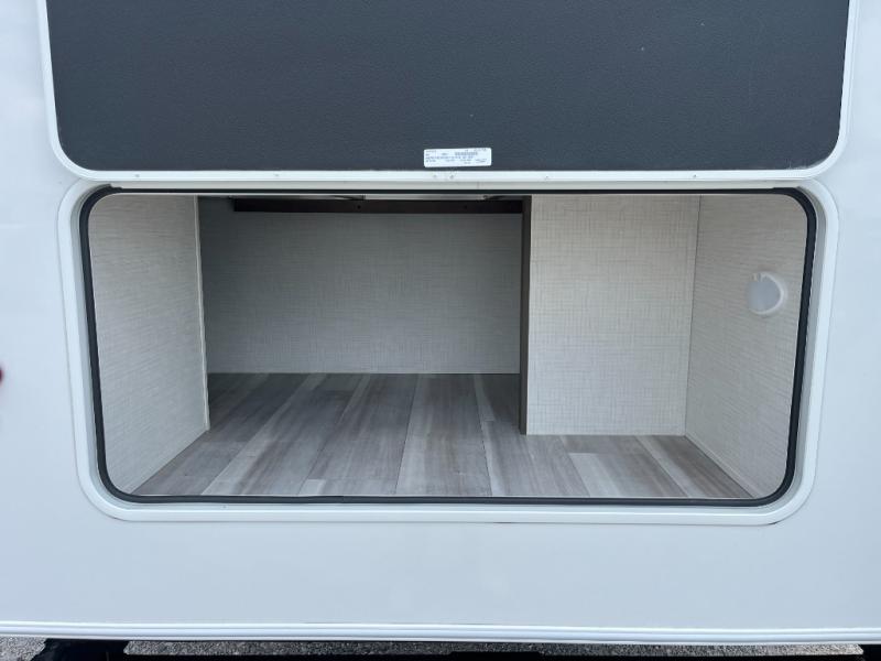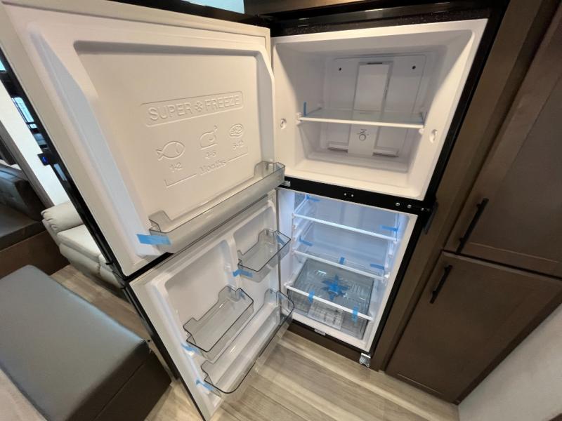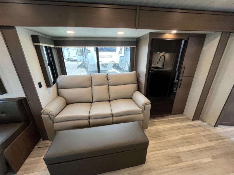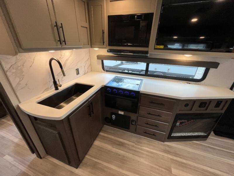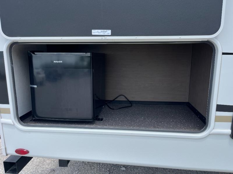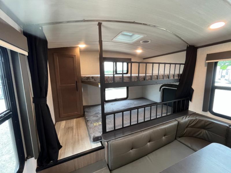 You're going to love camping with friends or family in this spacious travel trailer. There are double-size bunks in the back, and the lower bunk flips up for storage of luggage, camp gear, or toys. The group can relax in the main living area that includes a tri-fold sleeper sofa within the large slide out, plus there is an L-shaped booth dinette with an ottoman/bench seat for a unique set-up. There is even a fireplace and an LED HDTV for those rainy days you stay indoors. This model includes all the appliances indoors needed to prepare meals each day, plus there is an outdoor kitchen prep area and an exterior mini fridge for cold drinks. And check out the 19' power awning that will shade you as you cook up lunch!