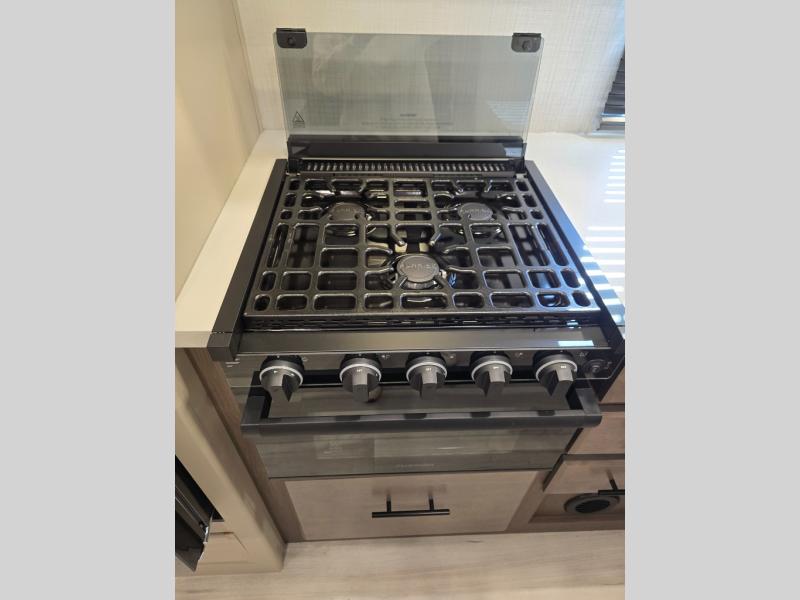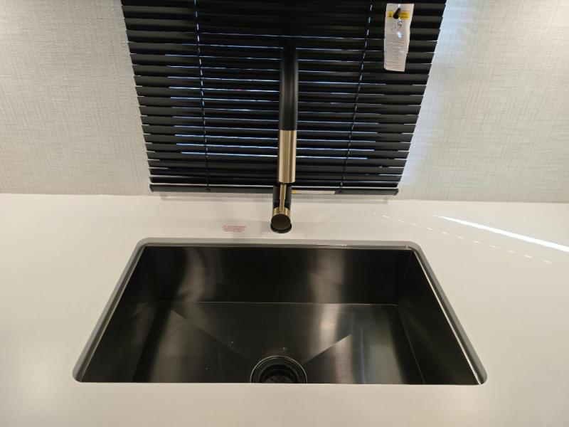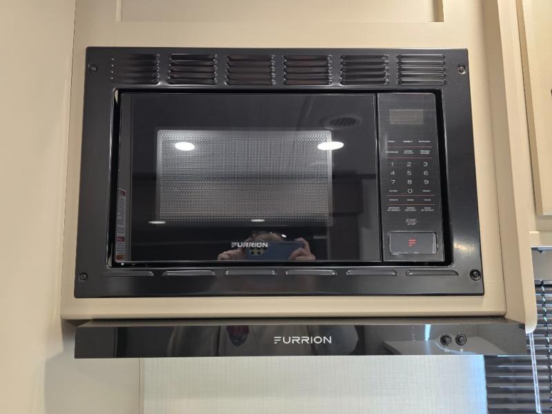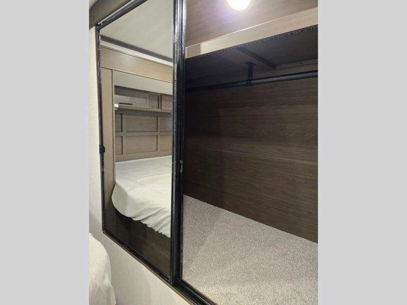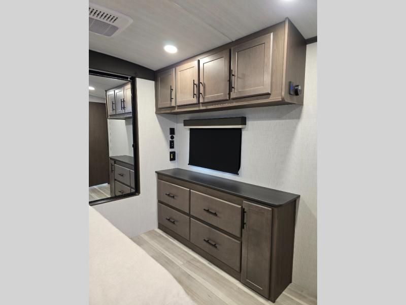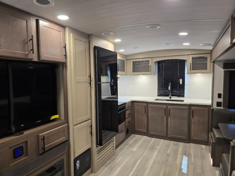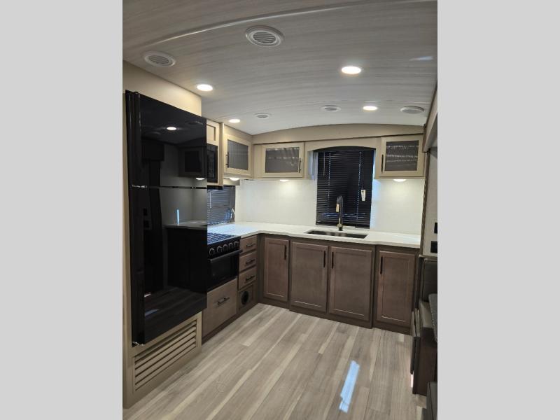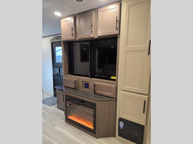 How does a queen bed slide with an optional king bed in the master suite sound? With this Cougar Half-Ton travel trailer, you'll have extra floor space and a full-width wardrobe allowing you to stay at your favorite campsite for long periods of time. The second slide located in the main living and kitchen area opens up this space for you to enjoy time spent inside just as much as outdoor adventures. The furniture even doubles as sleeping space for the kids or overnight guests. The rear kitchen layout is a convenience, and you will appreciate all the counter space for preparing and serving meals. You will find hidden storage behind the entertainment center, and next to the entertainment center is a pantry where you can store your favorite snacks.