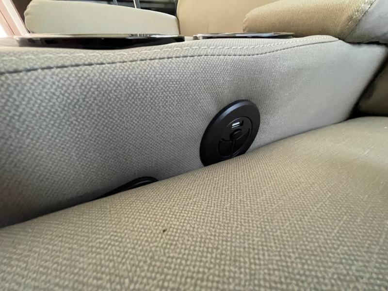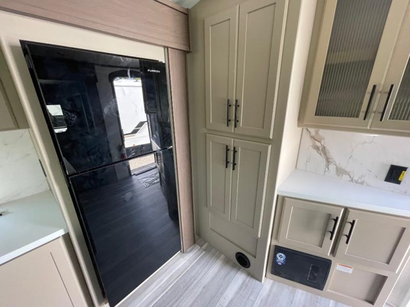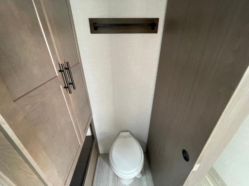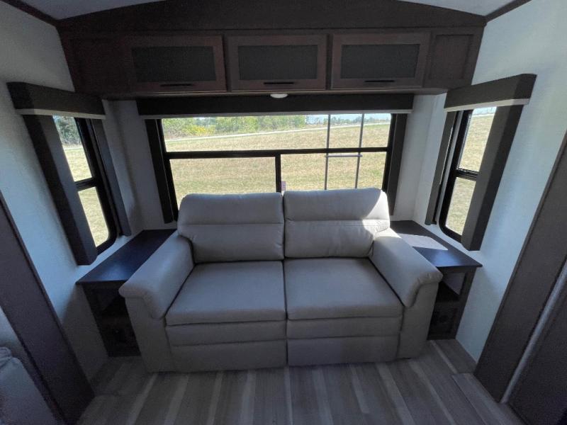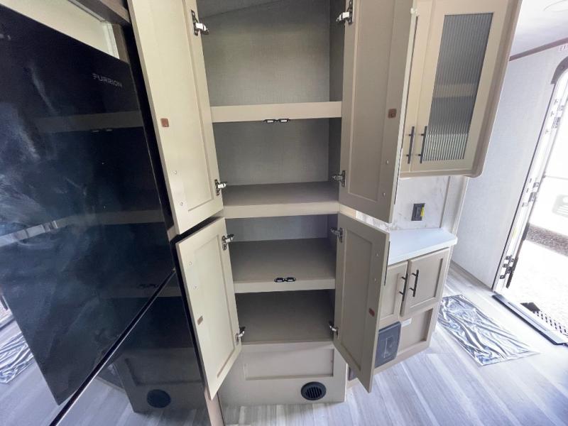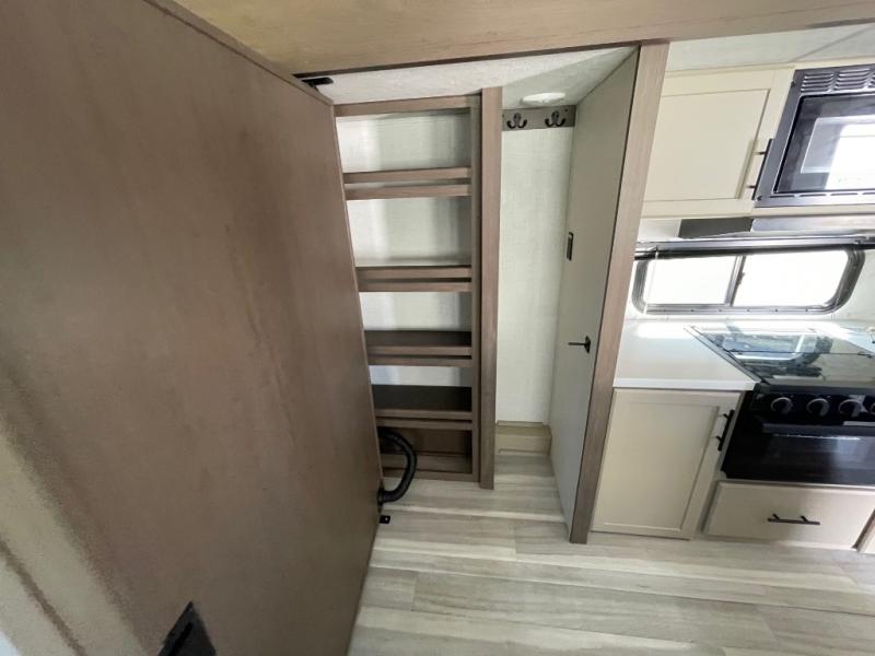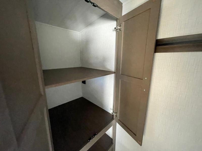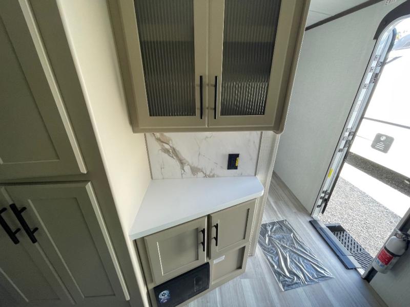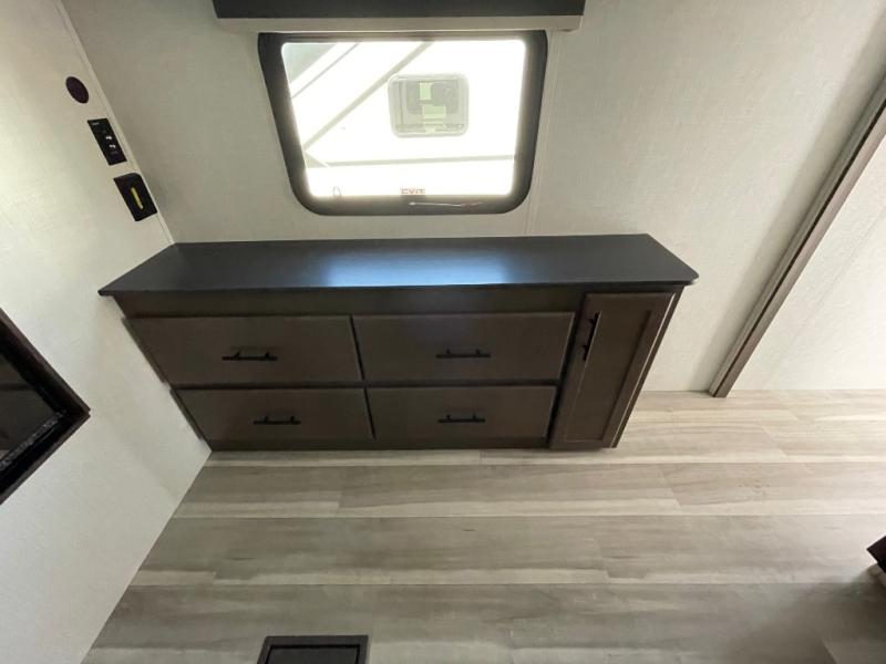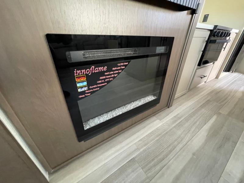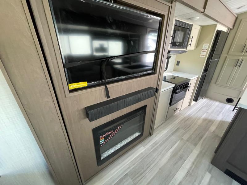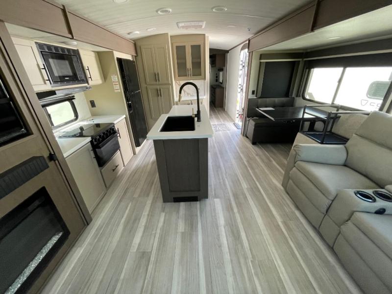 You'll definitely want to snatch up this Cougar Half-Ton travel trailer if you're a couple or small family that wants to live in comfort while at the campsite! There is a private bedroom at the front, and it has a queen bed slide or optional king bed, full-width wardrobe, and a dresser to keep your clothes tidy. Right next to the bedroom is a full bathroom that comes with a linen closet with washer and dryer prep. The main living area is what truly gives you the royal treatment because it has theater seating directly across from the entertainment center and fireplace, a kitchen island that you can gather around when it's snack time, a booth dinette that will serve as a bed or a dinner table, and a 68" tri-fold sleeper sofa with end tables for a cold drink. The kitchen also has a pantry, so you can keep your trailer stocked with goodies throughout the whole trip.