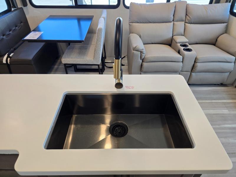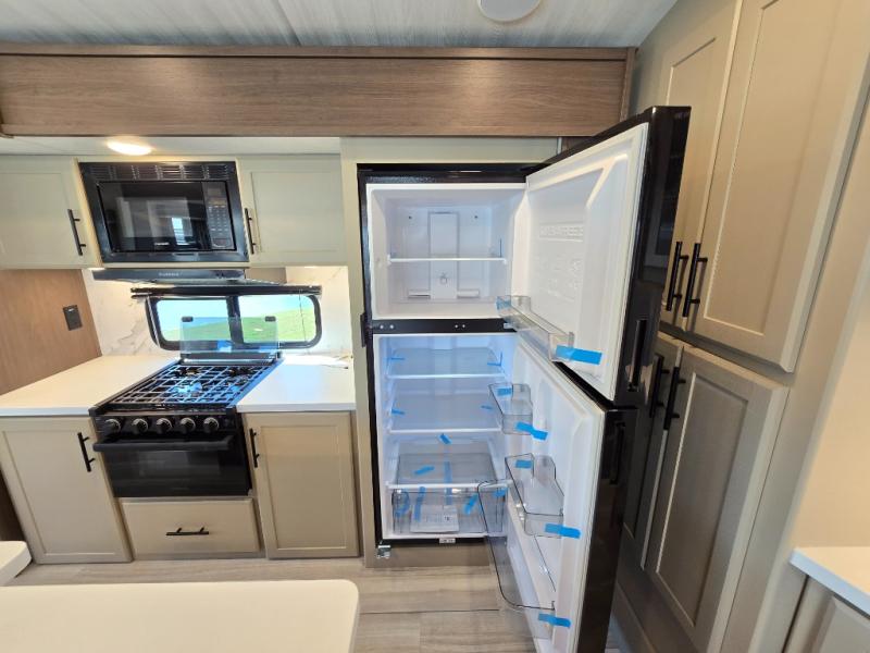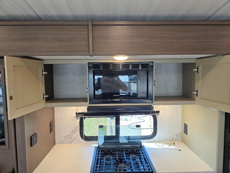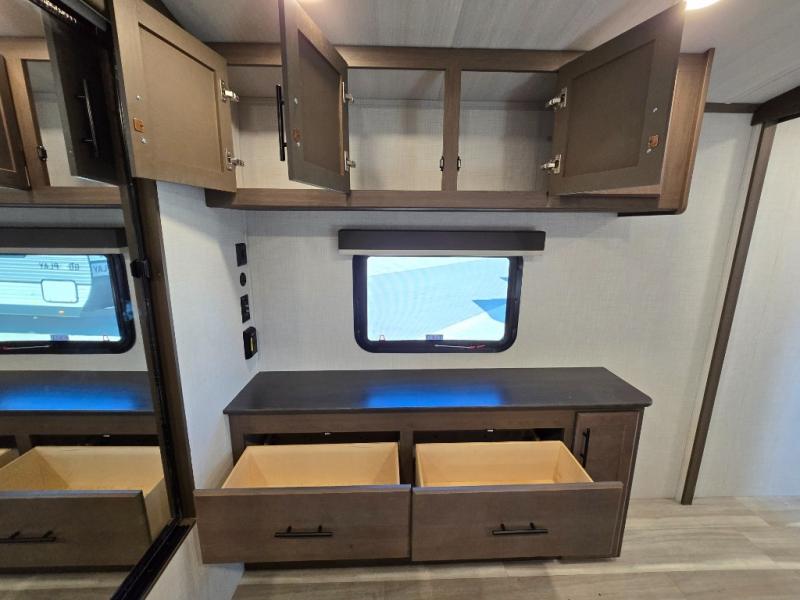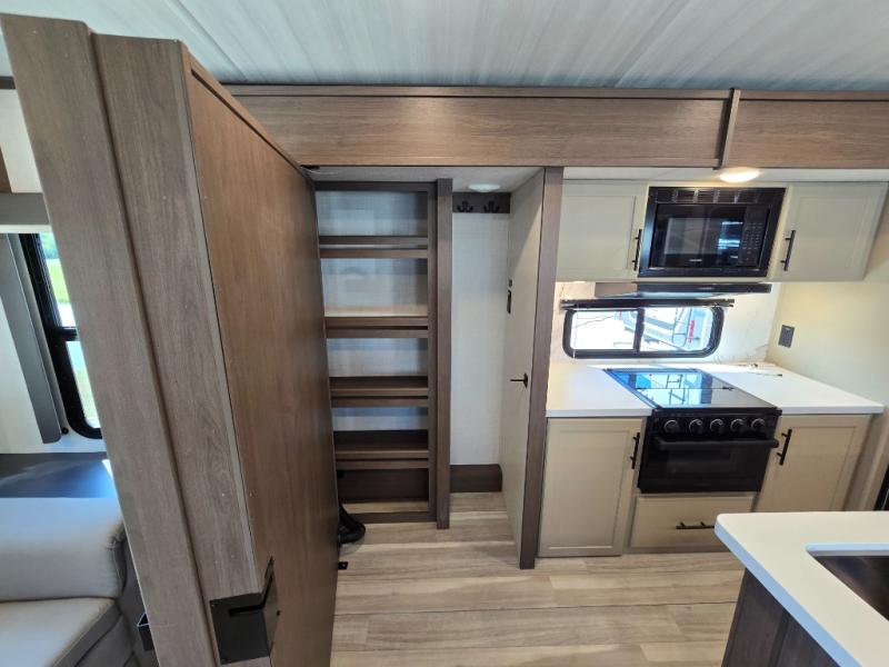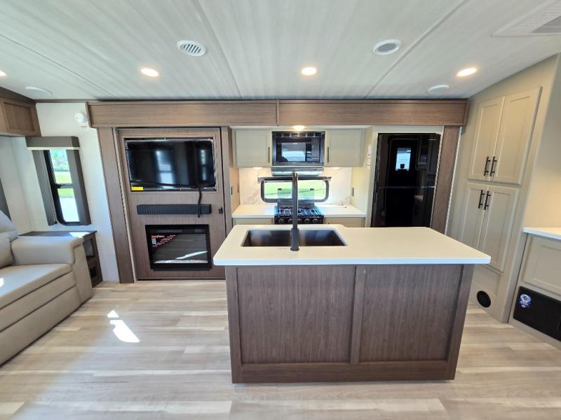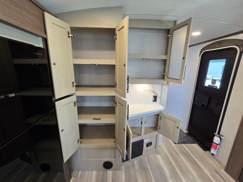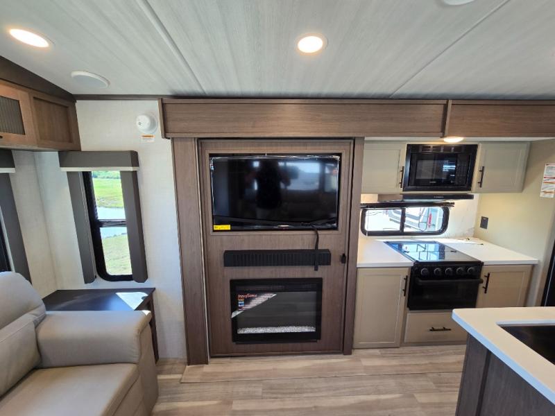 You'll definitely want to snatch up this Cougar Half-Ton travel trailer if you're a couple or small family that wants to live in comfort while at the campsite! There is a private bedroom at the front, and it has a queen bed slide or optional king bed, full-width wardrobe, and a dresser to keep your clothes tidy. Right next to the bedroom is a full bathroom that comes with a linen closet with washer and dryer prep. The main living area is what truly gives you the royal treatment because it has theater seating directly across from the entertainment center and fireplace, a kitchen island that you can gather around when it's snack time, a booth dinette that will serve as a bed or a dinner table, and a 68" tri-fold sleeper sofa with end tables for a cold drink. The kitchen also has a pantry, so you can keep your trailer stocked with goodies throughout the whole trip.