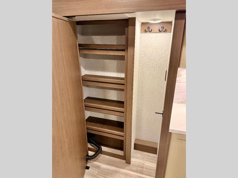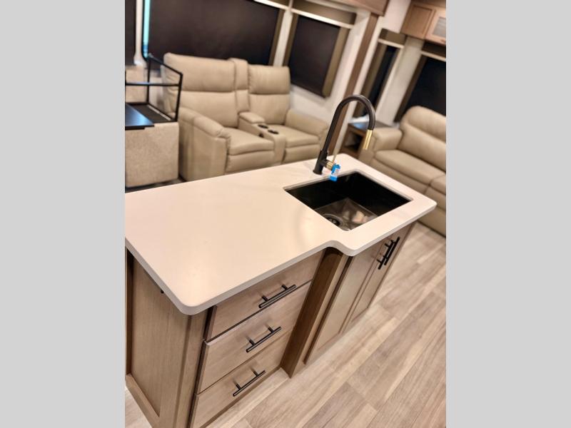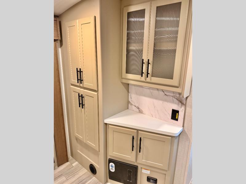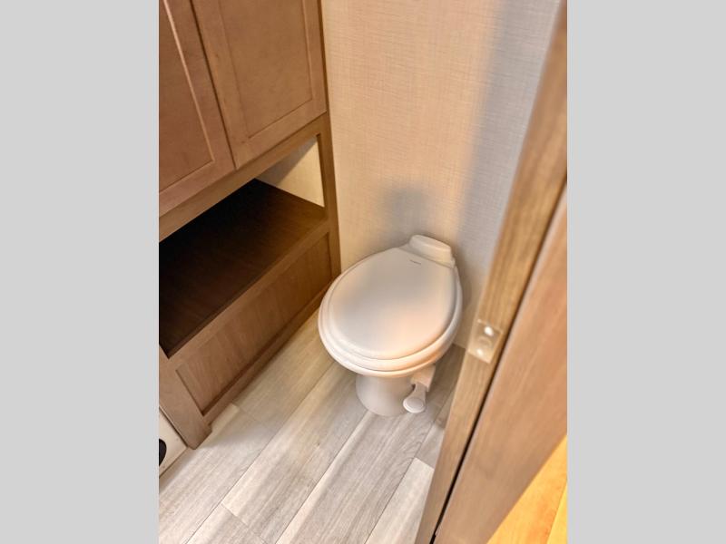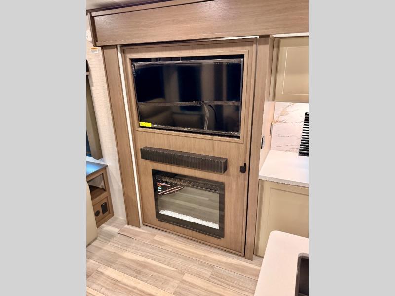 You'll definitely want to snatch up this Cougar Half-Ton travel trailer if you're a couple or small family that wants to live in comfort while at the campsite! There is a private bedroom at the front, and it has a queen bed slide or optional king bed, full-width wardrobe, and a dresser to keep your clothes tidy. Right next to the bedroom is a full bathroom that comes with a linen closet with washer and dryer prep. The main living area is what truly gives you the royal treatment because it has theater seating directly across from the entertainment center and fireplace, a kitchen island that you can gather around when it's snack time, a booth dinette that will serve as a bed or a dinner table, and a 68" tri-fold sleeper sofa with end tables for a cold drink. The kitchen also has a pantry, so you can keep your trailer stocked with goodies throughout the whole trip.
