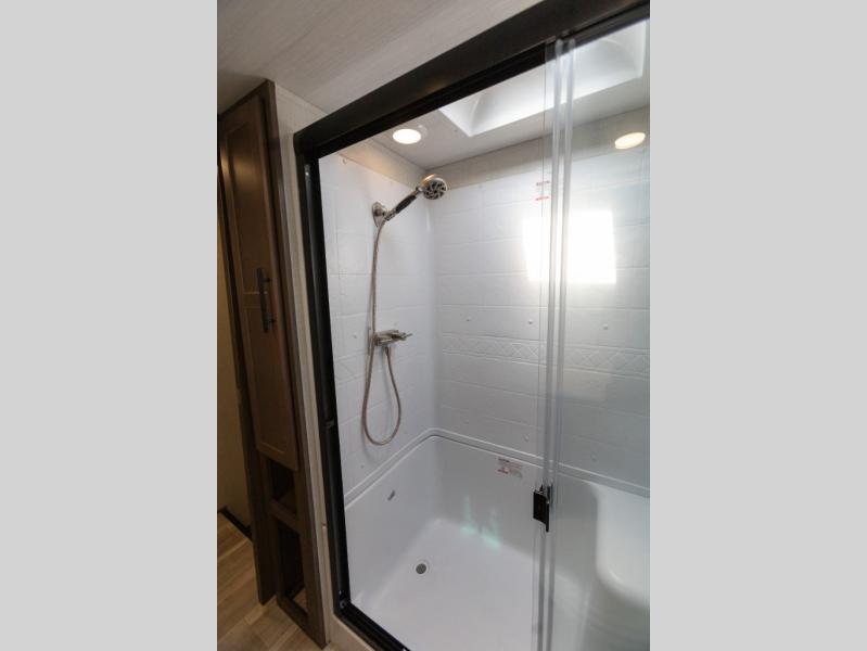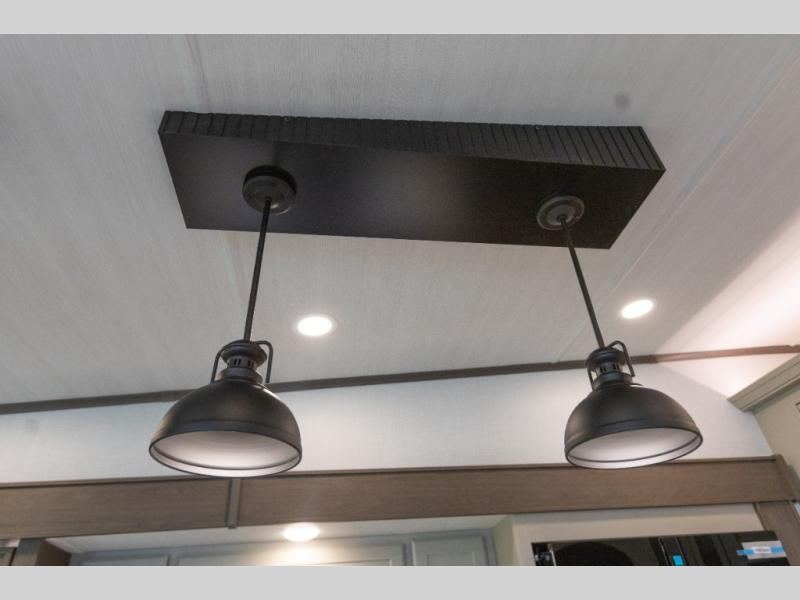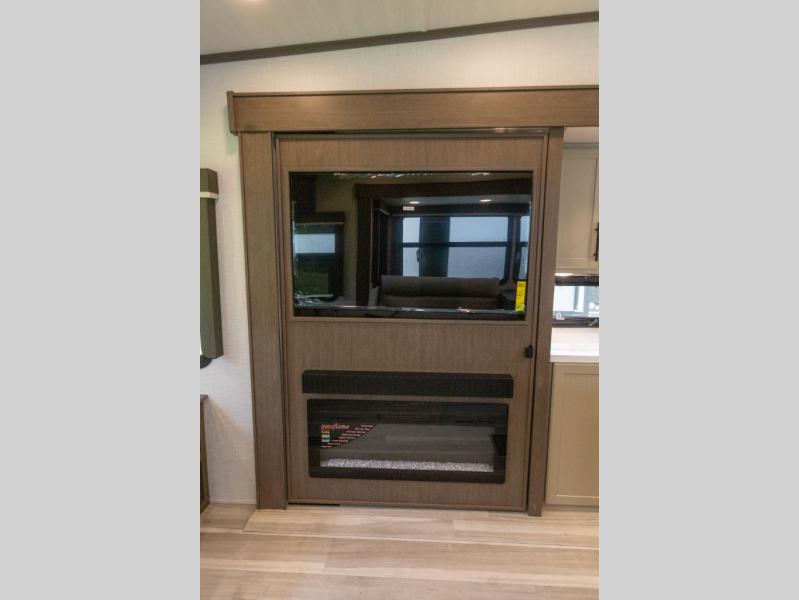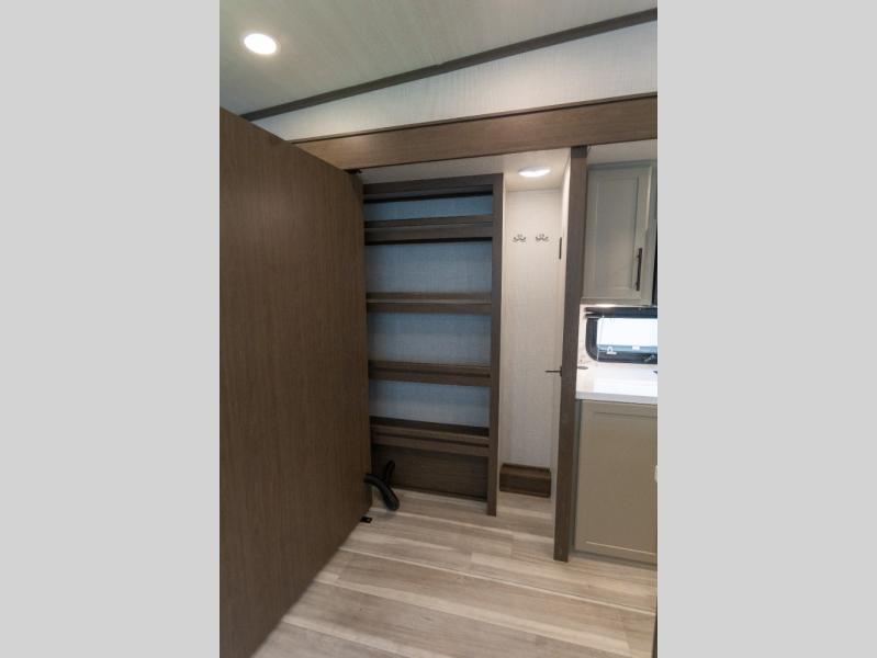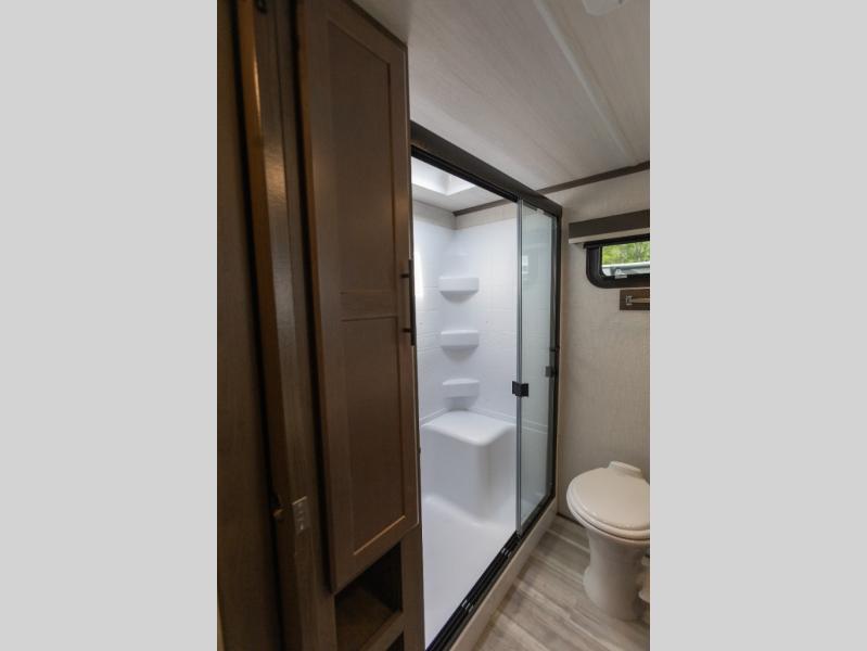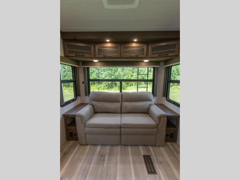 The dual-sink vanity in the full bathroom on this Cougar fifth wheel is what will make your morning routine feel just the same on the road as it does at home! You'll also sleep just as well on the queen-size bed in the front private bedroom, and there is under-bed storage, a full-height wardrobe, and a dresser with hidden storage for all of your personal belongings. As you spend time in the main living area, you'll appreciate having extra space thanks to the set of opposing slides, and the kitchen island will be easy to work around. You'll be able to relax on the tri-fold sleeper sofa and theater seating while you watch the LED HDTV with a pivoting entertainment door and hidden pantry. There is also a booth dinette with storage drawers, convenient shoe storage right as you enter the unit, and an exterior unobstructed pass-thru storage so nothing gets left behind.