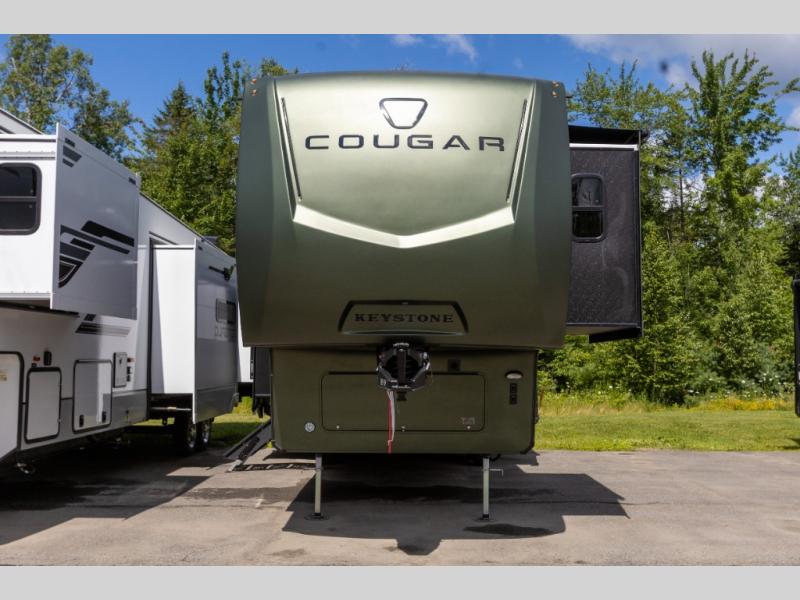 Spend more time having fun and less time worrying about your RV with the Keystone Cougar fifth wheel! These units have all that you will need for excellent vacations. The interior comes with 5/8" one-piece DynaSpan® flooring, tall slide outs for added comfort and head room, night roller shades throughout, and residential, raised-panel hardwood cabinet doors and drawers. You will also enjoy decorative crown molding, a 5,500 BTU electric fireplace with thermostat control and remote, and a Max Air exhaust fan with rain sensor. The exterior is also fully outfitted with a convenience center, friction-hinge entry door, electric four-point auto leveling system, and Lippert SolidStep® on the main entry. Each model is available with the optional Hero Edition. By choosing this edition, you can help support our nation's heros and their families by contributing to the Wounded Warrior Project. This optional package features an industry exclusive full-body paint matte finish, frameless windows, a glass entry door, blackout rims, and green LED exterior accent lighting; see dealer for more details!