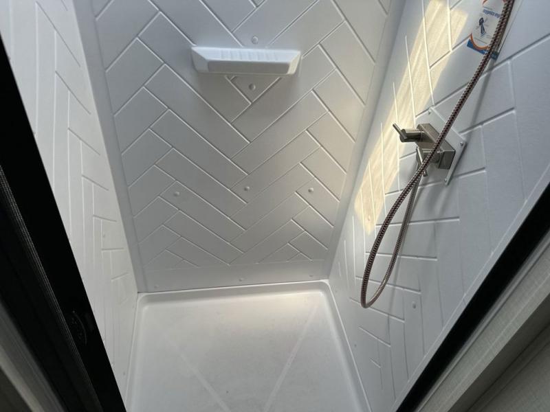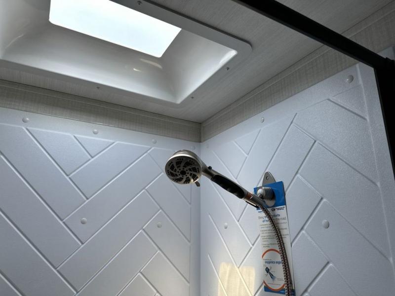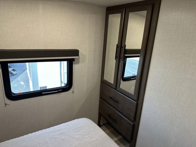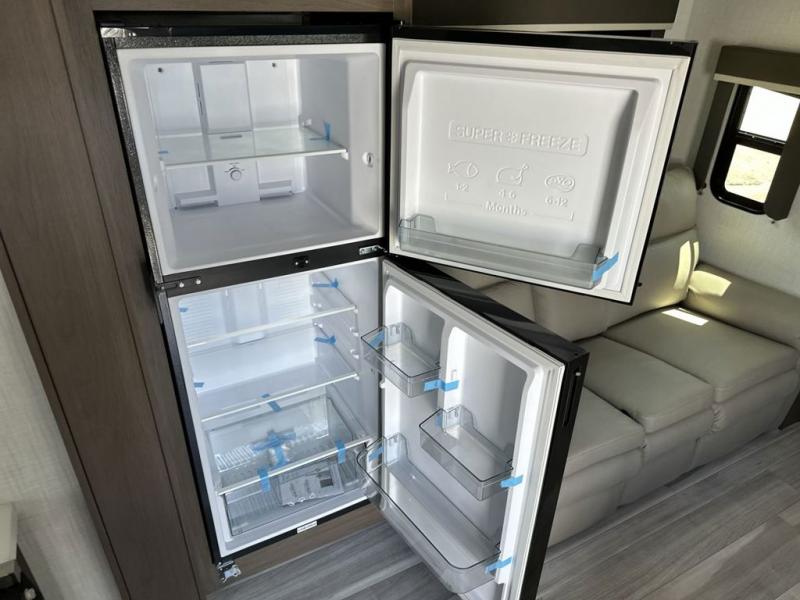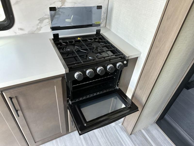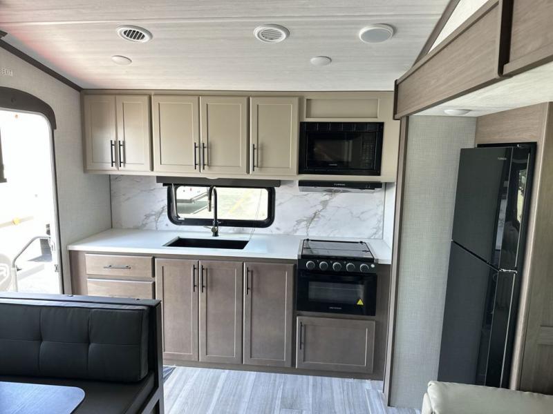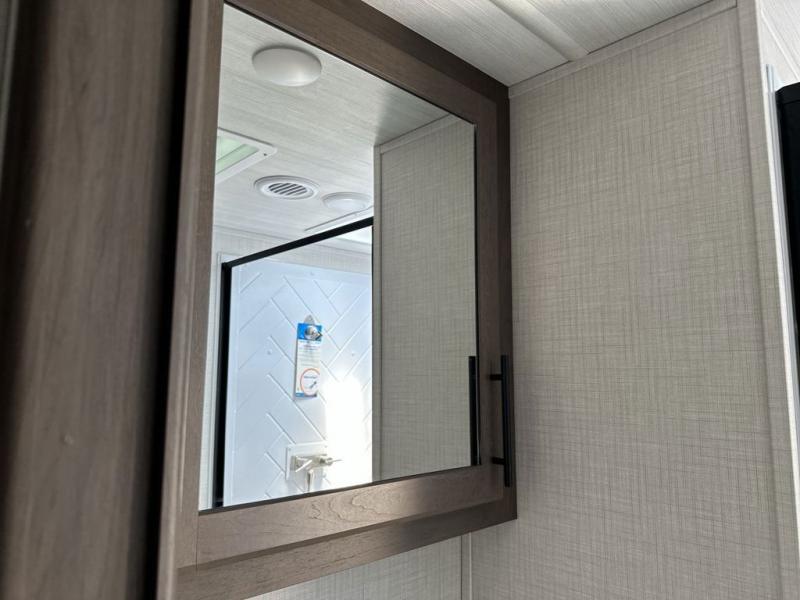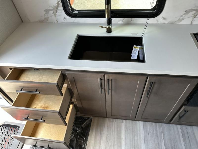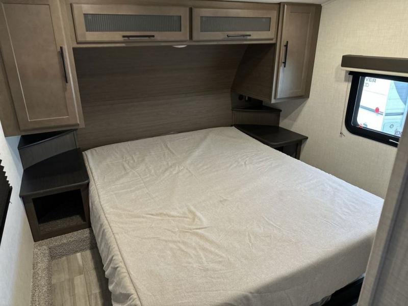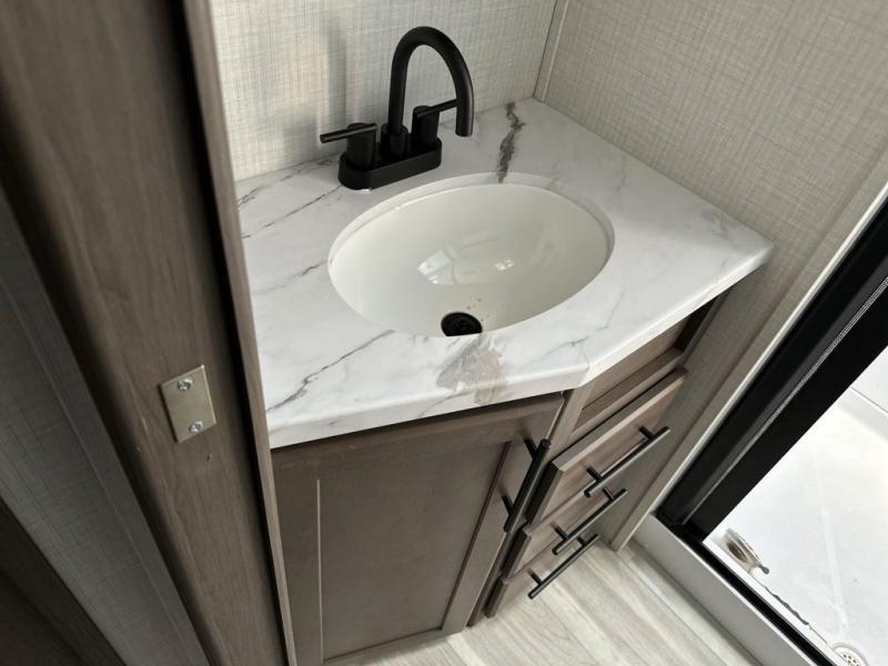 The Cougar Sport structural I-beam frame with stamped steel cross-members and outriggers, plus its laminated sidewalls with five-sided aluminum superstructure and Alpha Super Flex roof membrane are what active RVers love about the construction of the Cougar line. The Cougar Sport models are no exception when it comes to a great package, as well as being smaller and lighter weight than their big brother Cougar models. A one-piece, heated and enclosed polypropylene underbelly means a longer camping season. On the inside, residential shaker style hardwood cabinet doors and decorative crown molding, plus seamless pressed countertops and an on-demand water heater will make your unit feel even more like home. You are also sure to appreciate the shiplap style decorative accent wall behind the bed, a porcelain foot flush toilet in the bathroom, plus residential kitchen hardware, and so much more.