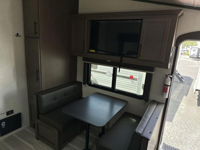 Your family of five or six will love traveling in this Cougar Sport lightweight fifth wheel! Enter to find a convenient rear kitchen layout just steps inside the door. Drop your shoes off in the shoe cubby to your right at the door, and relax on either the tri-fold sleeper sofa or at the booth dinette. The sofa and a 12 volt refrigerator are situated within the slide for added roominess. Head up the steps to a complete bath and private front bedroom featuring a queen size bed with dual shirt wardrobes and nightstands on both sides of the bed. There is also a wardrobe off the foot of the bed along the inside wall with two convenient drawers as well. The bathroom offers a shower with a skylight for added headroom and natural lighting. You will also appreciate the medicine cabinet over the sink for your personal items. Back down to the main living and kitchen area, a nice size pantry will hold all of your dry goods and snacks, and there is ample storage in the overhead cabinets above the dinette on either side of the TV, plus in the kitchen area all along the rear wall. Here you can cook your family their camp favorites using either the three burner range with oven, or overhead microwave. Outside, a 17' awning provides added living space protected from the elements!