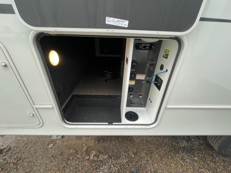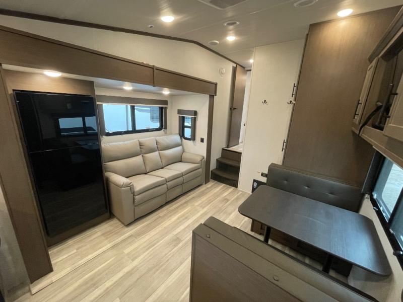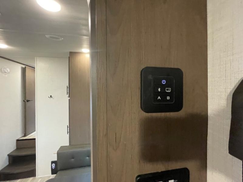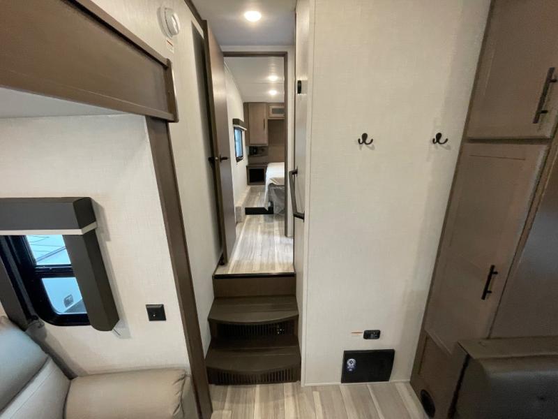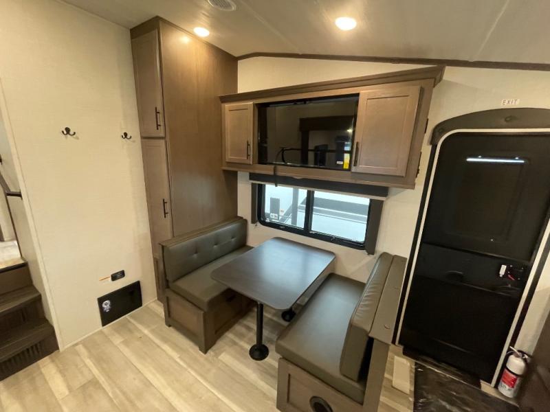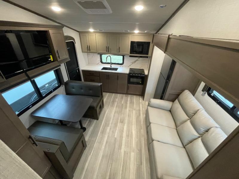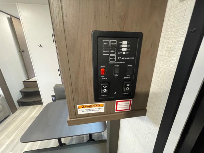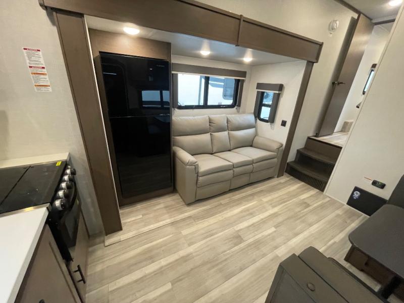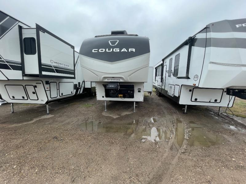 Your crew of three will love traveling in this Cougar Sport lightweight fifth wheel! Enter to find a convenient rear kitchen layout just steps inside the door. Drop your shoes off in the shoe cubby to your right at the door, and relax on either the theater seating or at the booth dinette. Head up the steps to a complete bath and private front bedroom featuring a queen size bed with dual shirt wardrobes and nightstands on both sides of the bed. The bathroom offers a shower with a skylight for added headroom and natural lighting. Back down to the main living and kitchen area, a nice size pantry will hold all of your dry goods and snacks, and there is ample storage in the overhead cabinets above the dinette on either side of the TV, plus in the kitchen area all along the rear wall. Here you can cook your family their camp favorites using either the 17" Furrion range, or overhead microwave. Outside, a 17' awning provides added living space protected from the elements!