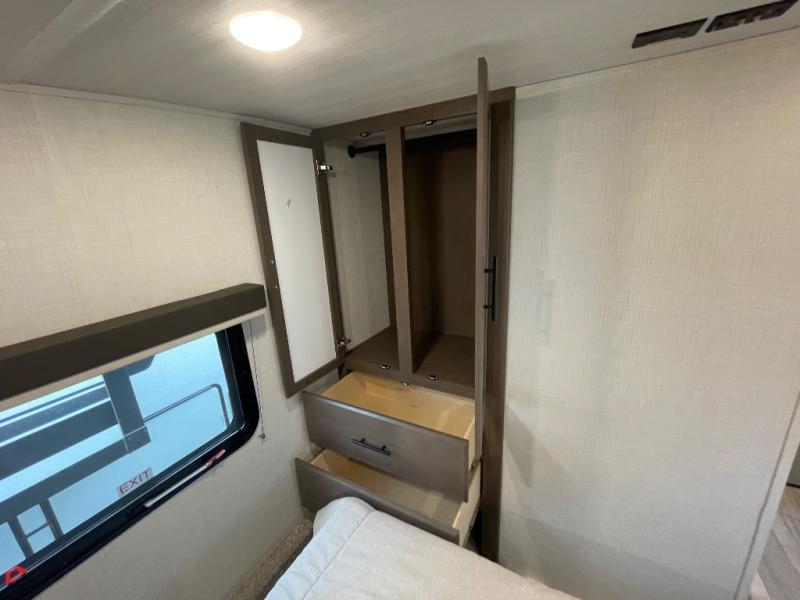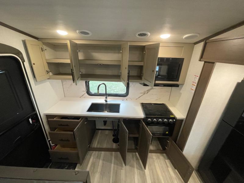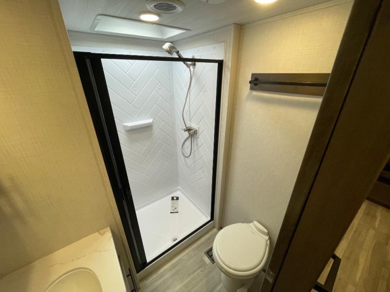 The Cougar Sport structural I-beam frame with stamped steel cross-members and outriggers, plus its AlphaPly roof membrane are what active RVers love about the construction of the Cougar line. The Cougar Sport models are no exception when it comes to a great package, as well as being smaller and lighter weight than their big brother Cougar models. A one-piece, heated and enclosed polypropylene underbelly will add protection against the elements, and the electric stabilizer jacks will provide more stability. On the inside, residential shaker style hardwood cabinet doors and decorative crown molding, plus seamless pressed countertops and an on-demand water heater will make your unit feel even more like home. You are also sure to appreciate the shiplap style decorative accent wall behind the bed, a porcelain foot flush toilet in the bathroom, plus residential kitchen hardware, and so much more.