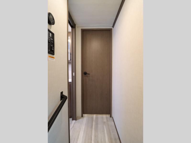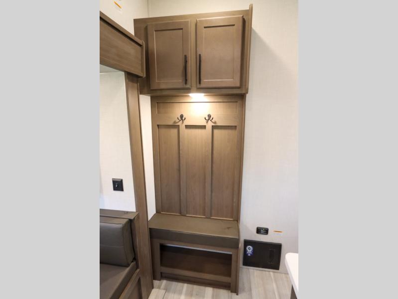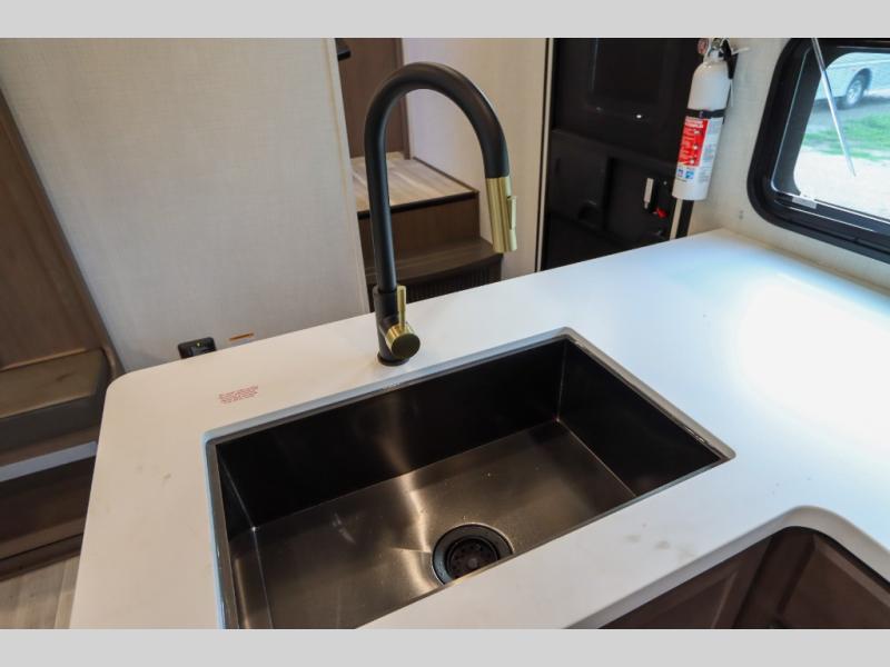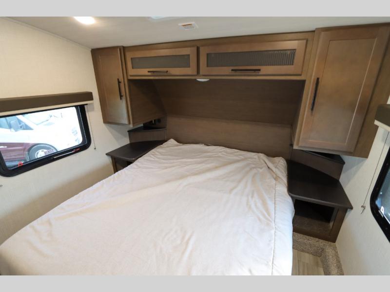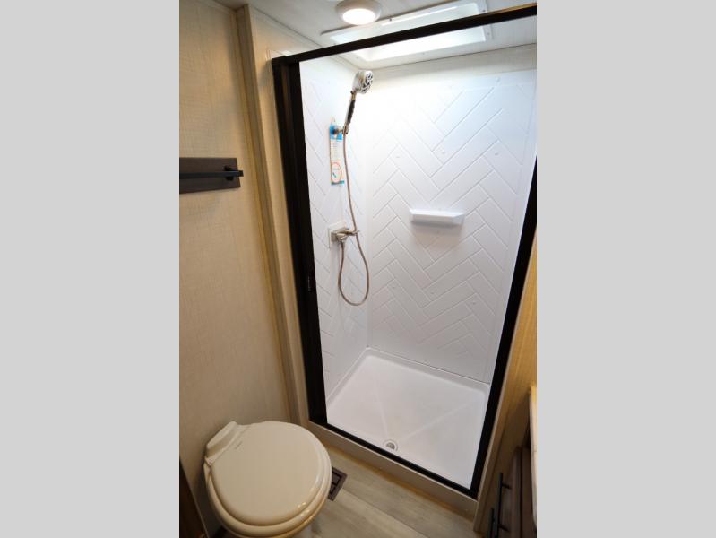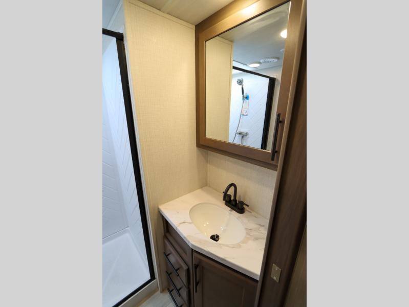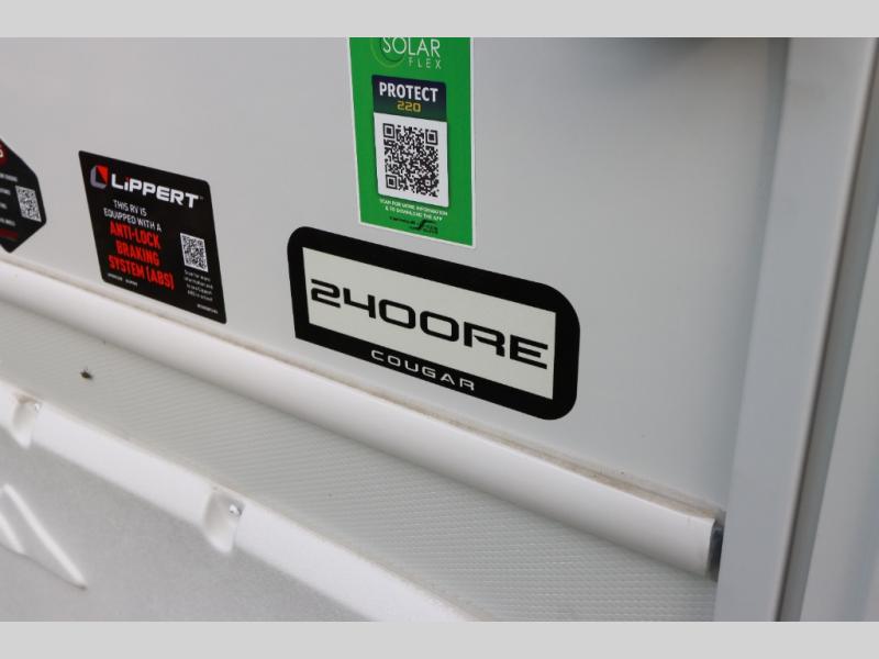 The Cougar Sport structural I-beam frame with stamped steel cross-members and outriggers, plus its laminated sidewalls with five-sided aluminum superstructure and Alpha Super Flex roof membrane are what active RVers love about the construction of the Cougar line. The Cougar Sport models are no exception when it comes to a great package, as well as being smaller and lighter weight than their big brother Cougar models. A one-piece, heated and enclosed polypropylene underbelly means a longer camping season. On the inside, residential shaker style hardwood cabinet doors and decorative crown molding, plus seamless pressed countertops and an on-demand water heater will make your unit feel even more like home. You are also sure to appreciate the shiplap style decorative accent wall behind the bed, a porcelain foot flush toilet in the bathroom, plus residential kitchen hardware, and so much more.