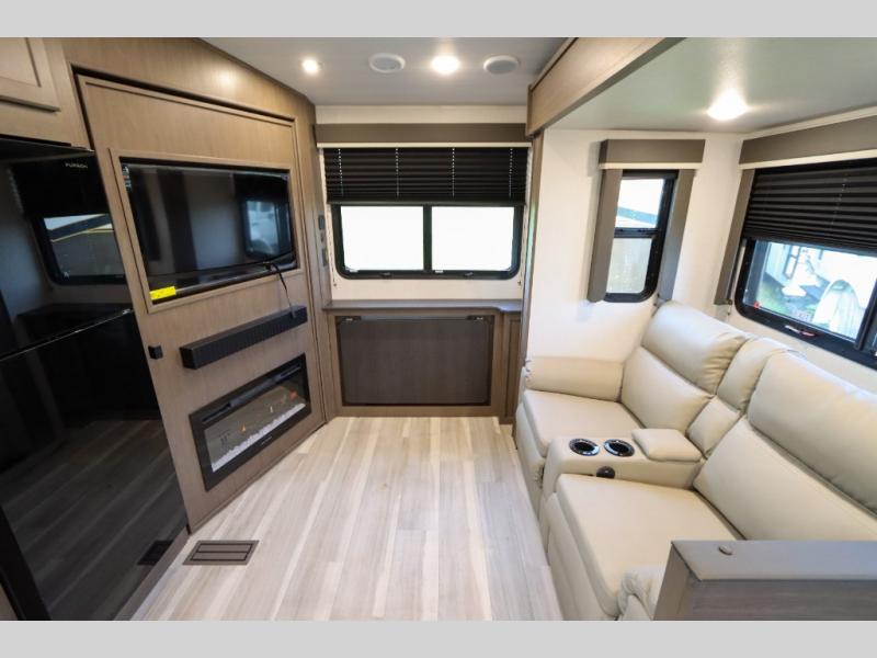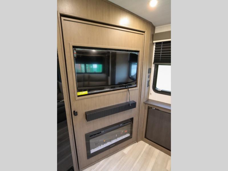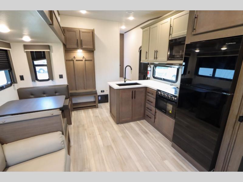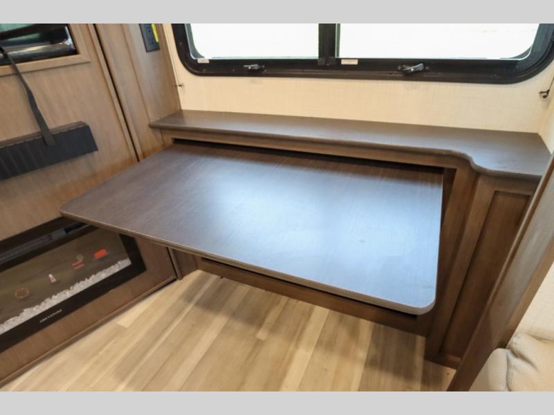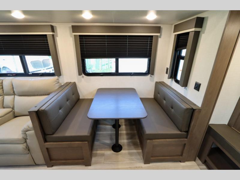 This lightweight fifth wheel is big enough for your small family to camp together! Enter to find a convenient combined kitchen and living space with large slide for added space. The slide features theater seating and a booth dinette which offers ample seating for meals and hanging out. There is a flip up table along the rear wall with a nearby 40" LED TV which features a butler pantry behind. Head up the steps to the right of the entry door to a complete bath and private front bedroom featuring a queen size bed with dual shirt wardrobes and nightstands on both sides of the bed. The bathroom offers a shower with a skylight for added headroom and natural lighting. Outside, a 16' awning provides added living space protected from the elements!