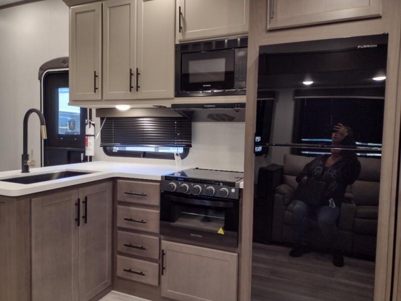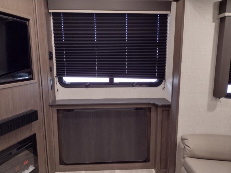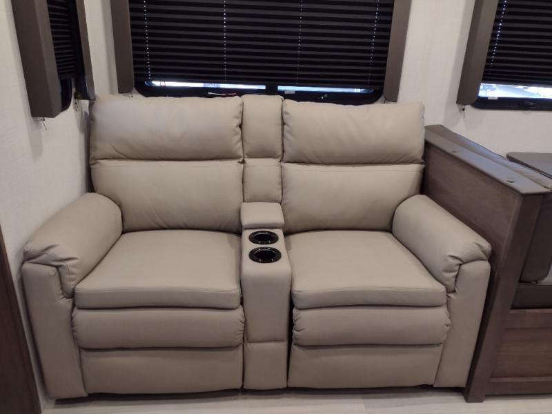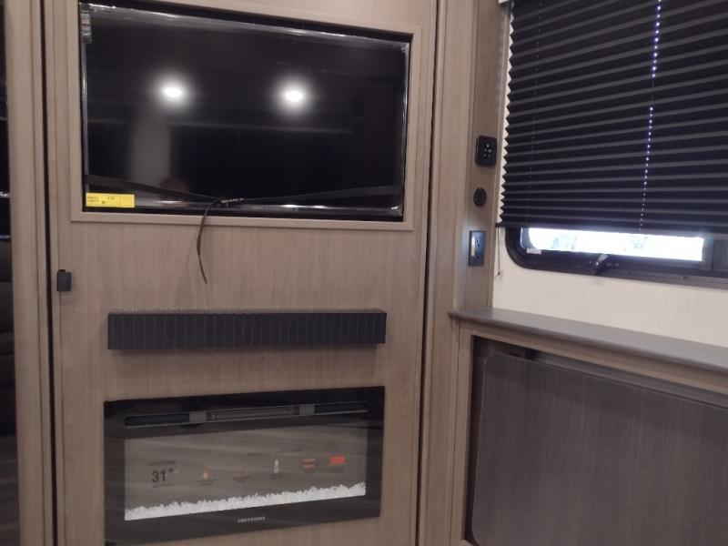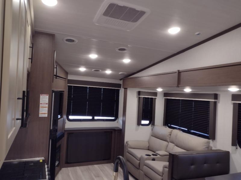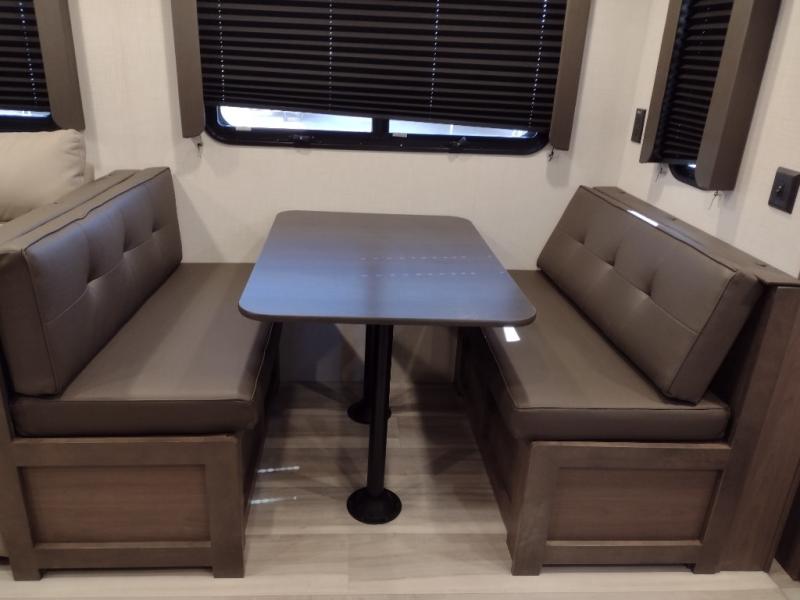 This lightweight fifth wheel is big enough for your small family to camp together! Enter to find a convenient combined kitchen and living space with large slide for added space. The slide features theater seating and a booth dinette which offers ample seating for meals and hanging out. There is a flip up table along the rear wall with a nearby 40" LED TV which features a butler pantry behind. Head up the steps to the right of the entry door to a complete bath and private front bedroom featuring a queen size bed with dual nightstands on both sides of the bed. The bathroom offers a shower with a skylight for added headroom and natural lighting. Outside, a 16' awning provides added living space protected from the elements!