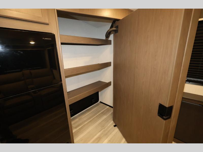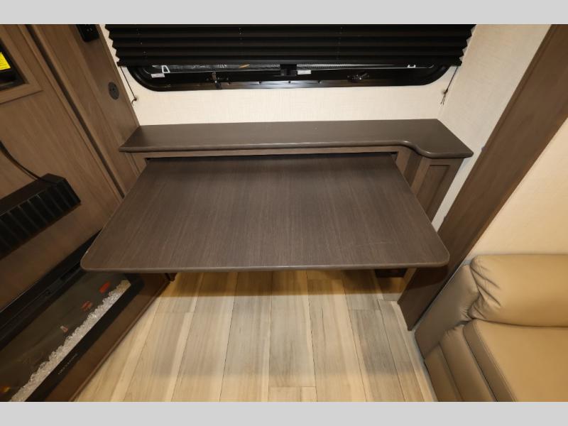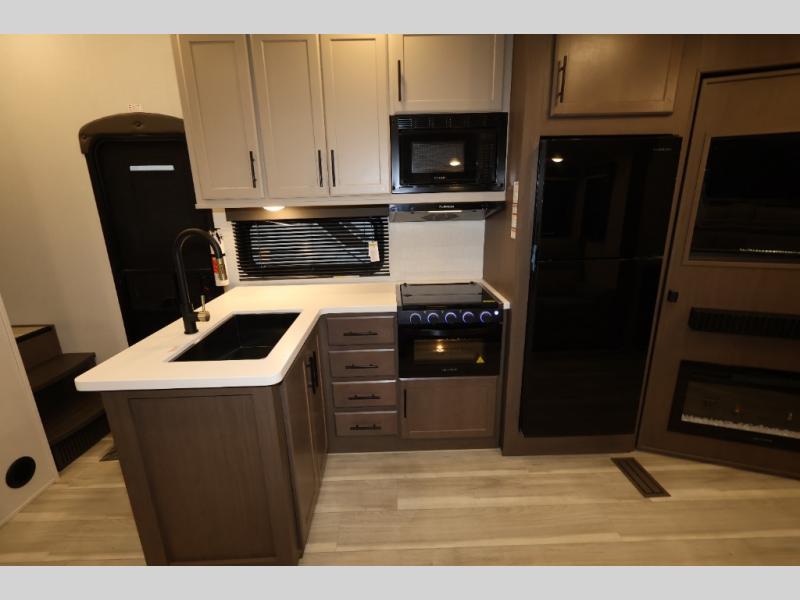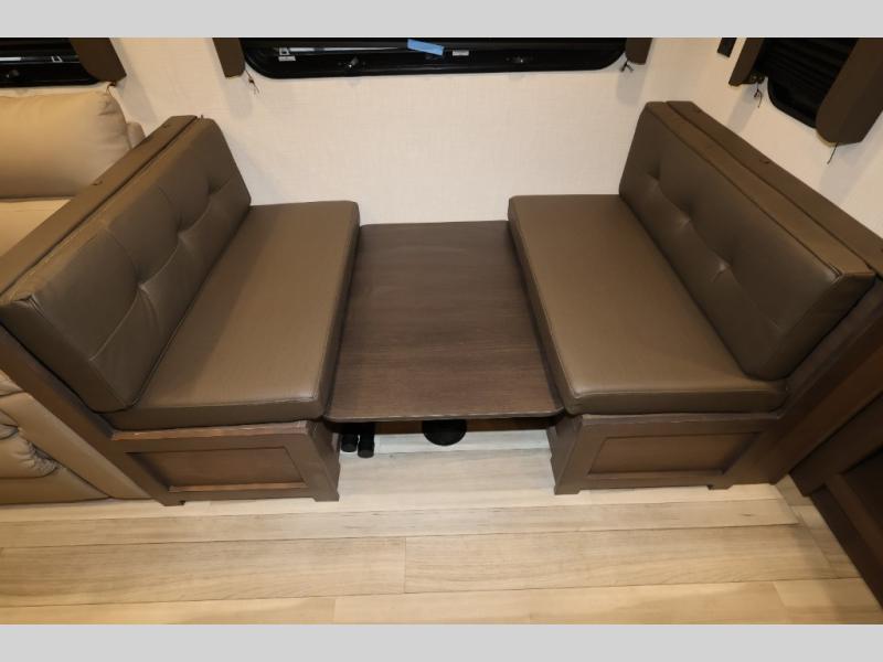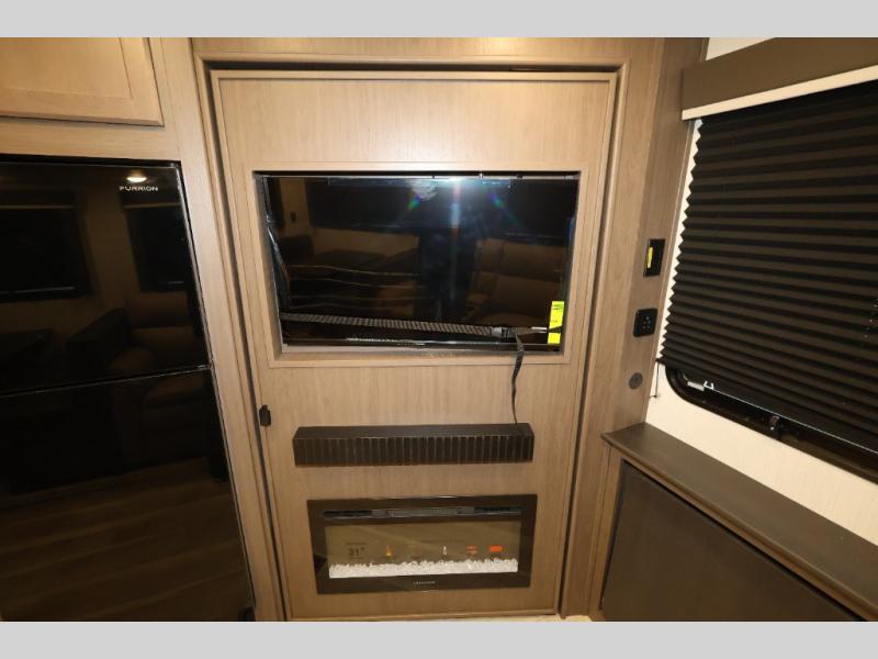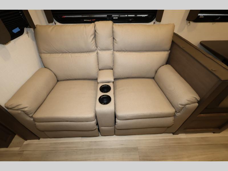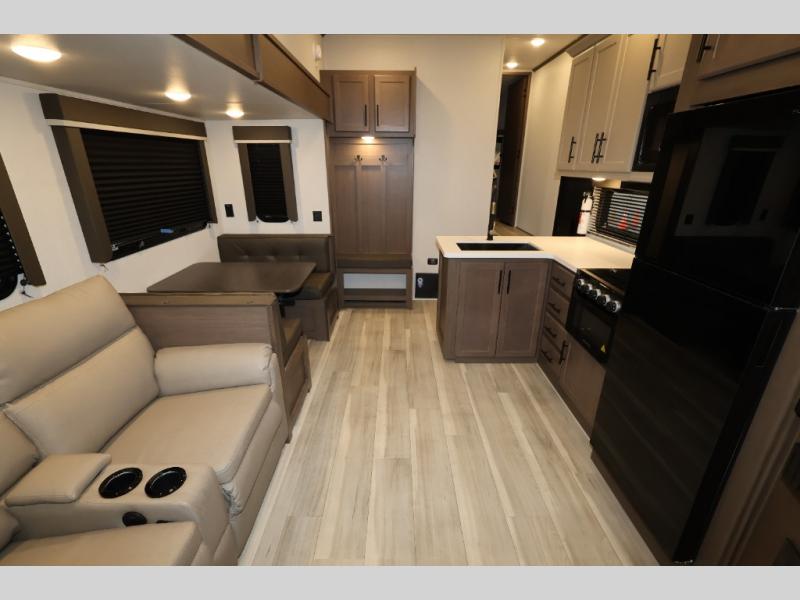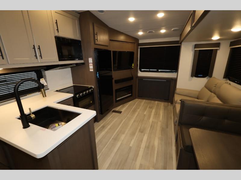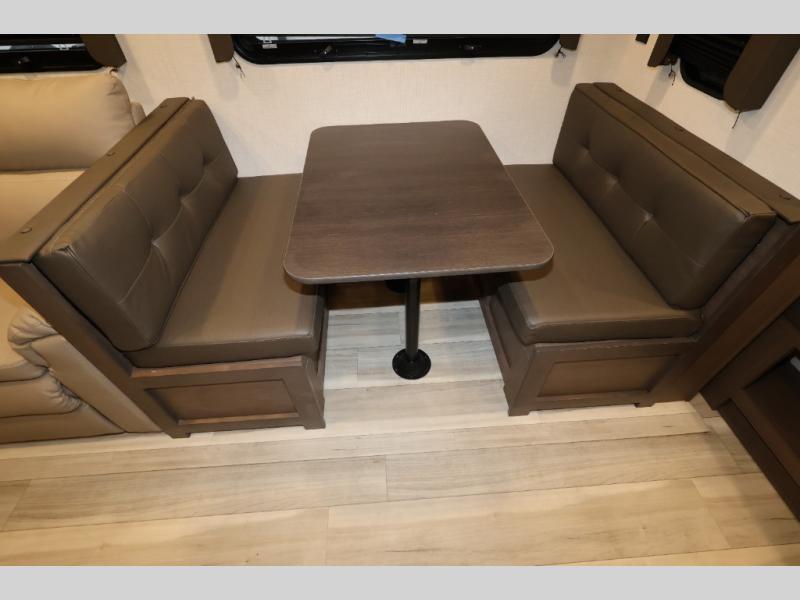 This lightweight fifth wheel is big enough for your small family to camp together! Enter to find a convenient combined kitchen and living space with large slide for added space. The slide features theater seating and a booth dinette which offers ample seating for meals and hanging out. There is a flip up table along the rear wall with a nearby 40" LED TV which features a butler pantry behind. Head up the steps to the right of the entry door to a complete bath and private front bedroom featuring a queen size bed with dual nightstands on both sides of the bed. The bathroom offers a shower with a skylight for added headroom and natural lighting. Outside, a 16' awning provides added living space protected from the elements!