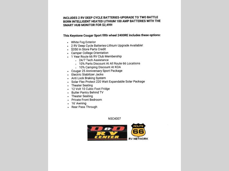 This Keystone Cougar Sport fifth wheel 2400RE includes these options: