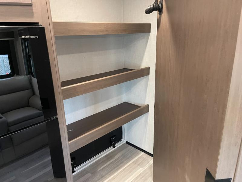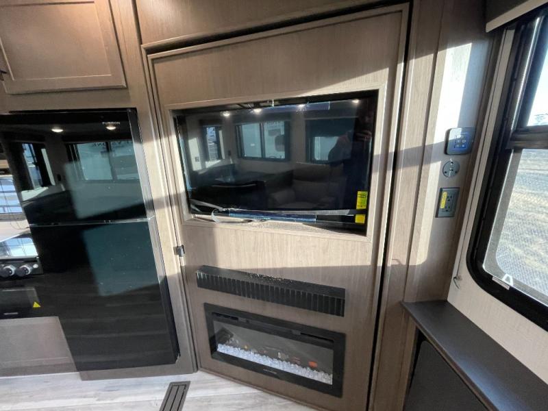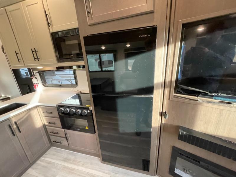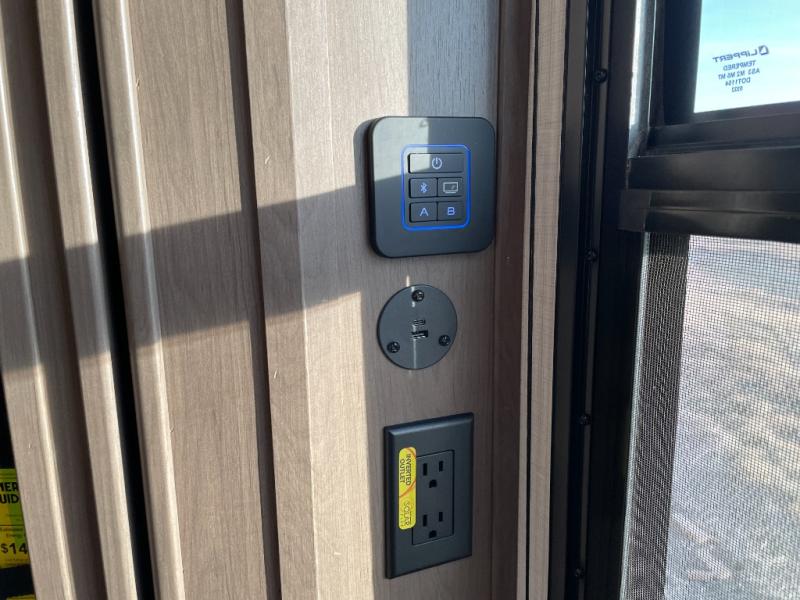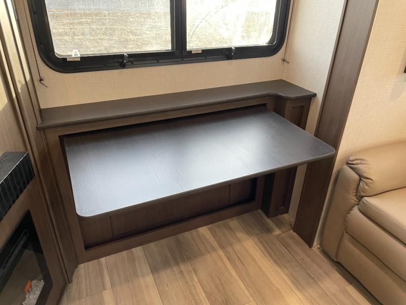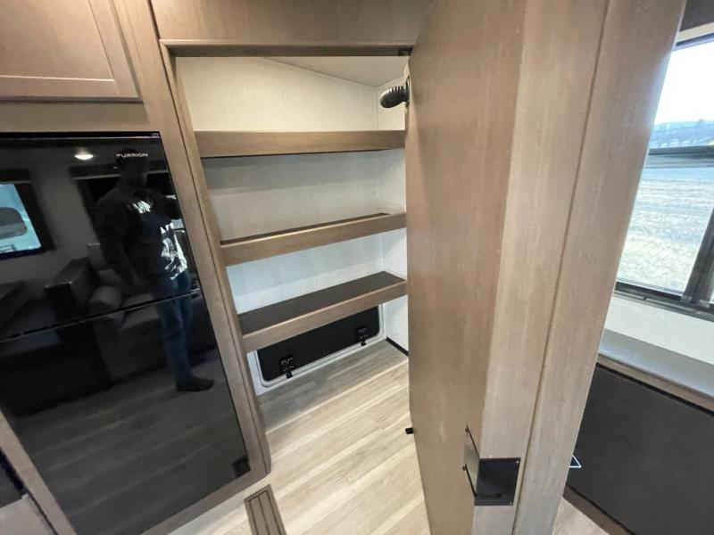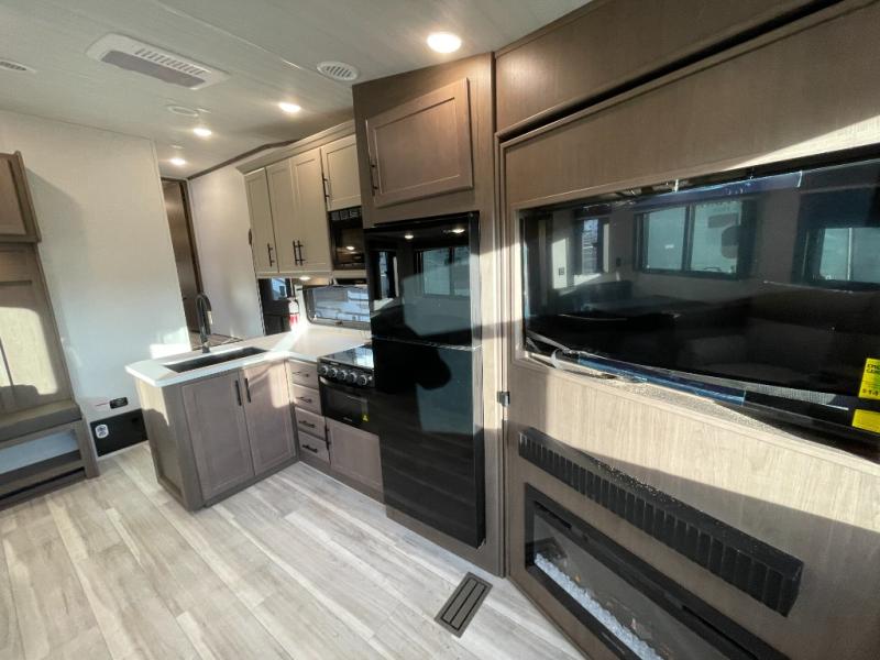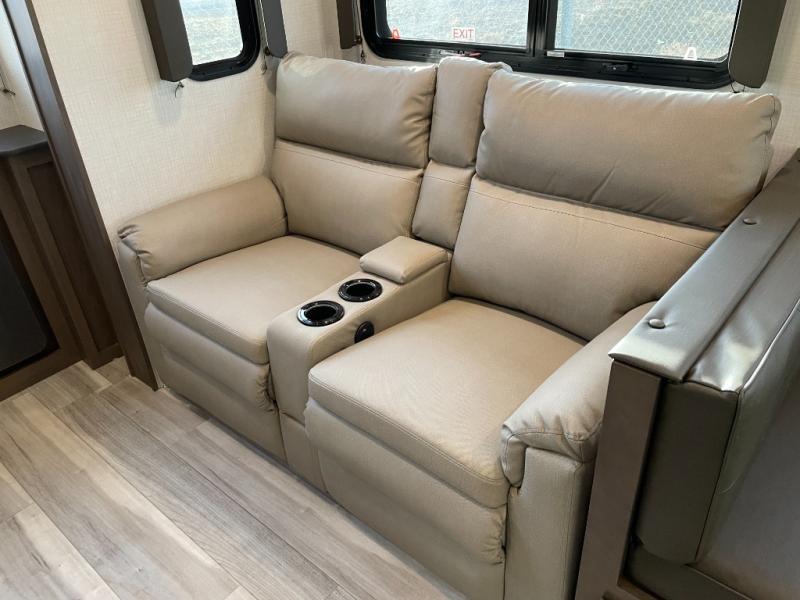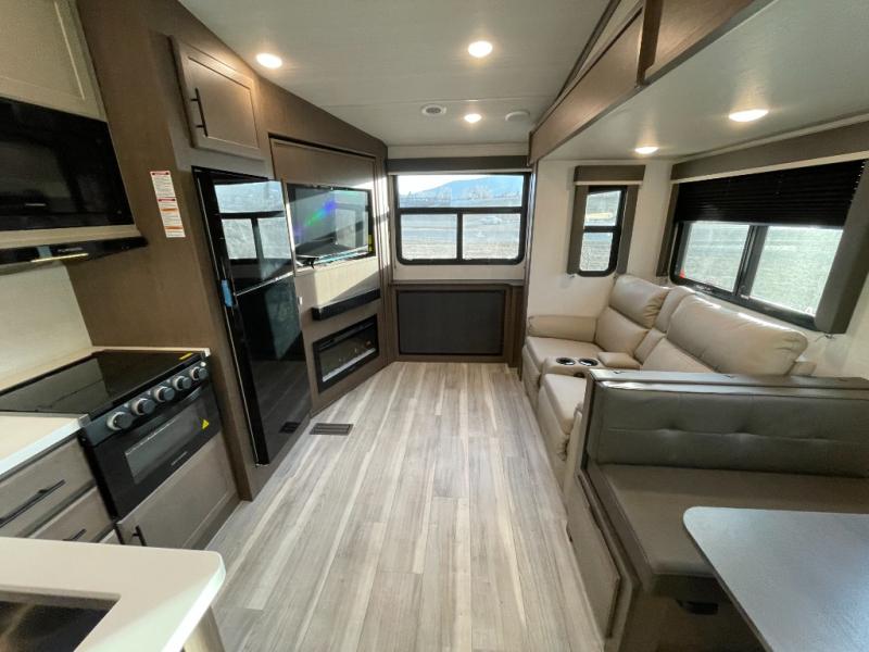 This lightweight fifth wheel is big enough for your small family to camp together! Enter to find a convenient combined kitchen and living space with large slide for added space. The slide features theater seating and a booth dinette which offers ample seating for meals and hanging out. There is a flip up table along the rear wall with a nearby 40" LED TV which features a butler pantry behind. Head up the steps to the right of the entry door to a complete bath and private front bedroom featuring a queen size bed with dual nightstands on both sides of the bed. The bathroom offers a shower with a skylight for added headroom and natural lighting. Outside, a 16' awning provides added living space protected from the elements!