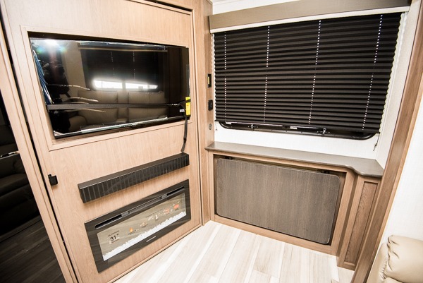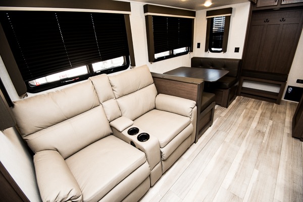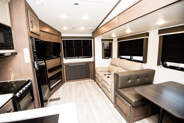 This lightweight fifth wheel is big enough for your small family to camp together! Enter to find a convenient combined kitchen and living space with large slide for added space. The slide features theater seating and a booth dinette which offers ample seating for meals and hanging out. There is a flip up table along the rear wall with a nearby 40" LED TV which features a butler pantry behind. Head up the steps to the right of the entry door to a complete bath and private front bedroom featuring a queen size bed with dual nightstands on both sides of the bed. The bathroom offers a shower with a skylight for added headroom and natural lighting. Outside, a 16' awning provides added living space protected from the elements!