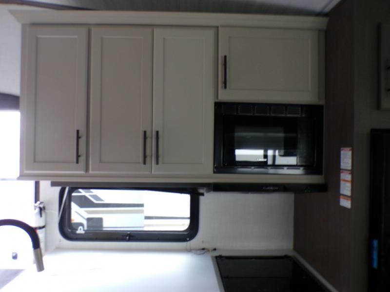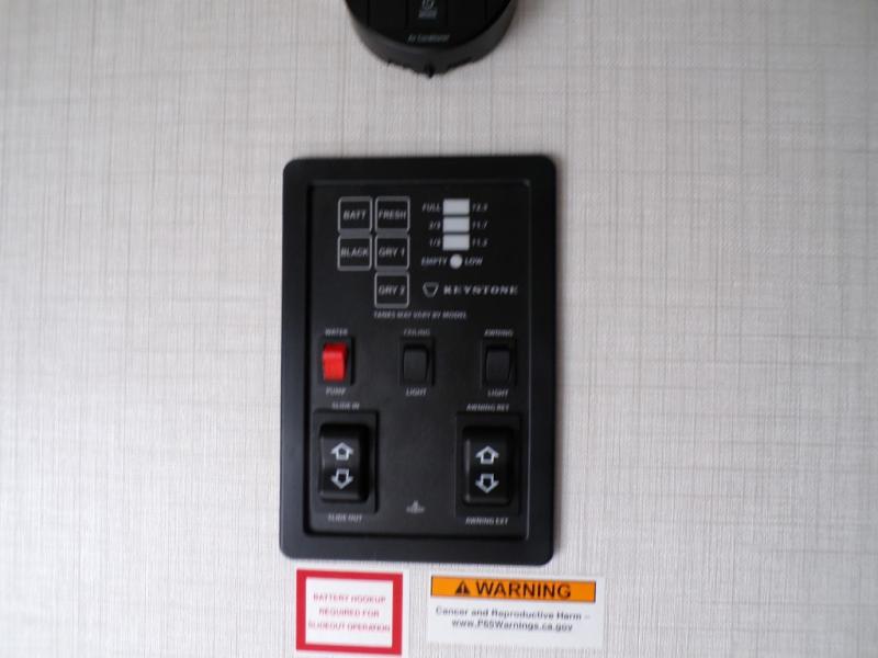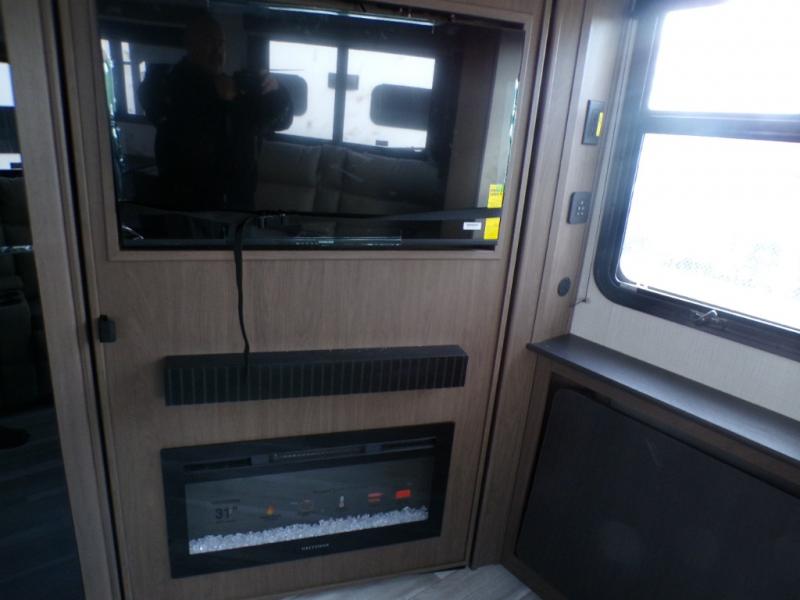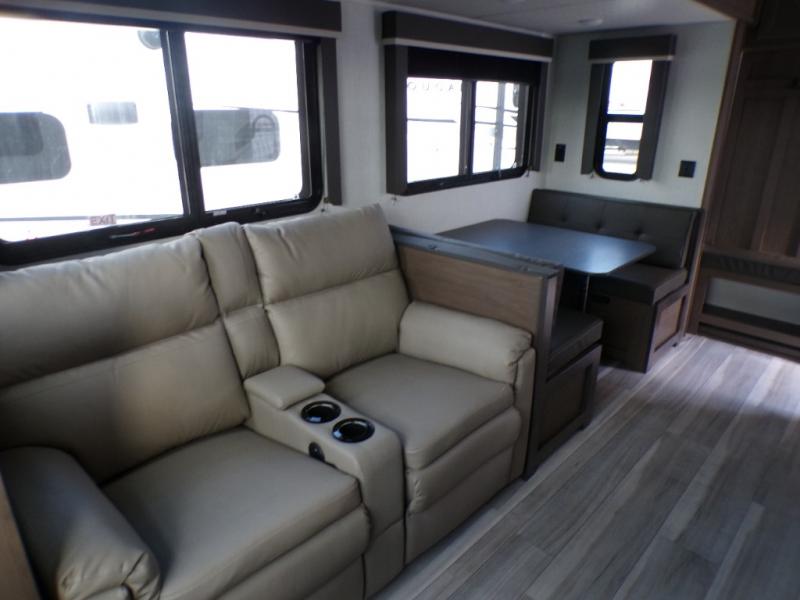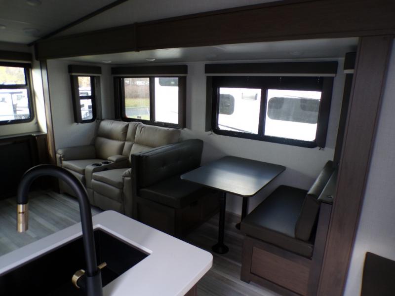 This lightweight fifth wheel is big enough for your small family to camp together! Enter to find a convenient combined kitchen and living space with large slide for added space. The slide features theater seating and a booth dinette which offers ample seating for meals and hanging out. There is a flip up table along the rear wall with a nearby 40" LED TV which features a butler pantry behind. Head up the steps to the right of the entry door to a complete bath and private front bedroom featuring a queen size bed with dual nightstands on both sides of the bed. The bathroom offers a shower with a skylight for added headroom and natural lighting. Outside, a 16' awning provides added living space protected from the elements!
