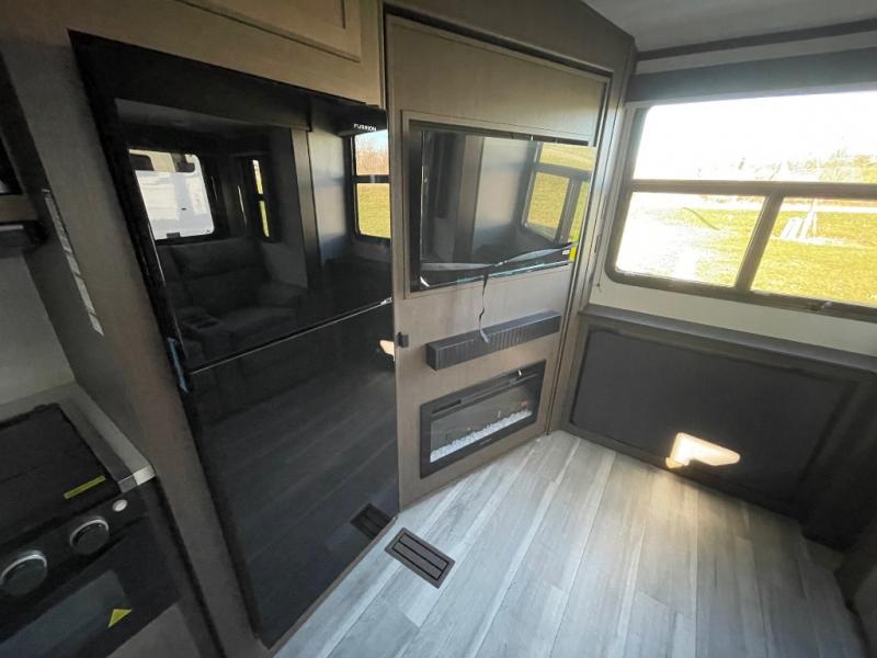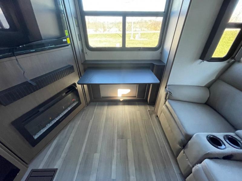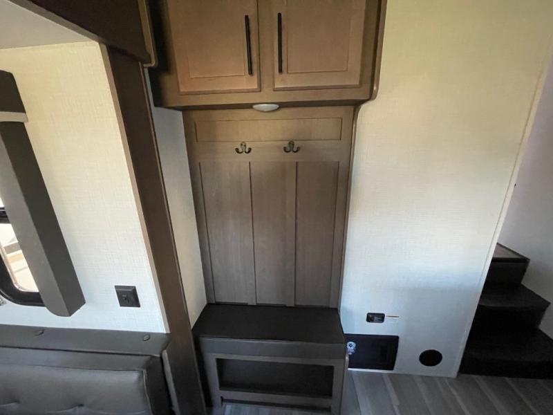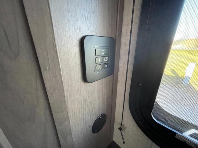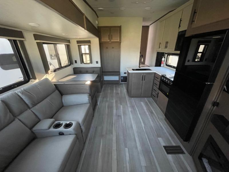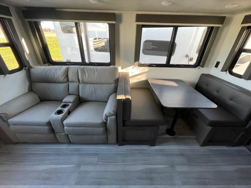 This lightweight fifth wheel is big enough for your small family to camp together! Enter to find a convenient combined kitchen and living space with large slide for added space. The slide features theater seating and a booth dinette which offers ample seating for meals and hanging out. There is a flip up table along the rear wall with a nearby 40" LED TV which features a butler pantry behind. Head up the steps to the right of the entry door to a complete bath and private front bedroom featuring a queen size bed with dual nightstands on both sides of the bed. The bathroom offers a shower with a skylight for added headroom and natural lighting. Outside, a 16' awning provides added living space protected from the elements!