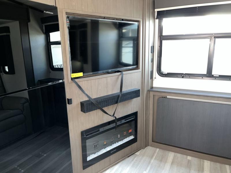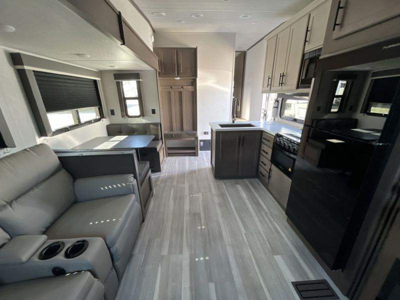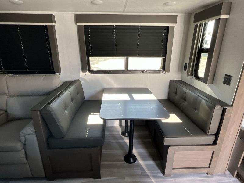This lightweight fifth wheel is big enough for your small family to camp together! Enter to find a convenient combined kitchen and living space with large slide for added space. The slide features theater seating and a booth dinette which offers ample seating for meals and hanging out. There is a flip up table along the rear wall with a nearby 40" LED TV which features a butler pantry behind. Head up the steps to the right of the entry door to a complete bath and private front bedroom featuring a queen size bed with dual nightstands on both sides of the bed. The bathroom offers a shower with a skylight for added headroom and natural lighting. Outside, a 16' awning provides added living space protected from the elements!