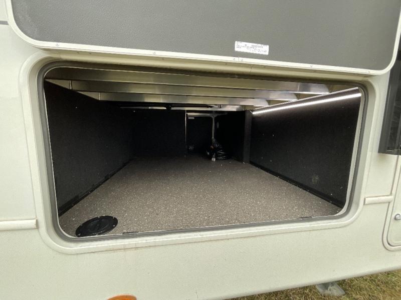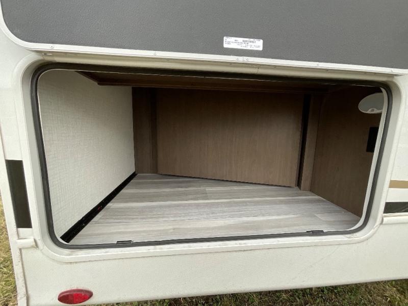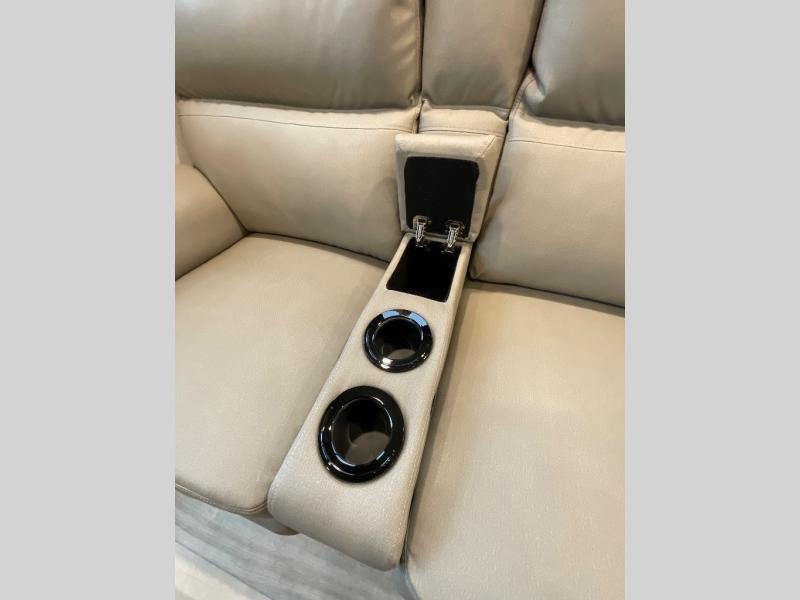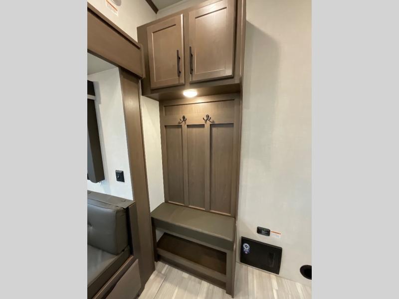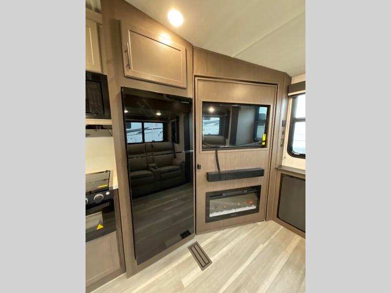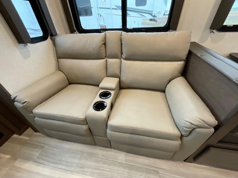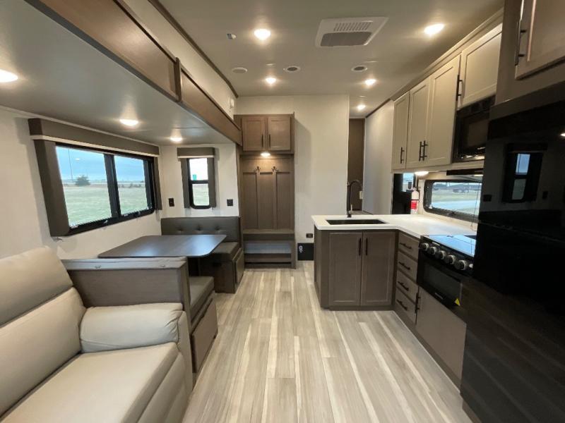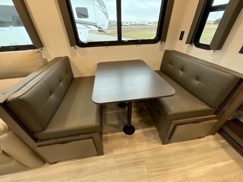This lightweight fifth wheel is big enough for your small family to camp together! Enter to find a convenient combined kitchen and living space with large slide for added space. The slide features theater seating and a booth dinette which offers ample seating for meals and hanging out. There is a flip up table along the rear wall with a nearby 40" LED TV which features a butler pantry behind. Head up the steps to the right of the entry door to a complete bath and private front bedroom featuring a queen size bed with dual nightstands on both sides of the bed. The bathroom offers a shower with a skylight for added headroom and natural lighting. Outside, a 16' awning provides added living space protected from the elements!