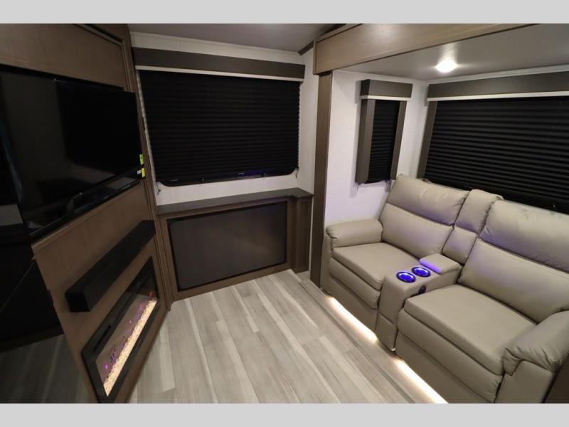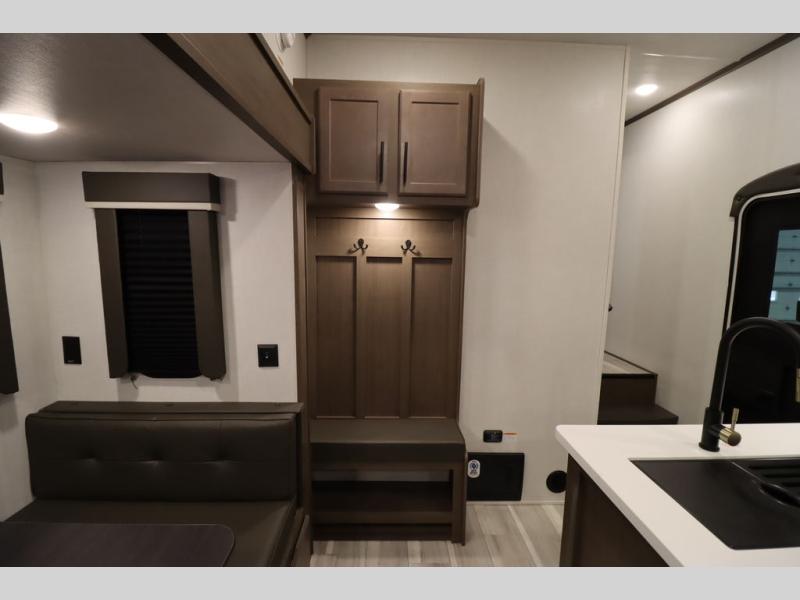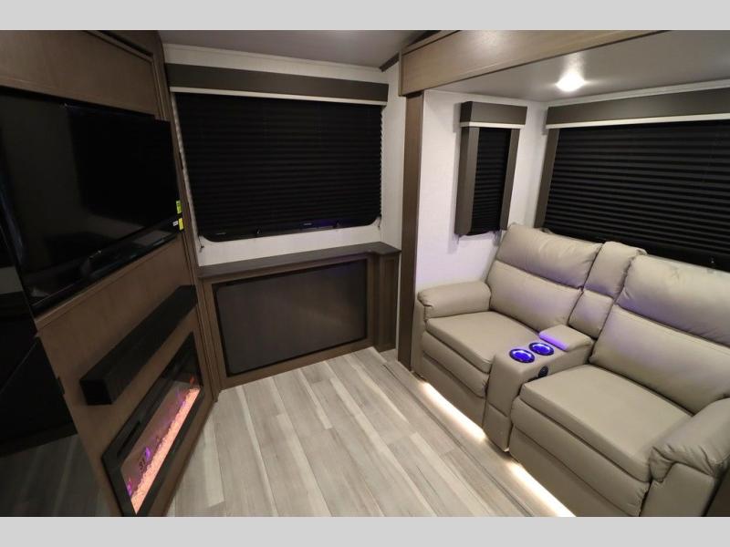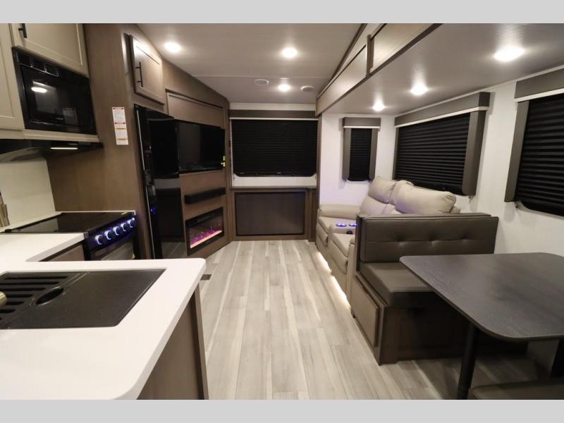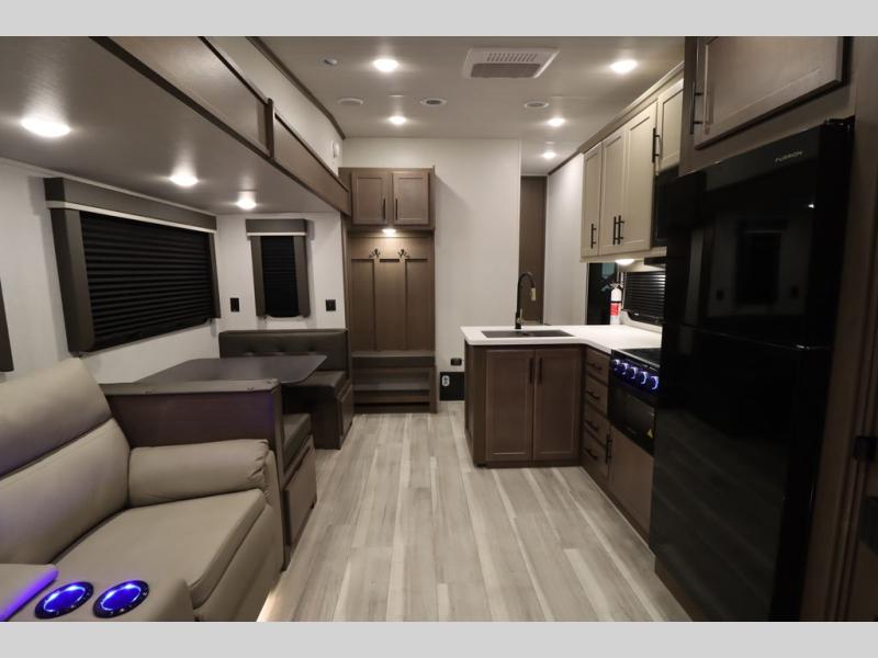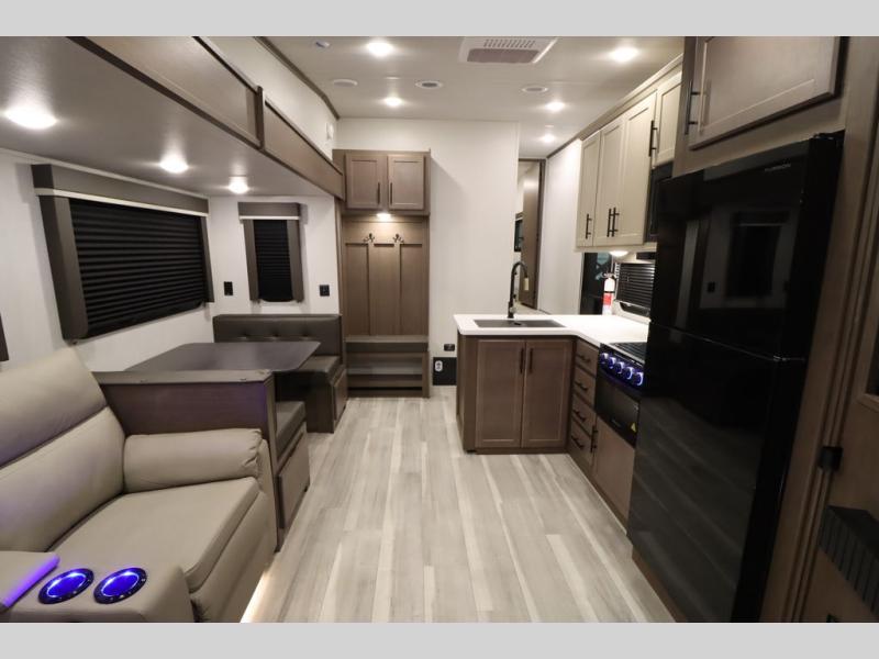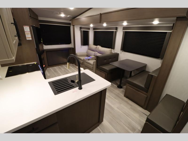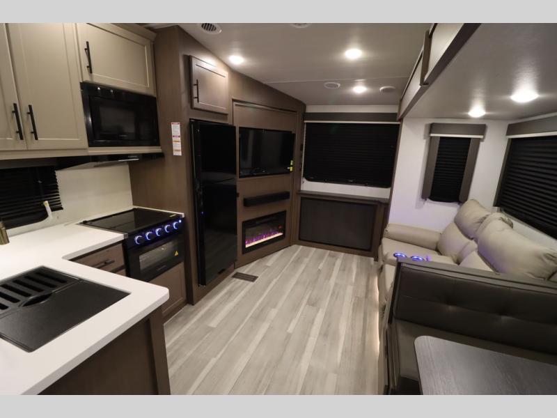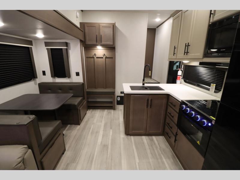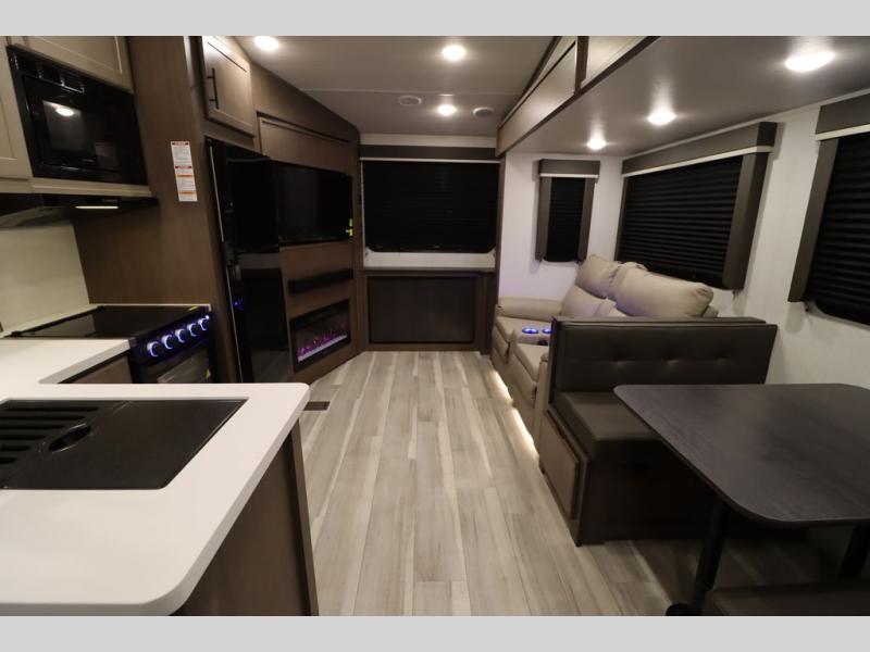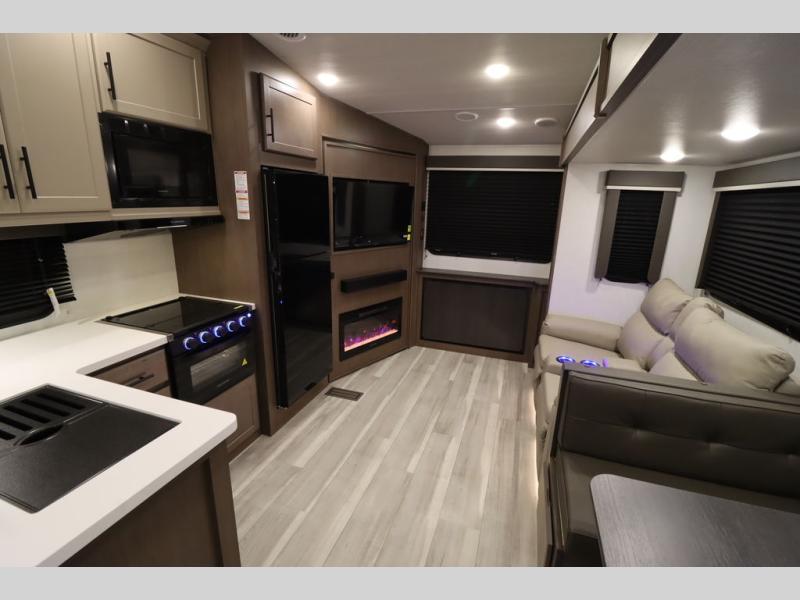 This lightweight fifth wheel is big enough for your small family to camp together! Enter to find a convenient combined kitchen and living space with large slide for added space. The slide features theater seating and a booth dinette which offers ample seating for meals and hanging out. There is a flip up table along the rear wall with a nearby 40" LED TV which features a butler pantry behind. Head up the steps to the right of the entry door to a complete bath and private front bedroom featuring a queen size bed with dual nightstands on both sides of the bed. The bathroom offers a shower with a skylight for added headroom and natural lighting. Outside, a 16' awning provides added living space protected from the elements!