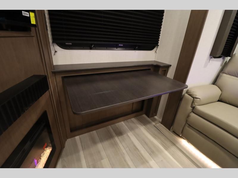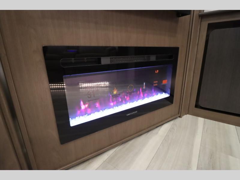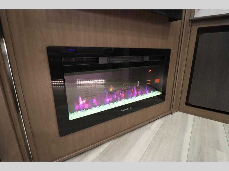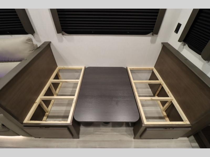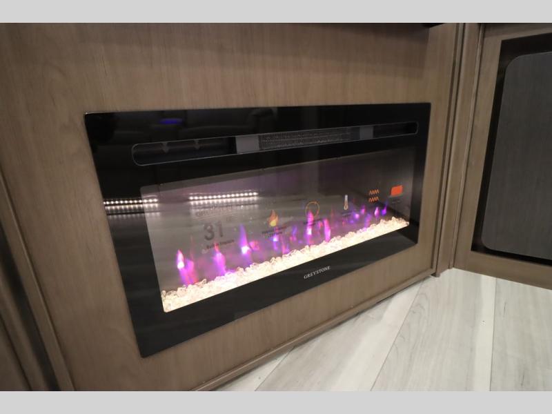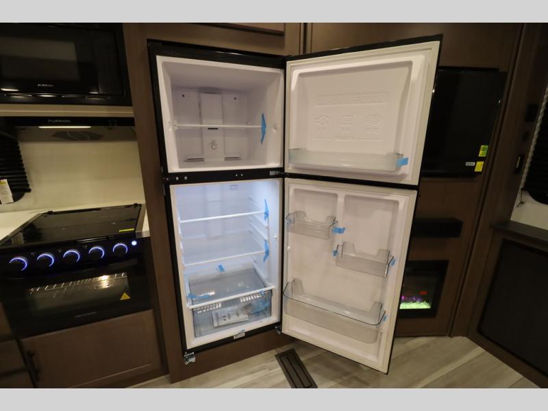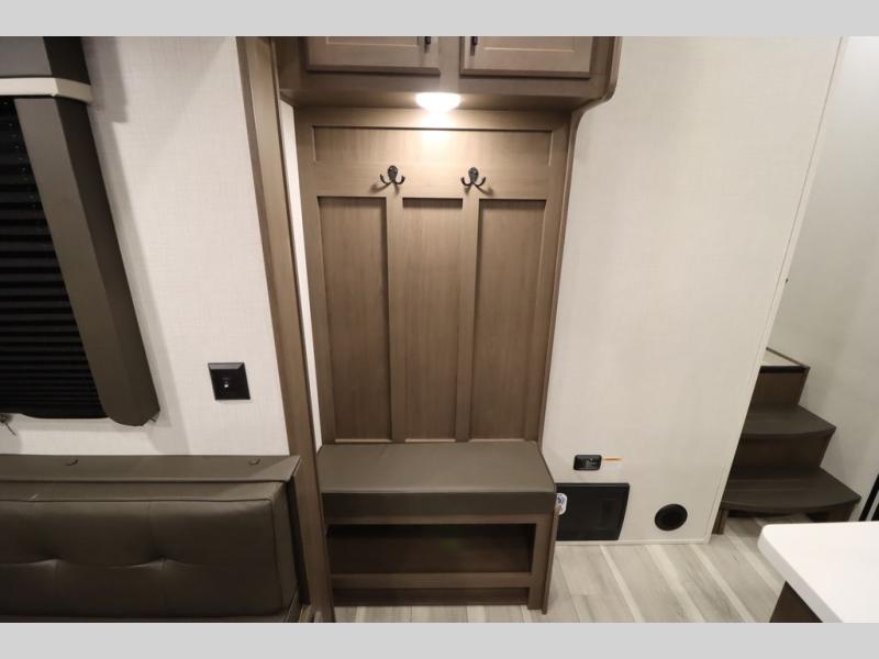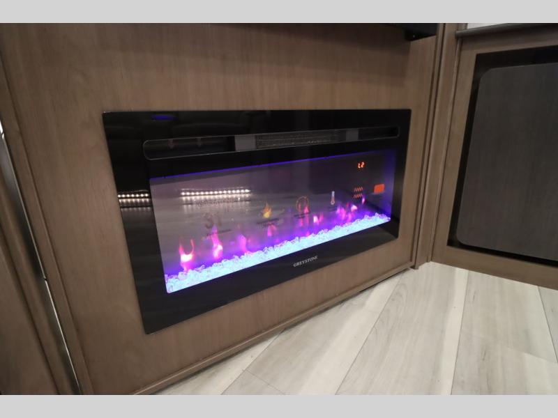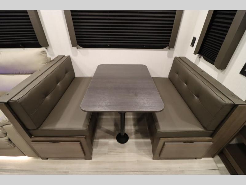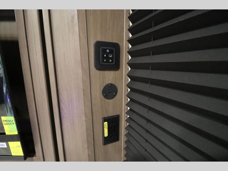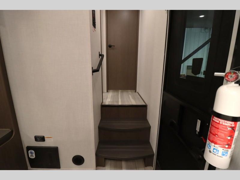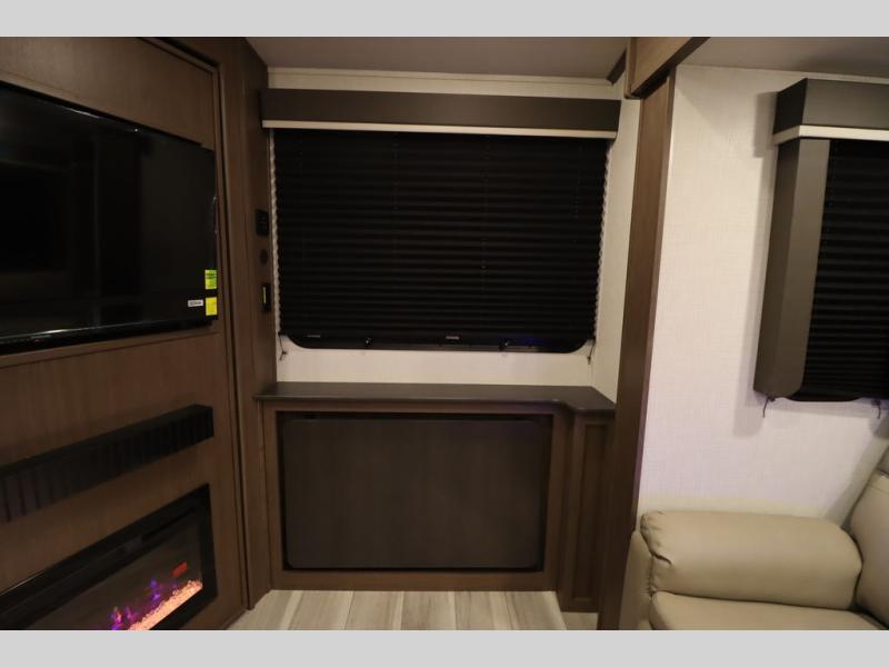 This lightweight fifth wheel is big enough for your small family to camp together! Enter to find a convenient combined kitchen and living space with large slide for added space. The slide features theater seating and a booth dinette which offers ample seating for meals and hanging out. There is a flip up table along the rear wall with a nearby 40" LED TV which features a butler pantry behind. Head up the steps to the right of the entry door to a complete bath and private front bedroom featuring a queen size bed with dual nightstands on both sides of the bed. The bathroom offers a shower with a skylight for added headroom and natural lighting. Outside, a 16' awning provides added living space protected from the elements!