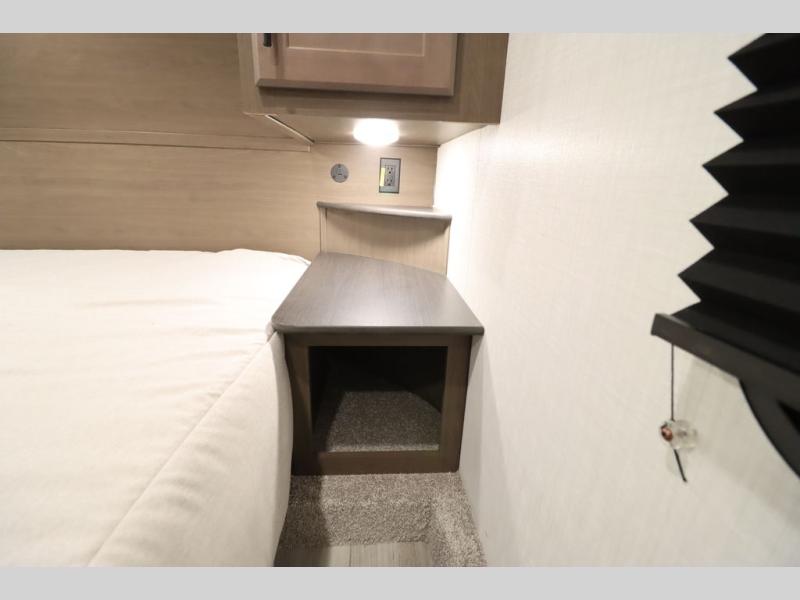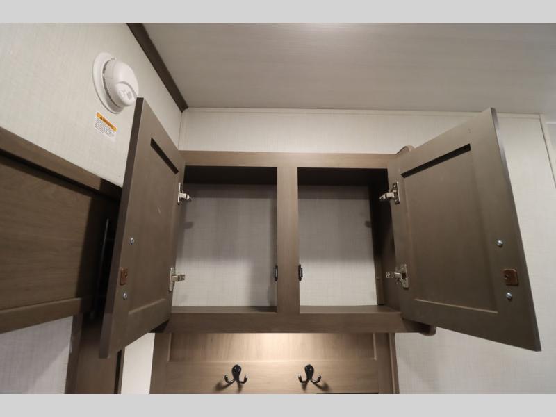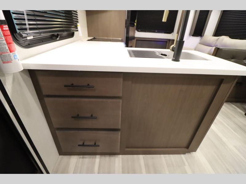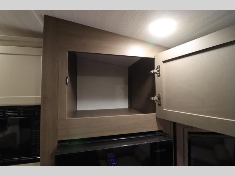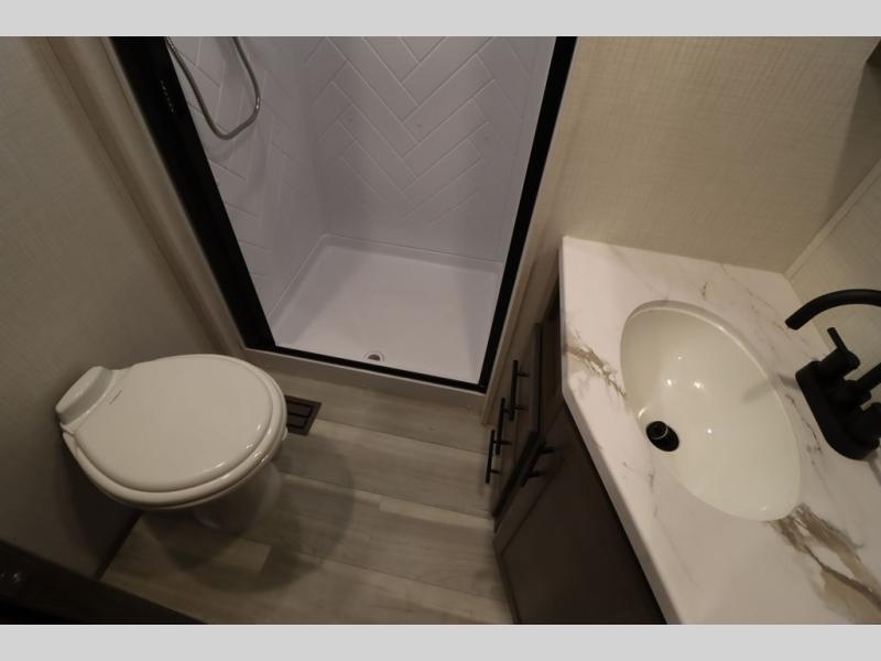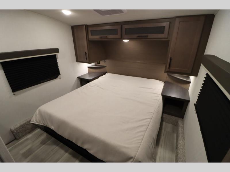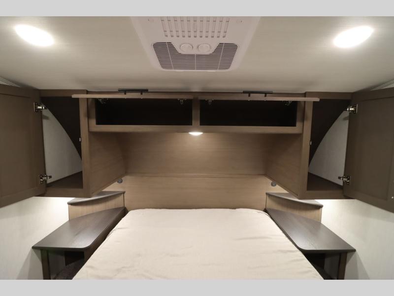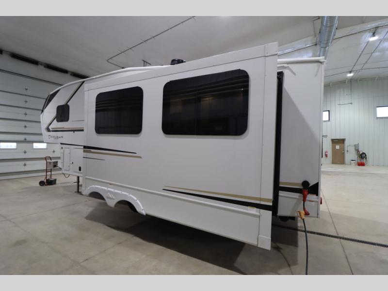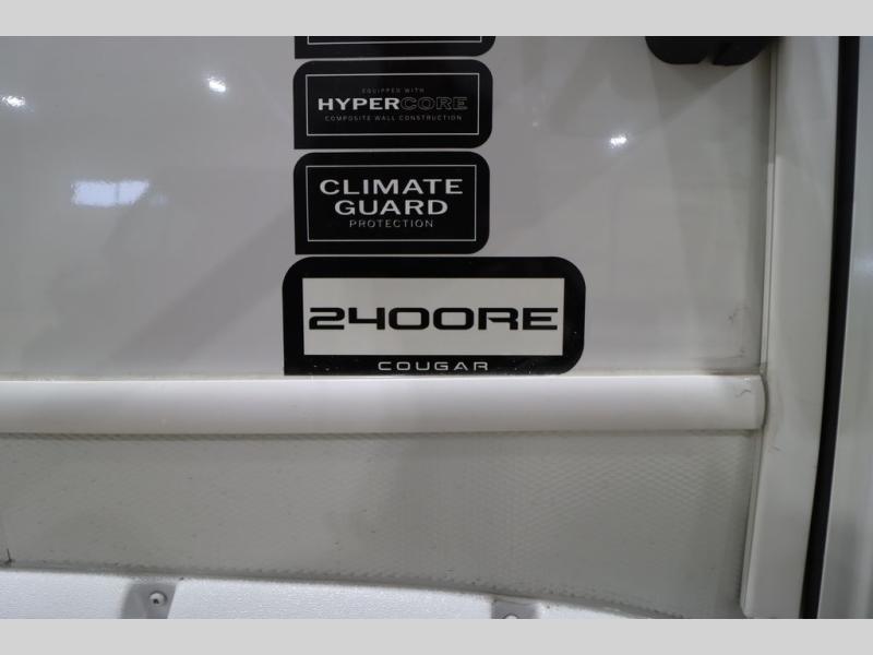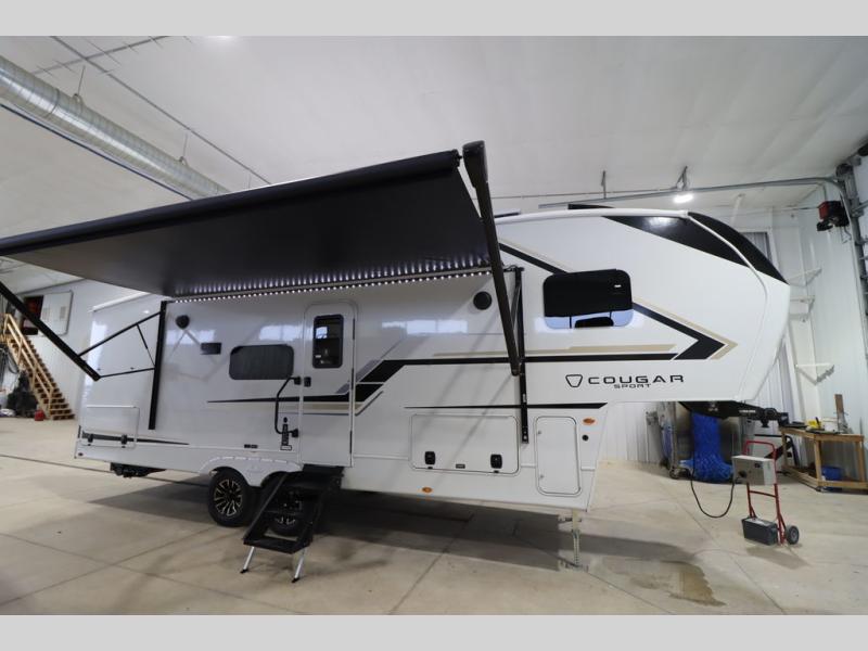 The Cougar Sport structural I-beam frame with stamped steel cross-members and outriggers, plus its AlphaPly roof membrane are what active RVers love about the construction of the Cougar line. The Cougar Sport models are no exception when it comes to a great package, as well as being smaller and lighter weight than their big brother Cougar models. A one-piece, heated and enclosed polypropylene underbelly will add protection against the elements, and the electric stabilizer jacks will provide more stability. On the inside, residential shaker style hardwood cabinet doors and decorative crown molding, plus seamless pressed countertops and an on-demand water heater will make your unit feel even more like home. You are also sure to appreciate the shiplap style decorative accent wall behind the bed, a porcelain foot flush toilet in the bathroom, plus residential kitchen hardware, and so much more.