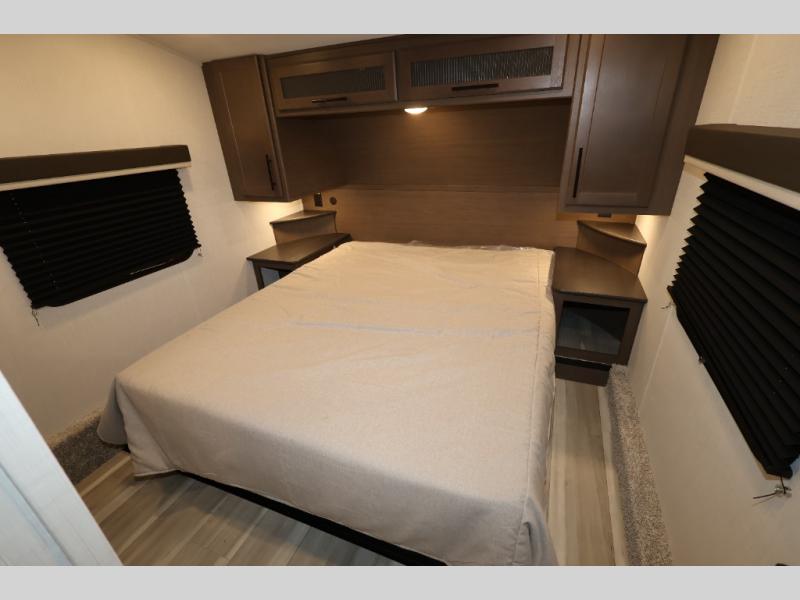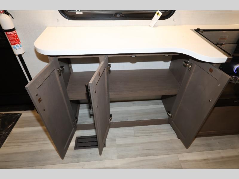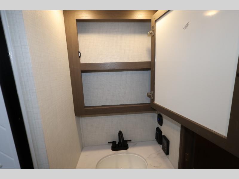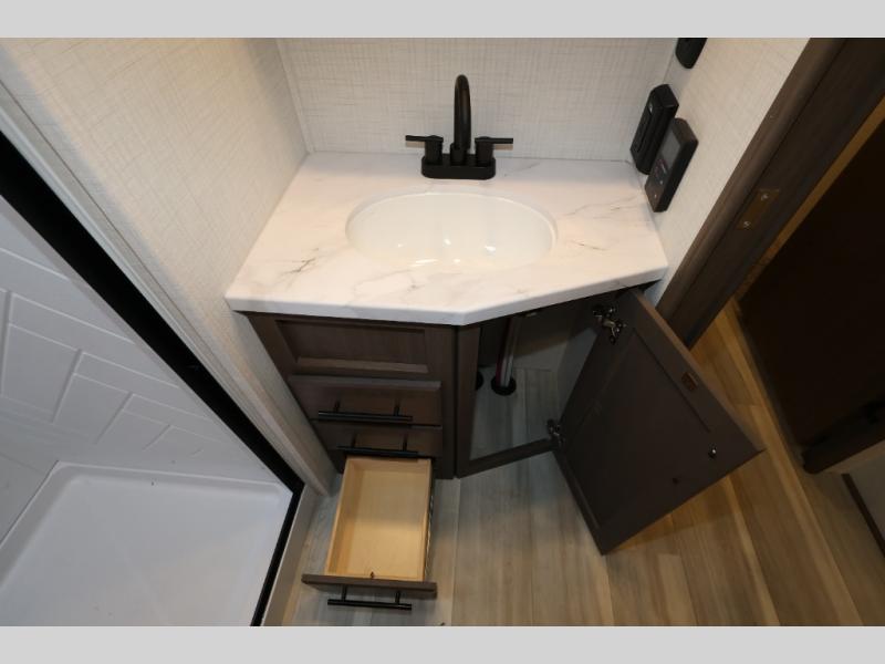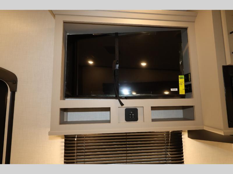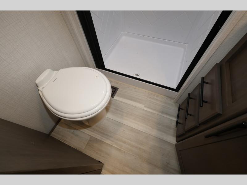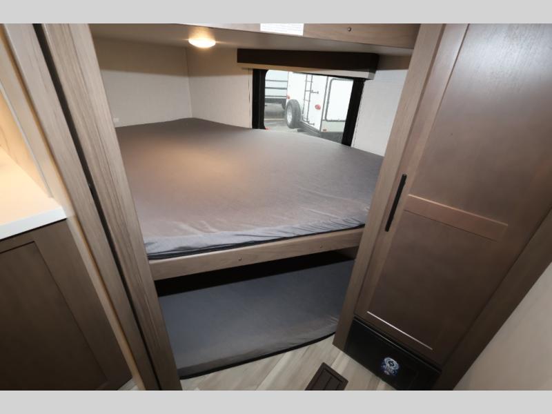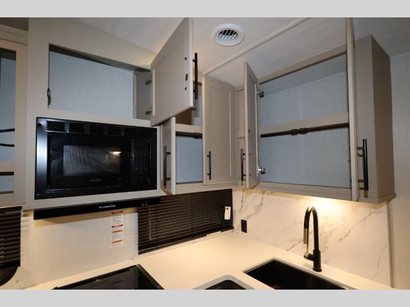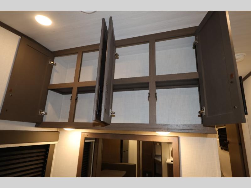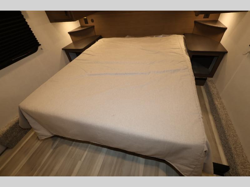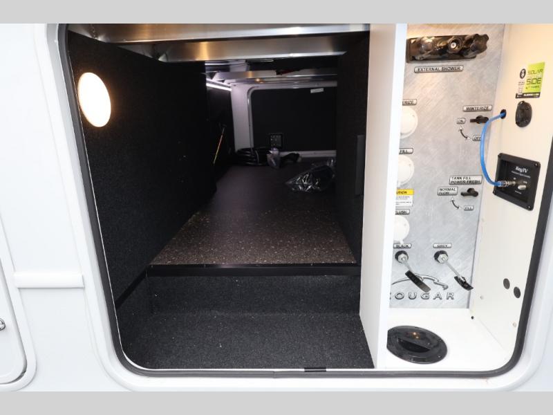 The Cougar Sport structural I-beam frame with stamped steel cross-members and outriggers, plus its laminated sidewalls with five-sided aluminum superstructure and Alpha Super Flex roof membrane are what active RVers love about the construction of the Cougar line. The Cougar Sport models are no exception when it comes to a great package, as well as being smaller and lighter weight than their big brother Cougar models. A one-piece, heated and enclosed polypropylene underbelly means a longer camping season. On the inside, residential shaker style hardwood cabinet doors and decorative crown molding, plus seamless pressed countertops and an on-demand water heater will make your unit feel even more like home. You are also sure to appreciate the shiplap style decorative accent wall behind the bed, a porcelain foot flush toilet in the bathroom, plus residential kitchen hardware, and so much more.