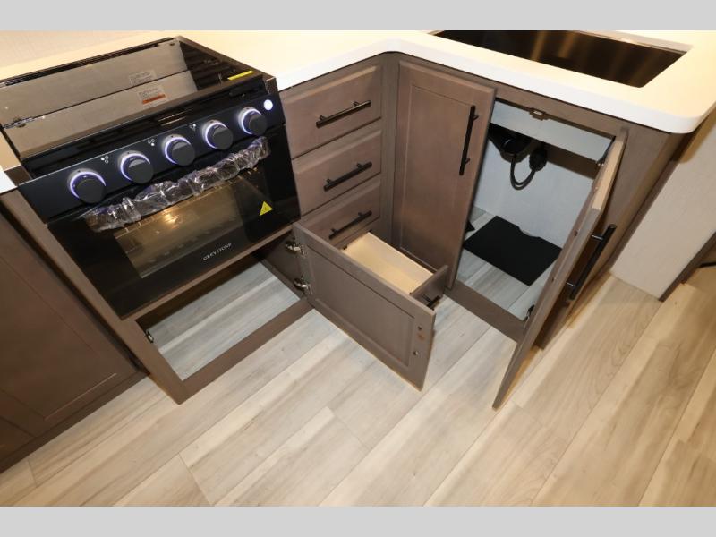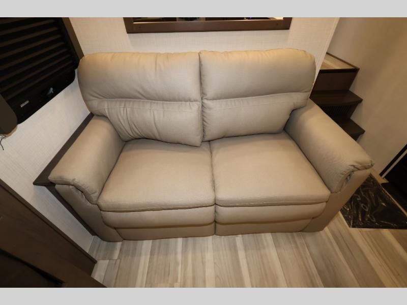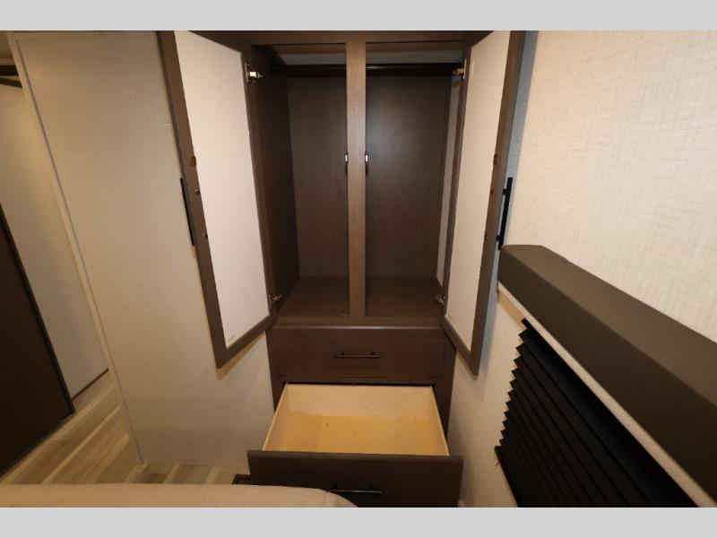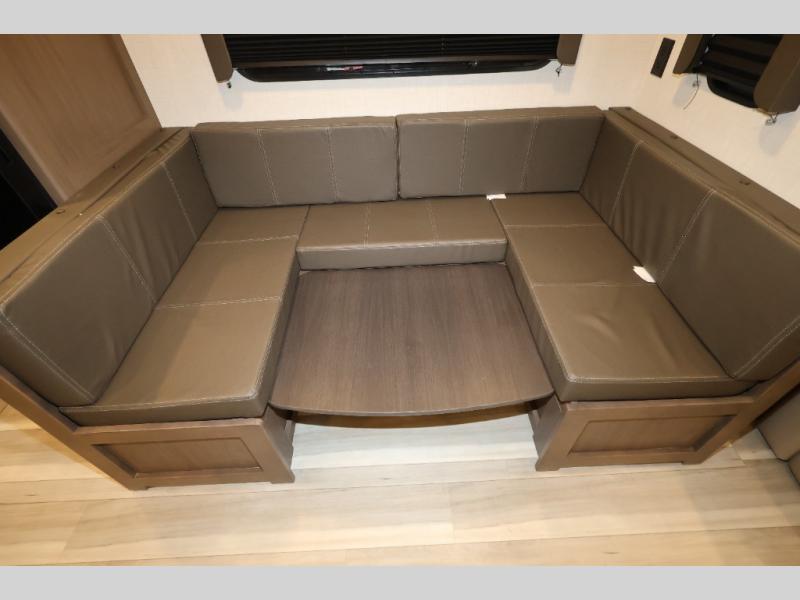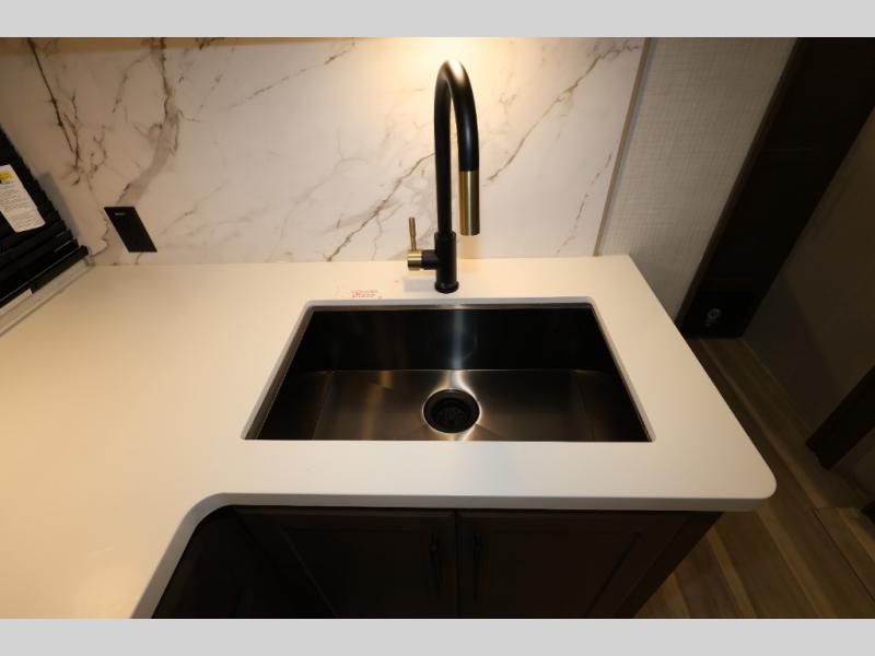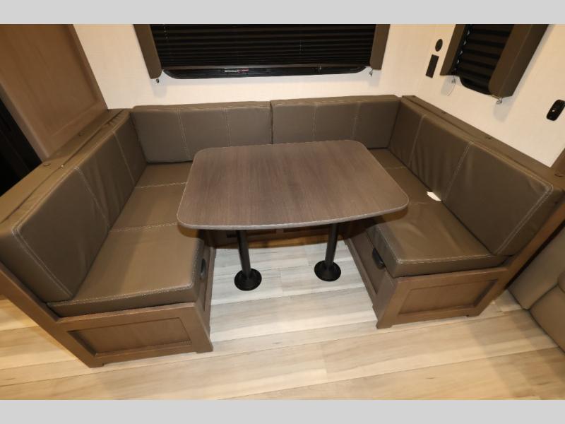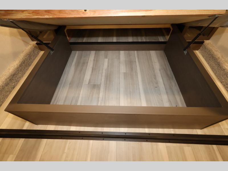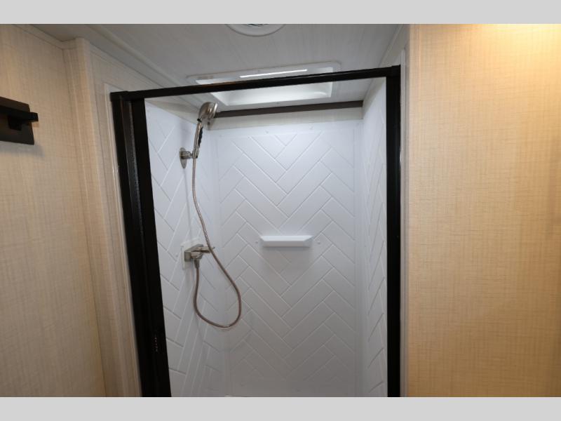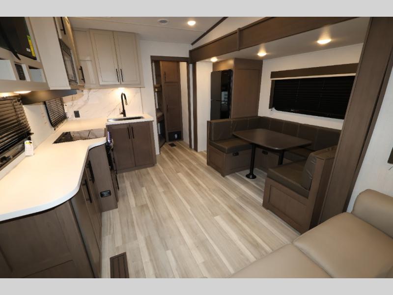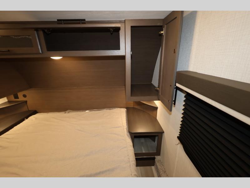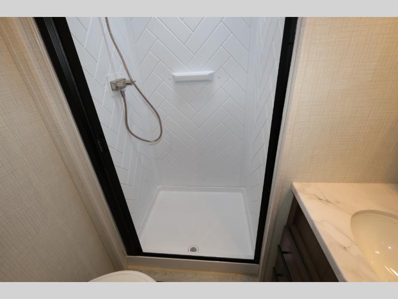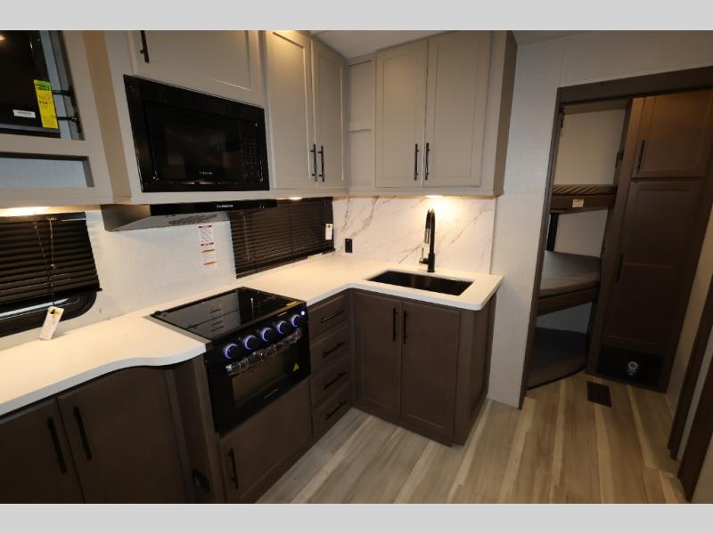 The Cougar Sport structural I-beam frame with stamped steel cross-members and outriggers, plus its laminated sidewalls with five-sided aluminum superstructure and Alpha Super Flex roof membrane are what active RVers love about the construction of the Cougar line. The Cougar Sport models are no exception when it comes to a great package, as well as being smaller and lighter weight than their big brother Cougar models. A one-piece, heated and enclosed polypropylene underbelly means a longer camping season. On the inside, residential shaker style hardwood cabinet doors and decorative crown molding, plus seamless pressed countertops and an on-demand water heater will make your unit feel even more like home. You are also sure to appreciate the shiplap style decorative accent wall behind the bed, a porcelain foot flush toilet in the bathroom, plus residential kitchen hardware, and so much more.