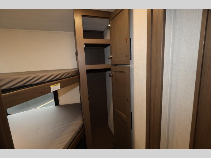 This lightweight Cougar Sport bunk model features sleeping for ten or more with triple stacked double bed bunks in the rear bunk room, a large U-shaped dinette that can be transformed into sleep space, as well as a tri-fold sofa sleeper and a queen bed in the private bedroom up front. The U-shaped dinette will seat quite a few of you for meals and even game time, plus the sofa is nearby for even more to kick back on. A fully equipped kitchen with overhead microwave, a three burner range, and large sink plus storage will make it easy to keep everyone fed and happy. A 10.4 Cu. Ft. 12 volt refrigerator will keep all of your perishable items fresh, and there are plenty of cabinets for storing snacks and dry goods as well. Head up the steps to the bathroom featuring a shower with a skylight, sink with overhead medicine cabinet, and toilet. The private front bedroom takes you away from the hustle and bustle of the main living area and bunkhouse to provide a relaxing retreat including a comfy queen bed, dual nightstands and shirt wardrobes as well as an additional wardrobe along the interior wall for even more storage.