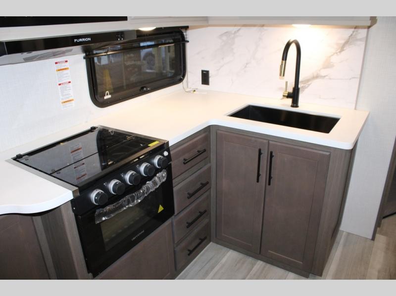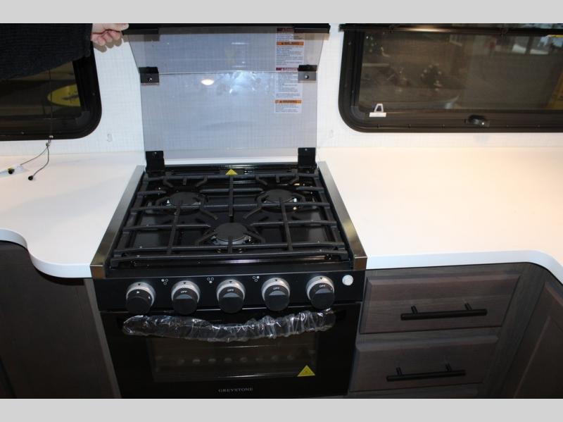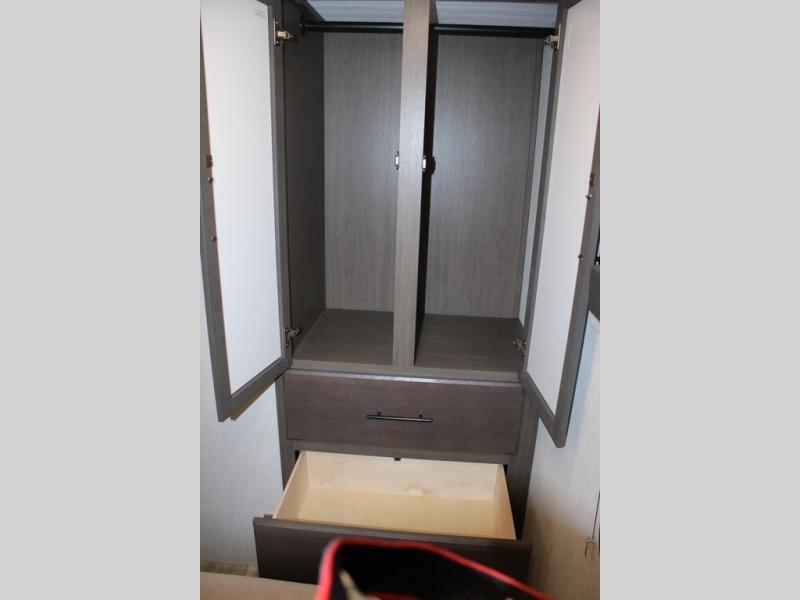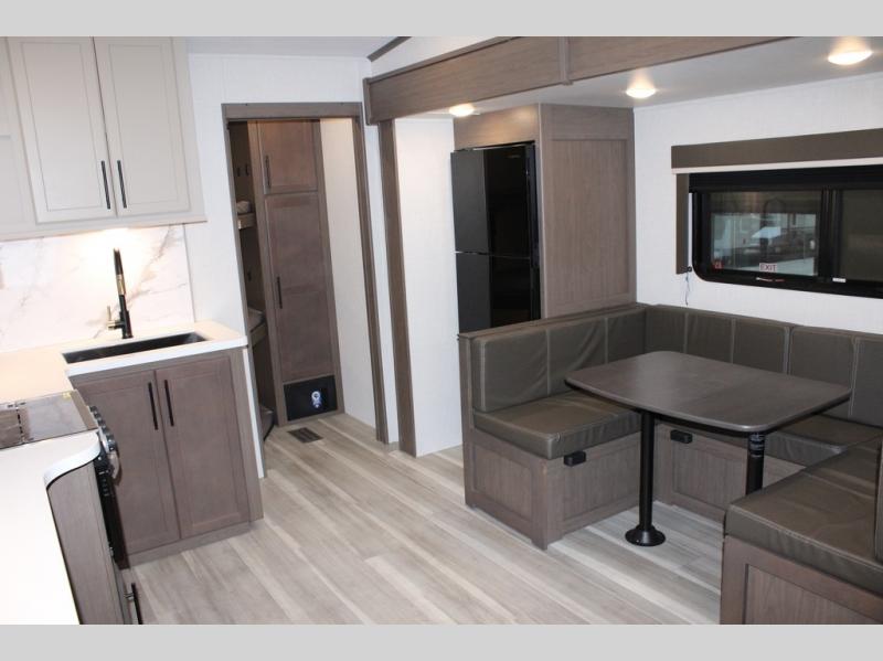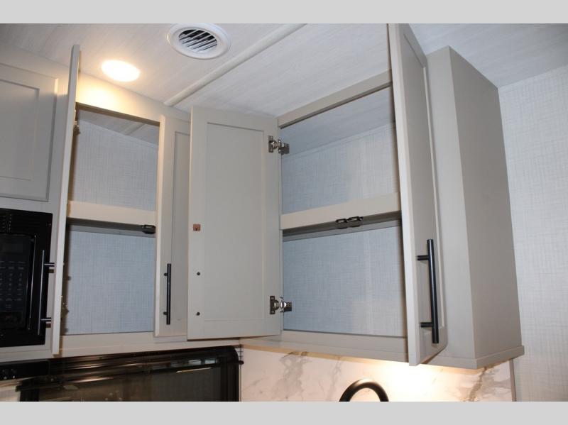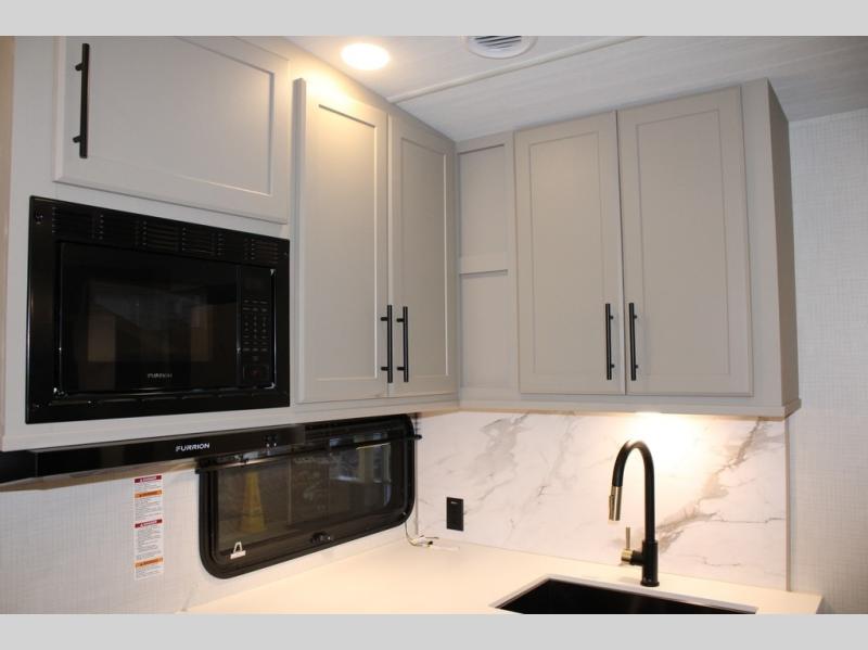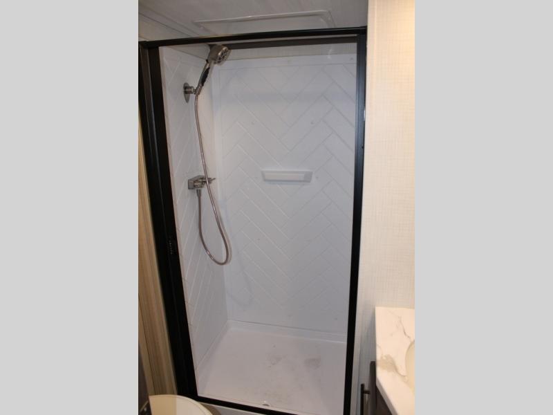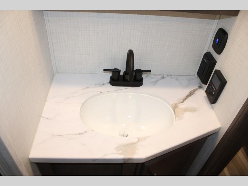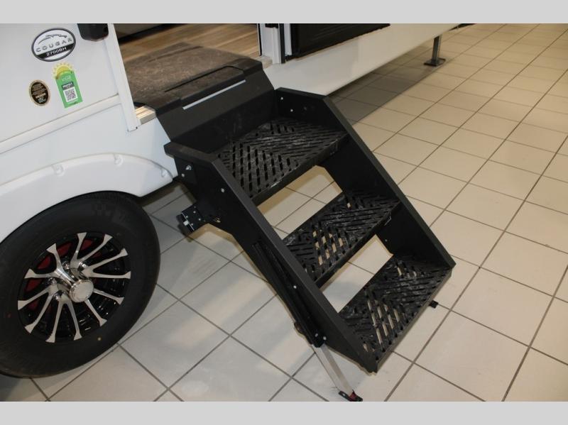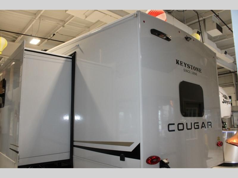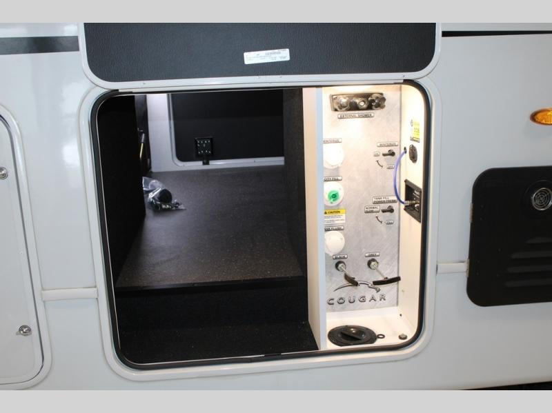 The Cougar Sport structural I-beam frame with stamped steel cross-members and outriggers, plus its AlphaPly roof membrane are what active RVers love about the construction of the Cougar line. The Cougar Sport models are no exception when it comes to a great package, as well as being smaller and lighter weight than their big brother Cougar models. A one-piece, heated and enclosed polypropylene underbelly will add protection against the elements, and the electric stabilizer jacks will provide more stability. On the inside, residential shaker style hardwood cabinet doors and decorative crown molding, plus seamless pressed countertops and an on-demand water heater will make your unit feel even more like home. You are also sure to appreciate the shiplap style decorative accent wall behind the bed, a porcelain foot flush toilet in the bathroom, plus residential kitchen hardware, and so much more.