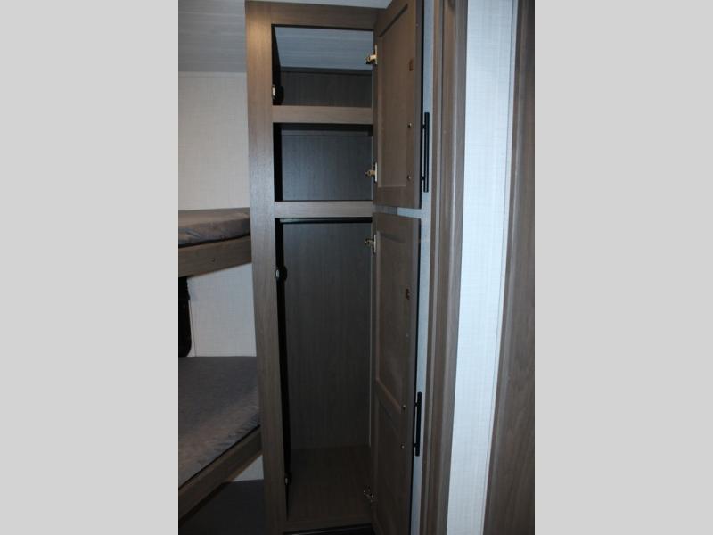 This lightweight Cougar Sport bunk model features sleeping for ten or more with triple stacked bed bunks in the rear bunkhouse, a large U-shaped dinette that can be transformed into sleep space, as well as a tri-fold sofa sleeper and a queen bed in the private bedroom up front. A fully equipped kitchen with an overhead microwave, a three burner range, and large sink plus storage will make it easy to keep everyone fed and happy. A 10.4 Cu. Ft. 12 volt refrigerator will keep all of your perishable items fresh, and there are plenty of cabinets for storing snacks and dry goods as well. Head up the steps to the bathroom featuring a shower with a skylight, sink with an overhead medicine cabinet, and toilet. The private front bedroom takes you away from the hustle and bustle of the main living area and bunkhouse to provide a relaxing retreat including a comfy queen bed, dual nightstands and a wardrobe for clothes!