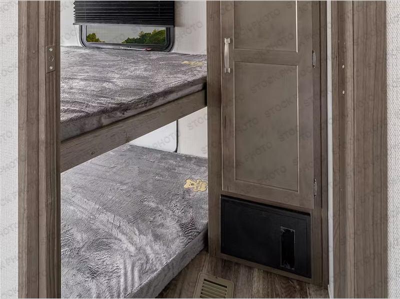 This lightweight Cougar Sport bunk model features sleeping for ten or more with triple stacked double bed bunks in the rear bunk room, a large U-shaped dinette that can be transformed into sleep space, as well as a tri-fold sofa sleeper and a queen bed in the private bedroom up front. The U-shaped dinette will seat quite a few of you for meals and even game time, plus the sofa is nearby for even more to kick back on. A fully equipped kitchen with overhead microwave, a three burner range, and large sink plus storage will make it easy to keep everyone fed and happy. A 10.4 Cu. Ft. 12 volt refrigerator will keep all of your perishable items fresh, and there are plenty of cabinets for storing snacks and dry goods as well. Head up the steps to the bathroom featuring a shower with a skylight, sink with overhead medicine cabinet, and toilet. The private front bedroom takes you away from the hustle and bustle of the main living area and bunkhouse to provide a relaxing retreat including a comfy queen bed, dual nightstands and shirt wardrobes as well as an additional wardrobe along the interior wall for even more storage.
