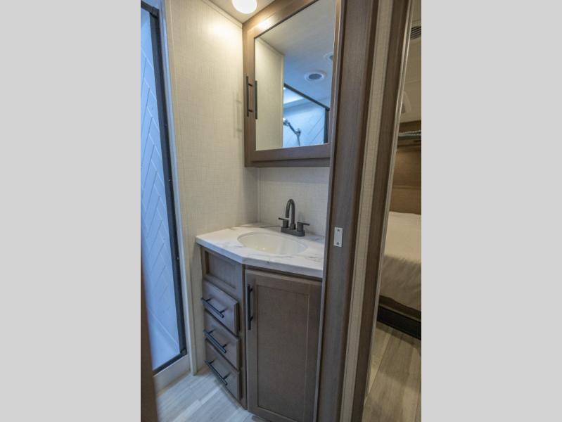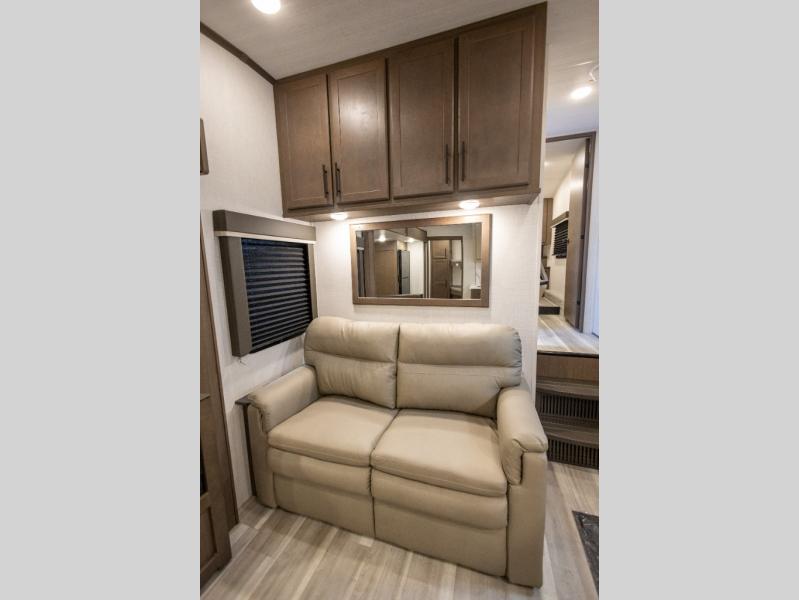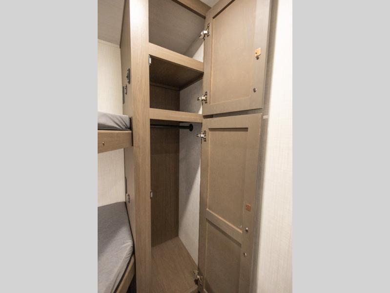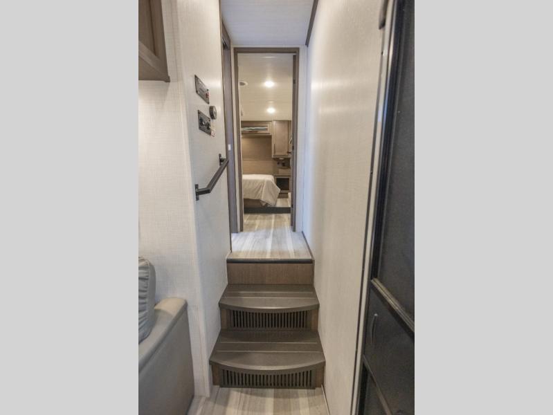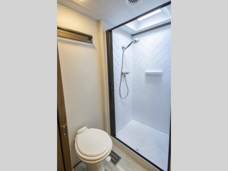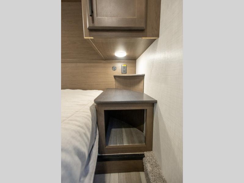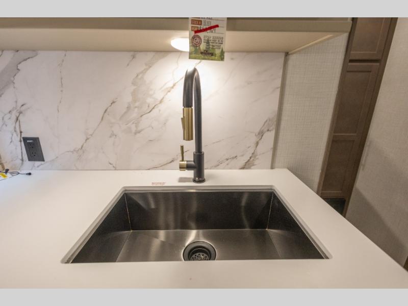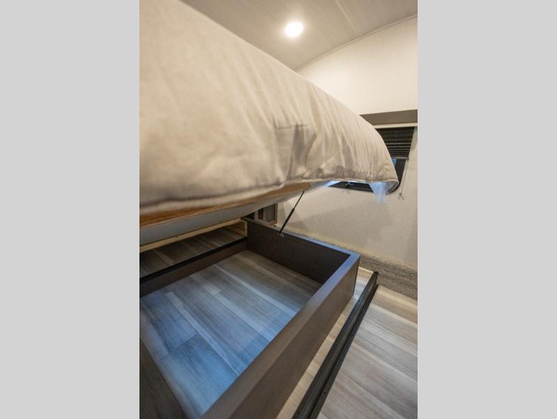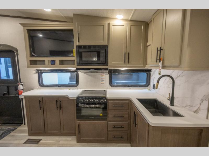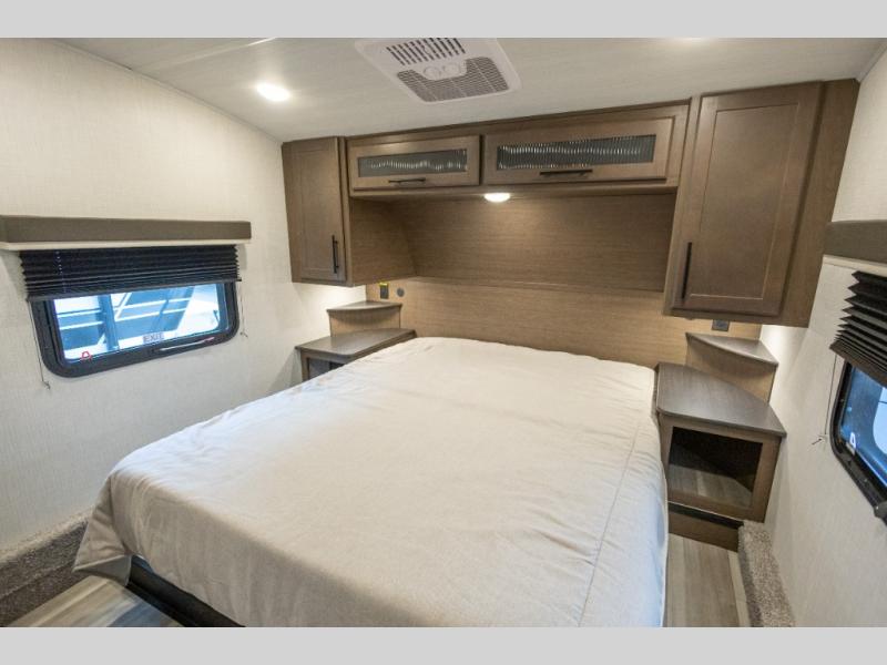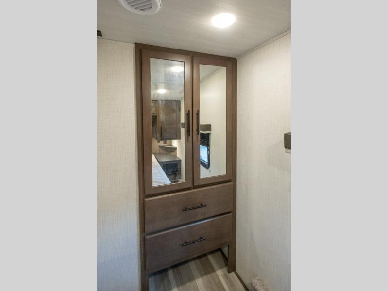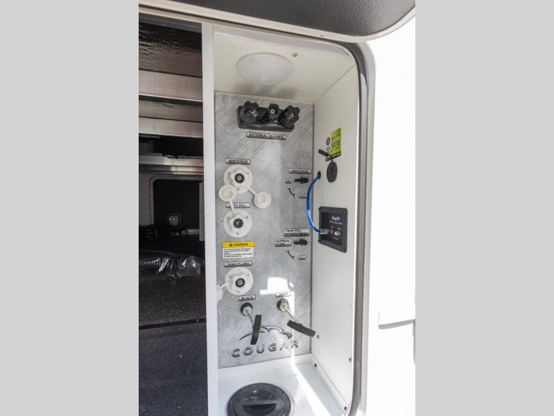The Cougar Sport structural I-beam frame with stamped steel cross-members and outriggers, plus its AlphaPly roof membrane are what active RVers love about the construction of the Cougar line. The Cougar Sport models are no exception when it comes to a great package, as well as being smaller and lighter weight than their big brother Cougar models. A one-piece, heated and enclosed polypropylene underbelly will add protection against the elements, and the electric stabilizer jacks will provide more stability. On the inside, residential shaker style hardwood cabinet doors and decorative crown molding, plus seamless pressed countertops and an on-demand water heater will make your unit feel even more like home. You are also sure to appreciate the shiplap style decorative accent wall behind the bed, a porcelain foot flush toilet in the bathroom, plus residential kitchen hardware, and so much more.