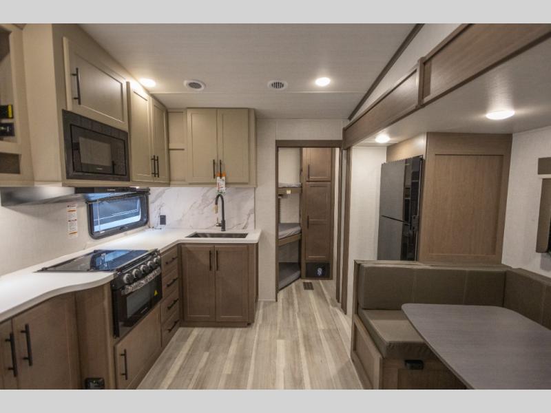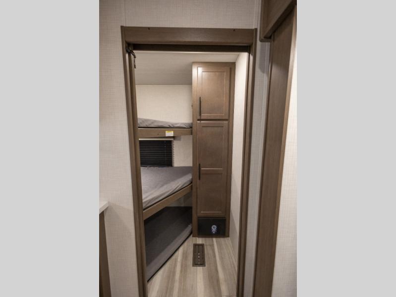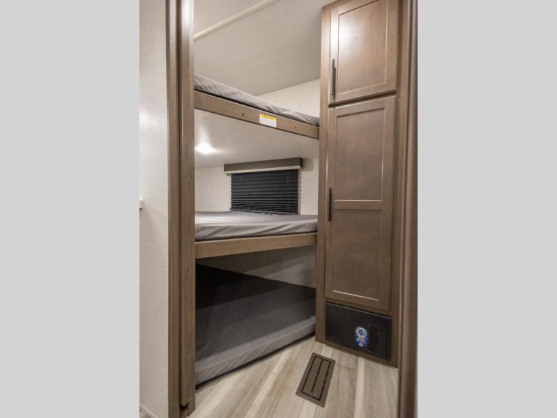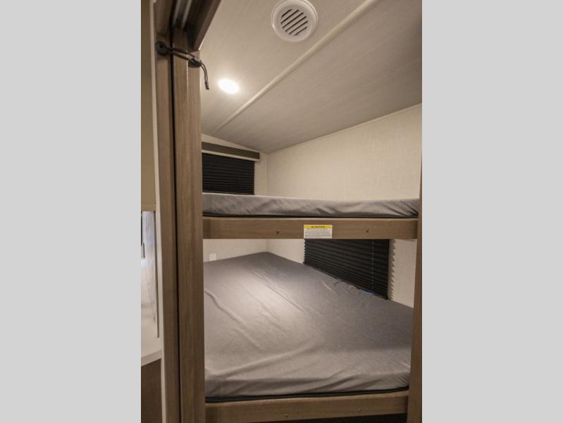 This lightweight Cougar Sport bunk model features sleeping for ten or more with triple stacked bed bunks in the rear bunkhouse, a large U-shaped dinette that can be transformed into sleep space, as well as a tri-fold sofa sleeper and a queen bed in the private bedroom up front. A fully equipped kitchen with an overhead microwave, a three burner range, and large sink plus storage will make it easy to keep everyone fed and happy. A 10.4 Cu. Ft. 12 volt refrigerator will keep all of your perishable items fresh, and there are plenty of cabinets for storing snacks and dry goods as well. Head up the steps to the bathroom featuring a shower with a skylight, sink with an overhead medicine cabinet, and toilet. The private front bedroom takes you away from the hustle and bustle of the main living area and bunkhouse to provide a relaxing retreat including a comfy queen bed, dual nightstands and a wardrobe for clothes!