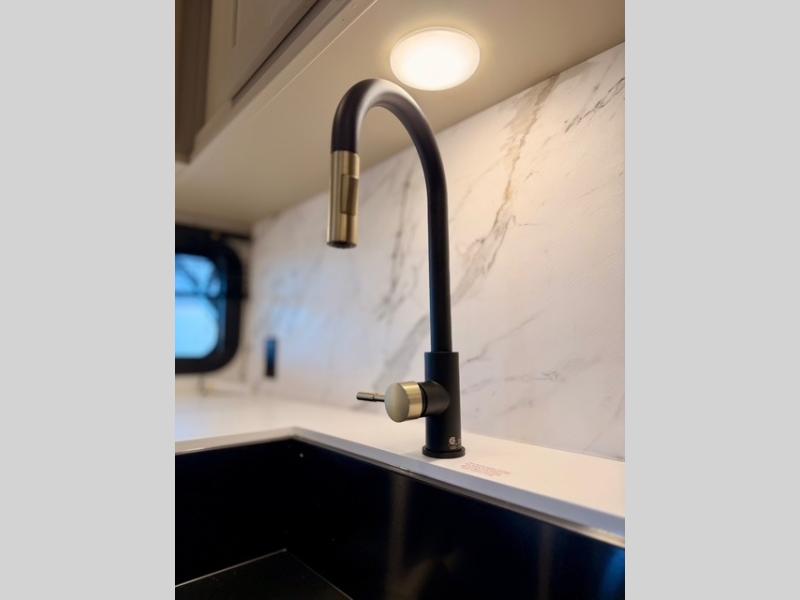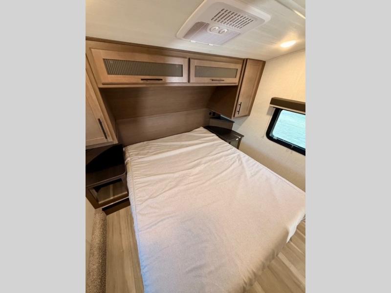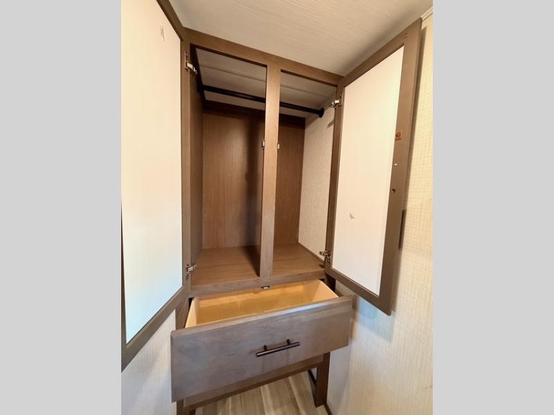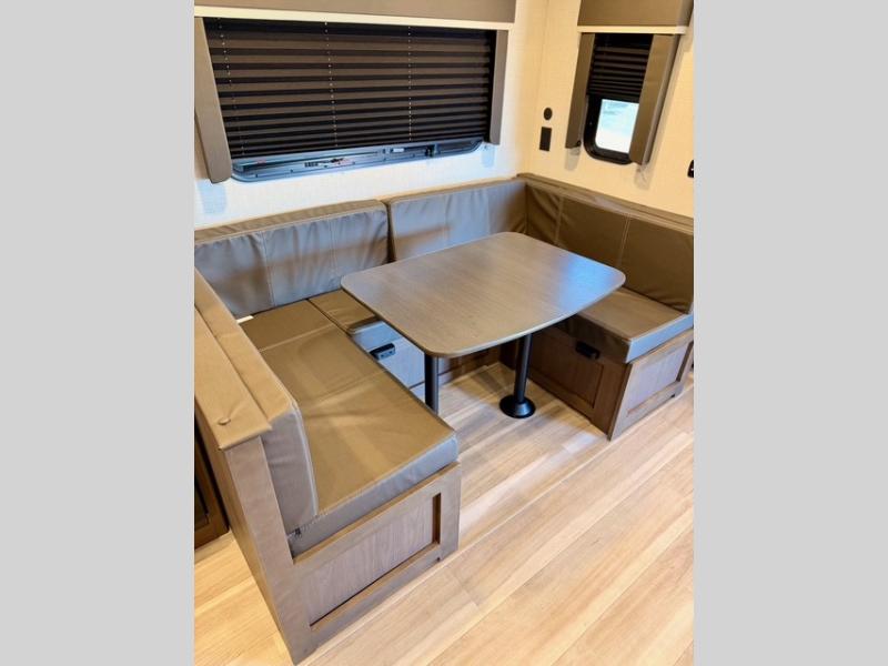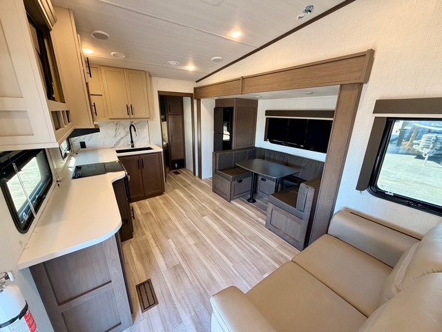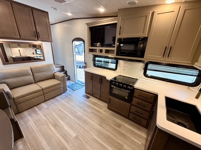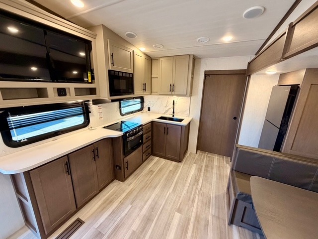 The fully equipped kitchen makes mealtime simple, whether you’re preparing quick breakfasts or hearty dinners after a day outdoors. You’ll find an overhead microwave, a three-burner range, a large sink, and ample counter space for prep work. The 10.4 cu. ft. 12-volt refrigerator keeps perishables fresh, while generous cabinet storage ensures snacks, cookware, and dry goods are neatly organized. The open layout allows everyone to gather comfortably without feeling cramped.