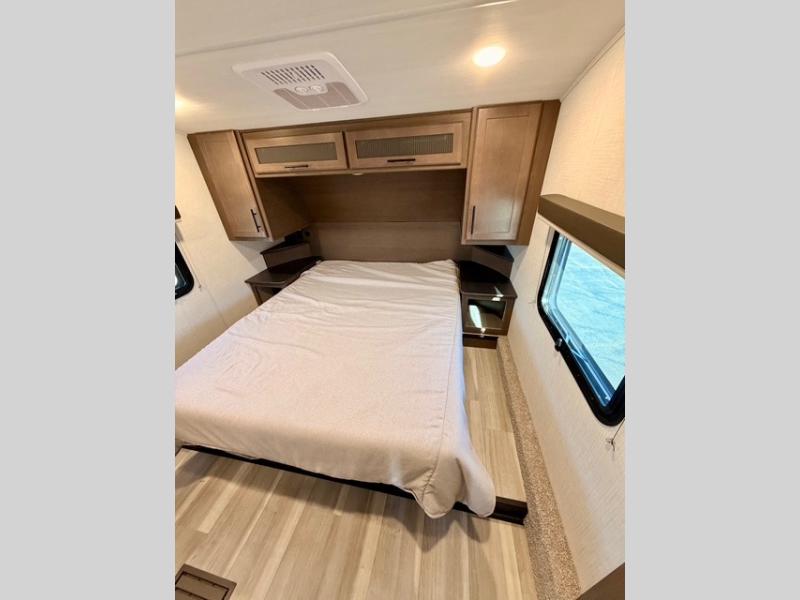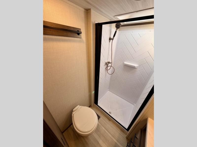 Inside, residential shaker-style hardwood cabinet doors, decorative crown molding, and seamless pressed countertops give the interior a polished look. An on-demand water heater ensures you’ll have hot water when you need it, while the shiplap-style decorative accent wall behind the bed adds a modern touch. Residential kitchen hardware, upgraded lighting, and thoughtful storage throughout make this smaller, lighter-weight Cougar Sport feel like a true home away from home.