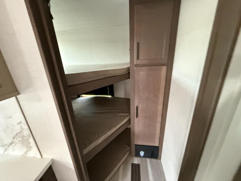 This lightweight Cougar Sport bunk model features sleeping for ten or more with triple stacked bed bunks in the rear bunkhouse, a large U-shaped dinette that can be transformed into sleep space, as well as a tri-fold sofa sleeper and a queen bed in the private bedroom up front. A fully equipped kitchen with an overhead microwave, a three burner range, and large sink plus storage will make it easy to keep everyone fed and happy. A 10.4 Cu. Ft. 12 volt refrigerator will keep all of your perishable items fresh, and there are plenty of cabinets for storing snacks and dry goods as well. Head up the steps to the bathroom featuring a shower with a skylight, sink with an overhead medicine cabinet, and toilet. The private front bedroom takes you away from the hustle and bustle of the main living area and bunkhouse to provide a relaxing retreat including a comfy queen bed, dual nightstands and a wardrobe for clothes!