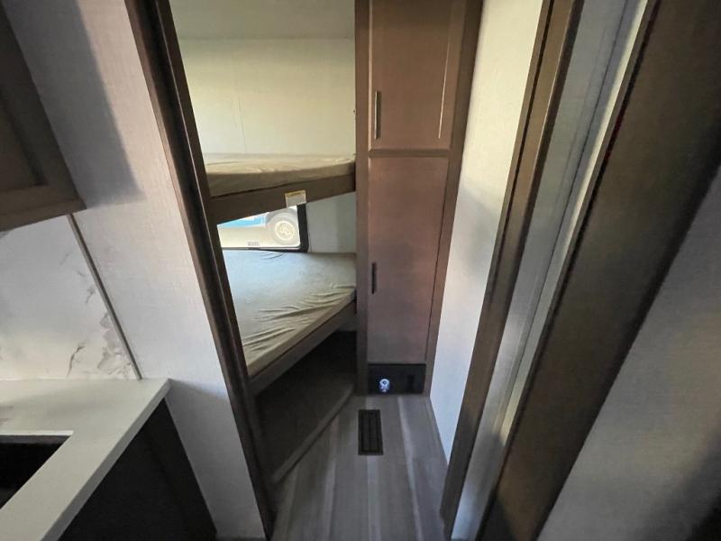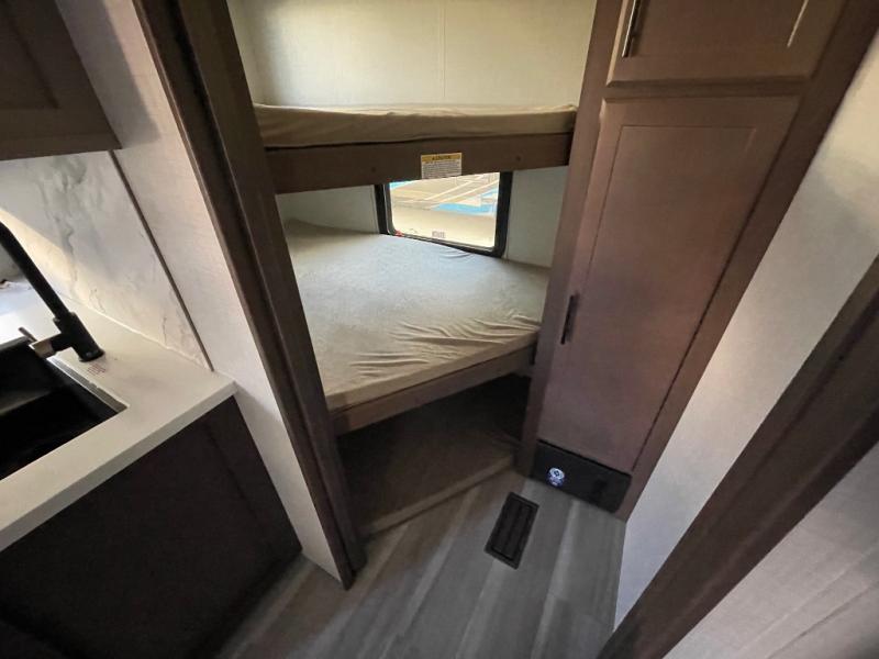 This lightweight Cougar Sport bunk model features sleeping for ten or more with triple stacked bed bunks in the rear bunkhouse, a large U-shaped dinette that can be transformed into sleep space, as well as a tri-fold sofa sleeper and a queen bed in the private bedroom up front. A fully equipped kitchen with an overhead microwave, a three burner range, and large sink plus storage will make it easy to keep everyone fed and happy. A 10.4 Cu. Ft. 12 volt refrigerator will keep all of your perishable items fresh, and there are plenty of cabinets for storing snacks and dry goods as well. Head up the steps to the bathroom featuring a shower with a skylight, sink with an overhead medicine cabinet, and toilet. The private front bedroom takes you away from the hustle and bustle of the main living area and bunkhouse to provide a relaxing retreat including a comfy queen bed, dual nightstands and a wardrobe for clothes!