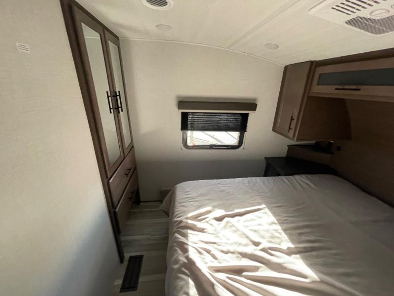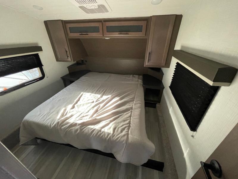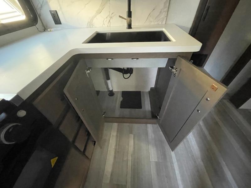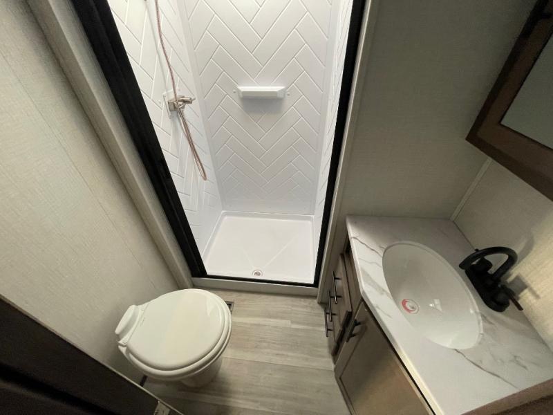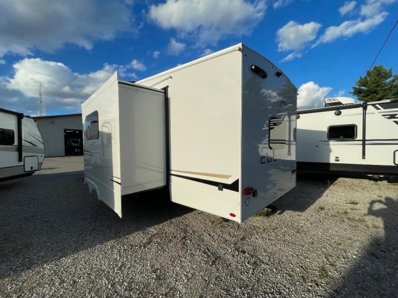 The Cougar Sport structural I-beam frame with stamped steel cross-members and outriggers, plus its AlphaPly roof membrane are what active RVers love about the construction of the Cougar line. The Cougar Sport models are no exception when it comes to a great package, as well as being smaller and lighter weight than their big brother Cougar models. A one-piece, heated and enclosed polypropylene underbelly will add protection against the elements, and the electric stabilizer jacks will provide more stability. On the inside, residential shaker style hardwood cabinet doors and decorative crown molding, plus seamless pressed countertops and an on-demand water heater will make your unit feel even more like home. You are also sure to appreciate the shiplap style decorative accent wall behind the bed, a porcelain foot flush toilet in the bathroom, plus residential kitchen hardware, and so much more.