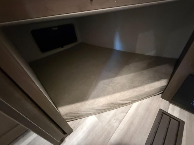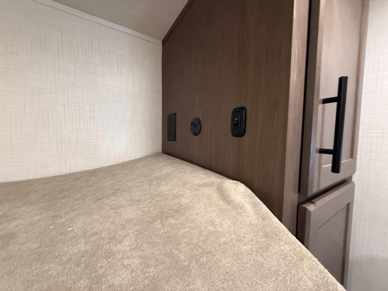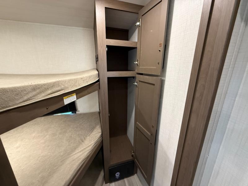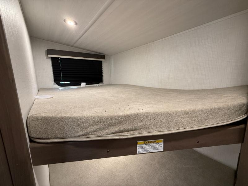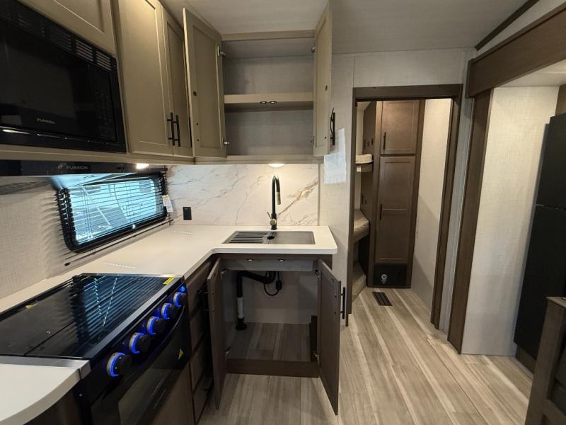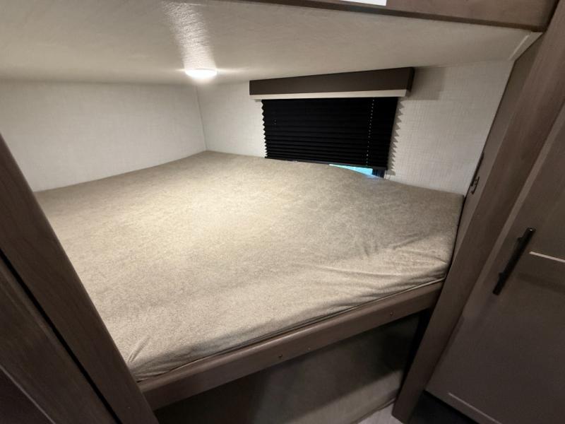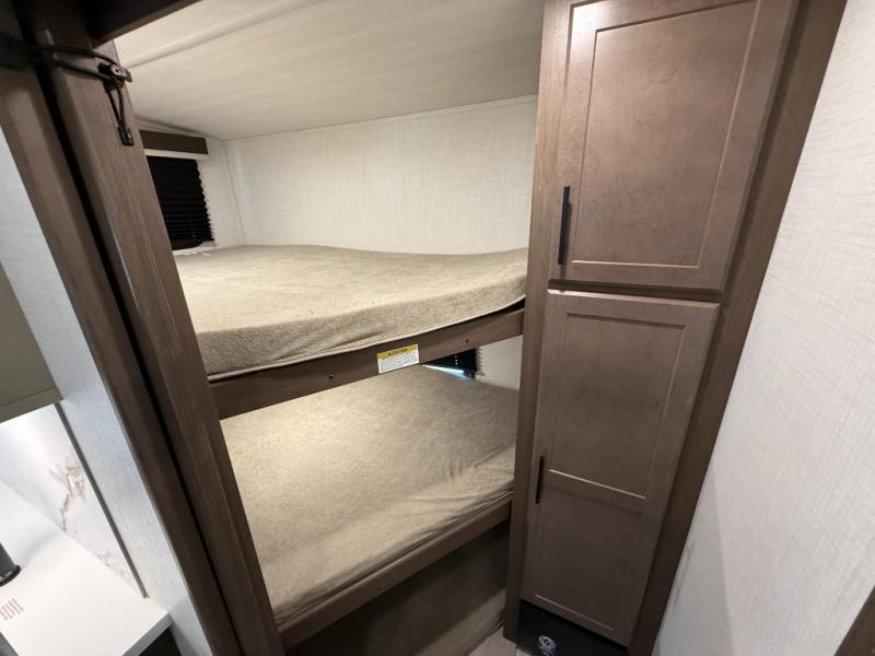 This lightweight Cougar Sport bunk model features sleeping for ten or more with triple stacked bed bunks in the rear bunkhouse, a large U-shaped dinette that can be transformed into sleep space, as well as a tri-fold sofa sleeper and a queen bed in the private bedroom up front. A fully equipped kitchen with an overhead microwave, a three burner range, and large sink plus storage will make it easy to keep everyone fed and happy. A 10.4 Cu. Ft. 12 volt refrigerator will keep all of your perishable items fresh, and there are plenty of cabinets for storing snacks and dry goods as well. Head up the steps to the bathroom featuring a shower with a skylight, sink with an overhead medicine cabinet, and toilet. The private front bedroom takes you away from the hustle and bustle of the main living area and bunkhouse to provide a relaxing retreat including a comfy queen bed, dual nightstands and a wardrobe for clothes!