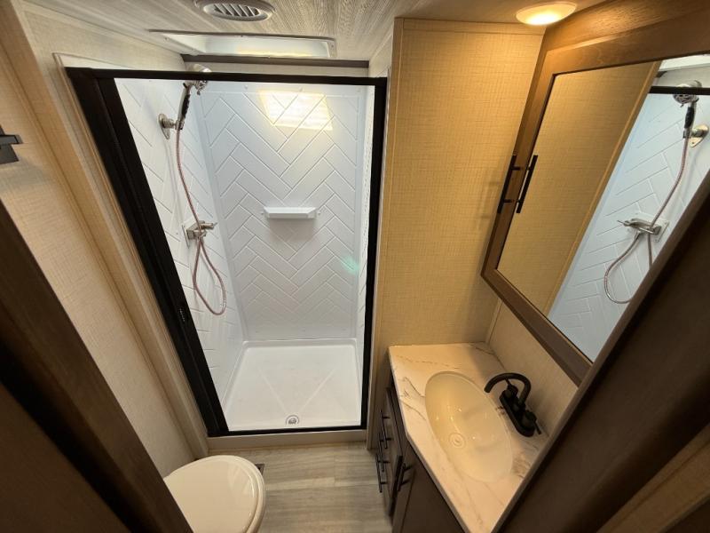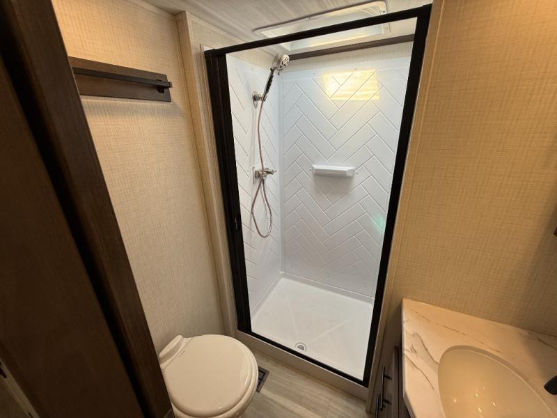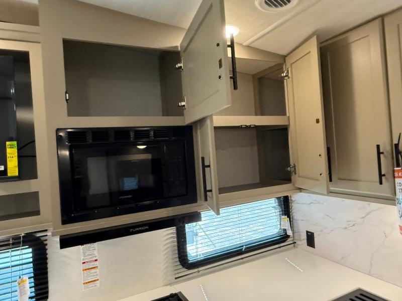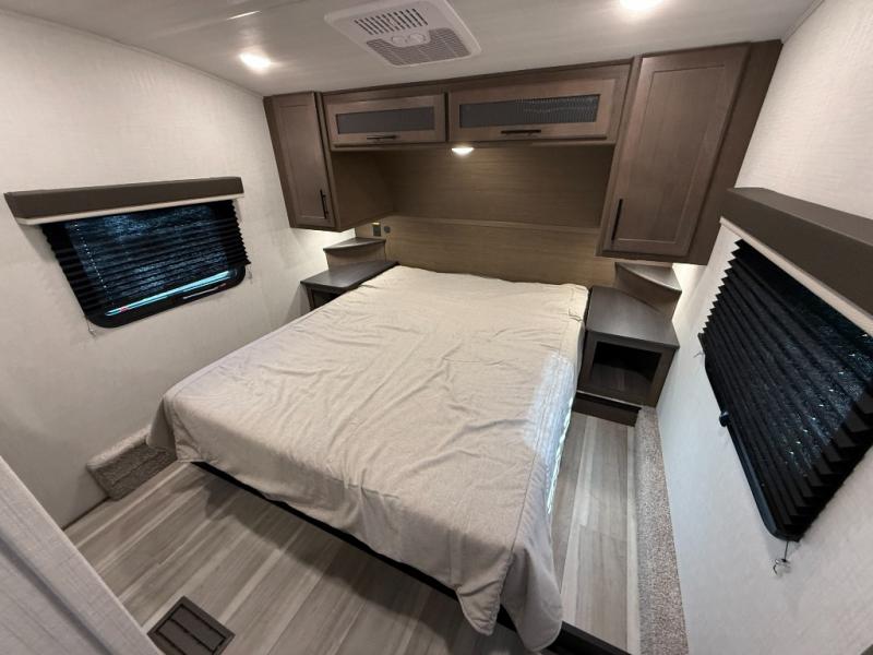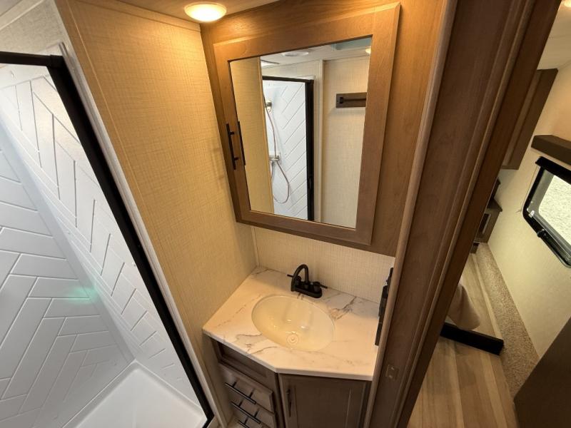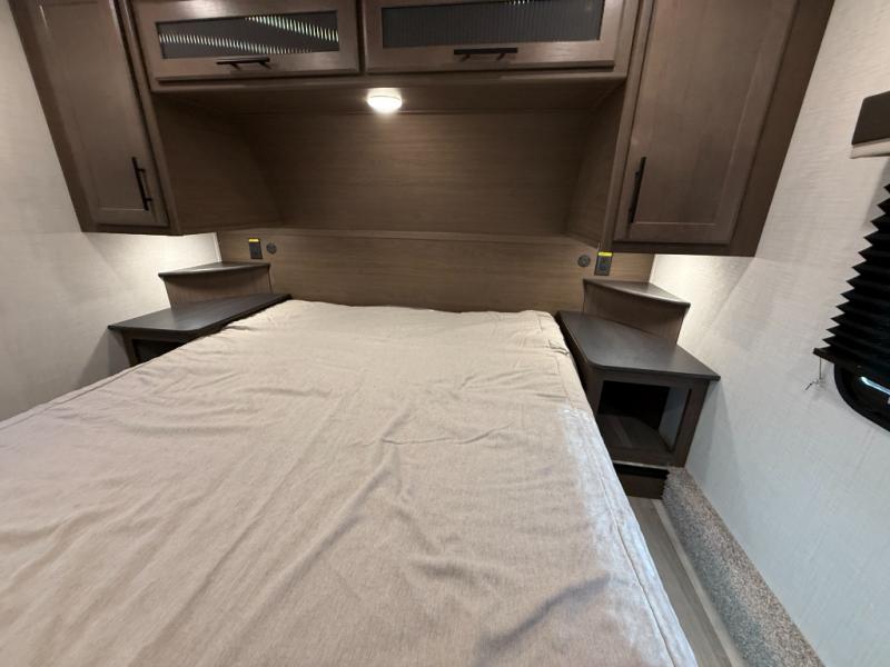 The Cougar Sport structural I-beam frame with stamped steel cross-members and outriggers, plus its AlphaPly roof membrane are what active RVers love about the construction of the Cougar line. The Cougar Sport models are no exception when it comes to a great package, as well as being smaller and lighter weight than their big brother Cougar models. A one-piece, heated and enclosed polypropylene underbelly will add protection against the elements, and the electric stabilizer jacks will provide more stability. On the inside, residential shaker style hardwood cabinet doors and decorative crown molding, plus seamless pressed countertops and an on-demand water heater will make your unit feel even more like home. You are also sure to appreciate the shiplap style decorative accent wall behind the bed, a porcelain foot flush toilet in the bathroom, plus residential kitchen hardware, and so much more.