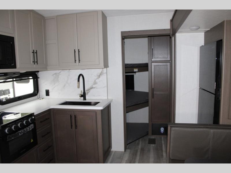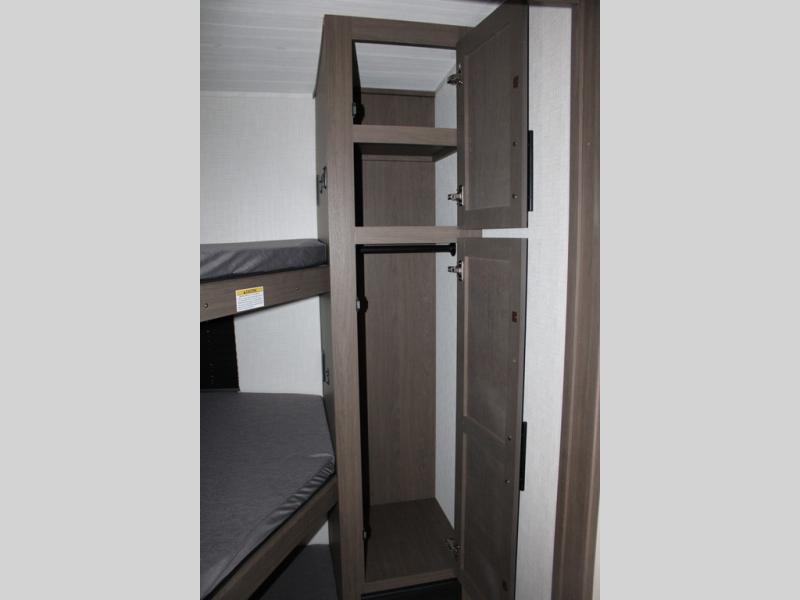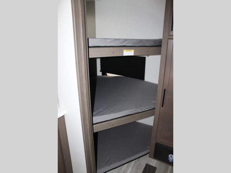 This lightweight Cougar Sport bunk model features sleeping for ten or more with triple stacked bed bunks in the rear bunkhouse, a large U-shaped dinette that can be transformed into sleep space, as well as a tri-fold sofa sleeper and a queen bed in the private bedroom up front. A fully equipped kitchen with an overhead microwave, a three burner range, and large sink plus storage will make it easy to keep everyone fed and happy. A 10.4 Cu. Ft. 12 volt refrigerator will keep all of your perishable items fresh, and there are plenty of cabinets for storing snacks and dry goods as well. Head up the steps to the bathroom featuring a shower with a skylight, sink with an overhead medicine cabinet, and toilet. The private front bedroom takes you away from the hustle and bustle of the main living area and bunkhouse to provide a relaxing retreat including a comfy queen bed, dual nightstands and a wardrobe for clothes!